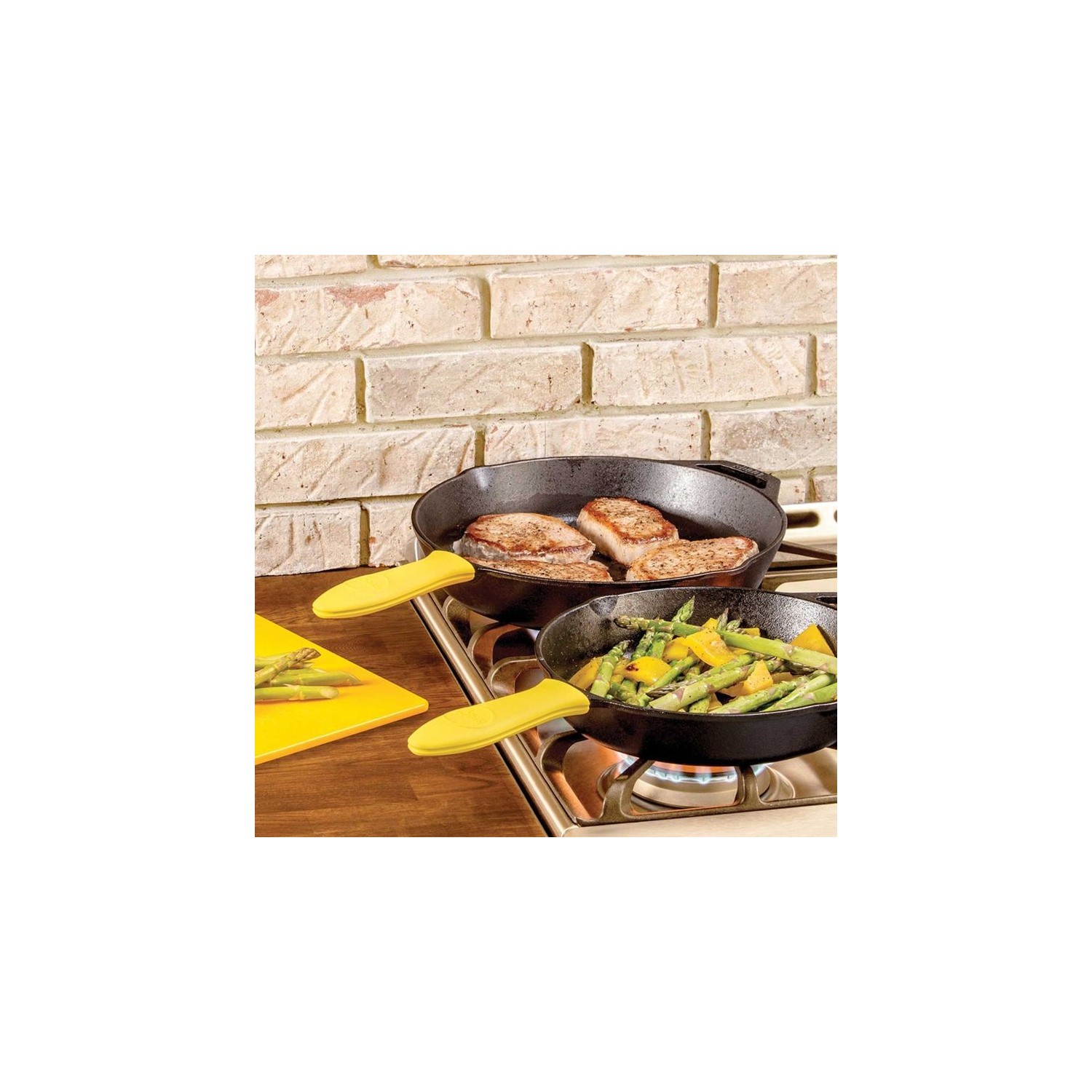 Orice vas de gatit din fonta are proprietatea de a se incinge foarte puternic in cursul procesului de gatire. Aceasta protectie din silicon de la Lodge, de culoare galbena, va ajuta sa va protejati mainile de contactul cu suprafata fierbinte si sa manevrati astfel mai usor vasele din fonta cu maner in care pregatitit mancarea. Ofera protectie pentru temperaturi de pana la 260 de grade Celsius. Acest suport de silicon are o aderenta ferma, oferind mai mult control asupra tigaii. Cand este timpul sa il curatati, suportul se indeparteaza cu usurinta de pe tigaie.