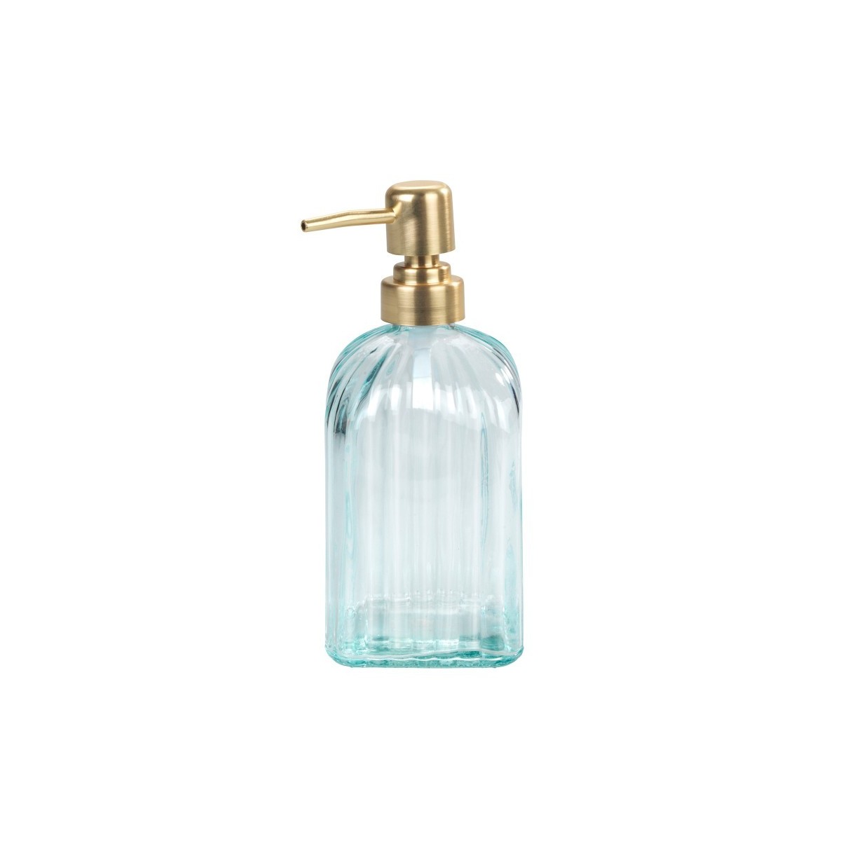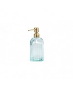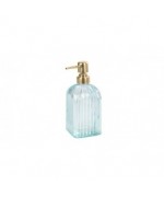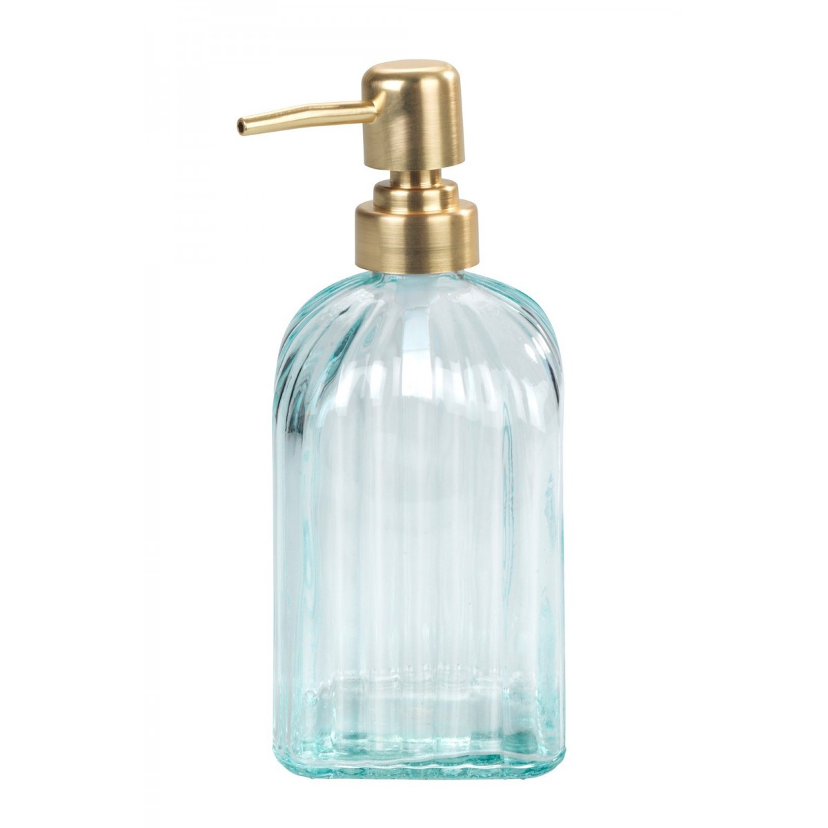 Stylish soap dispenser made of glass with relief and pump head in gold finish. Easy measuring of dish washing liquid and soap.