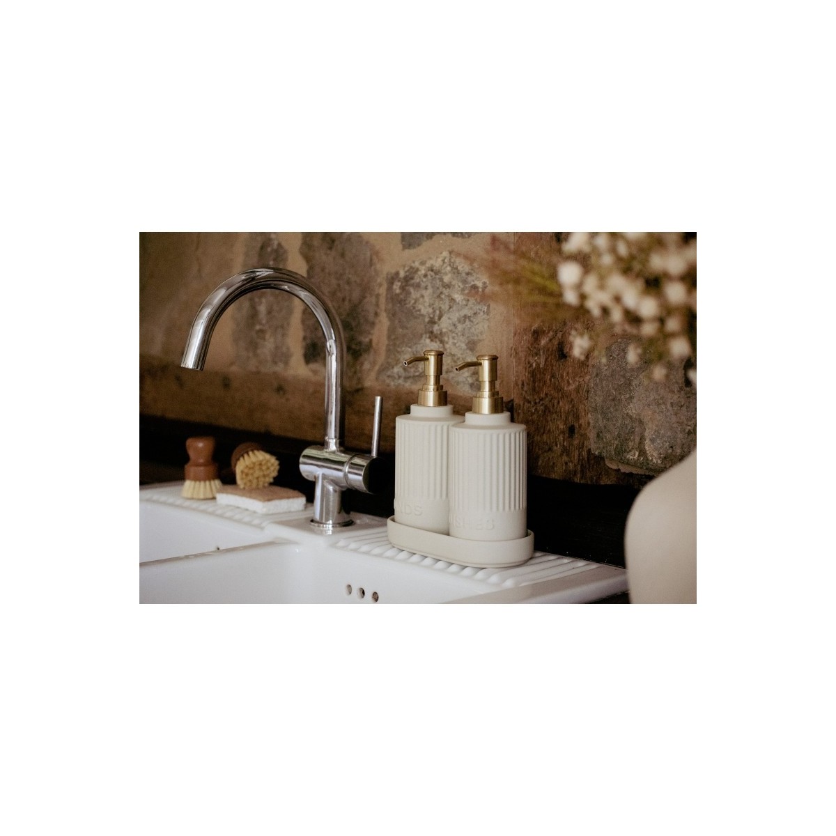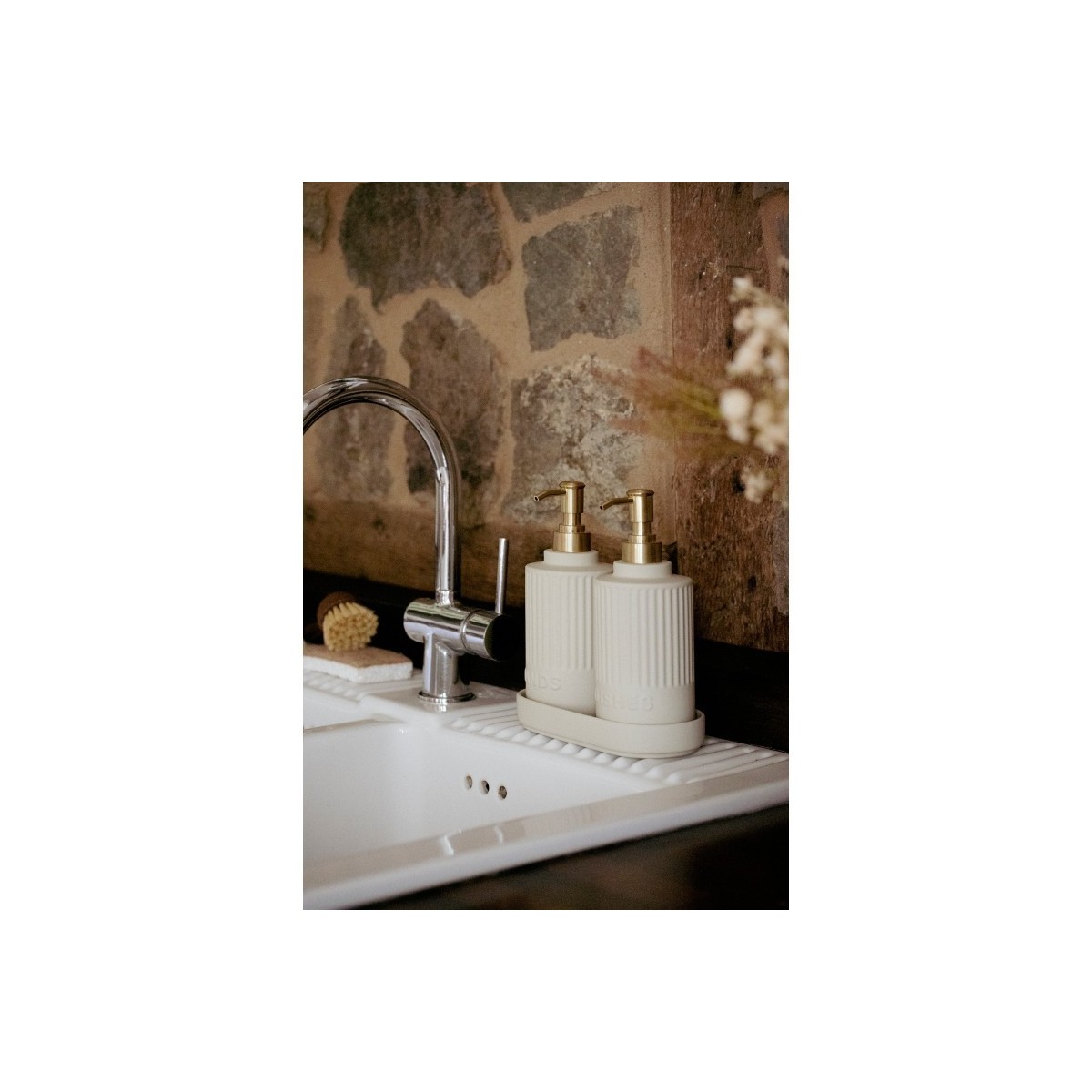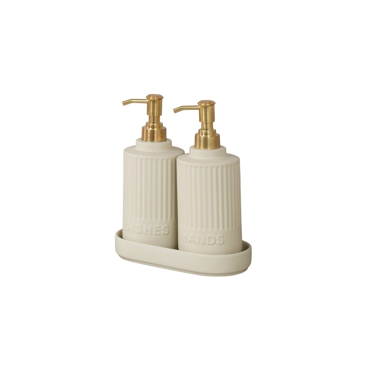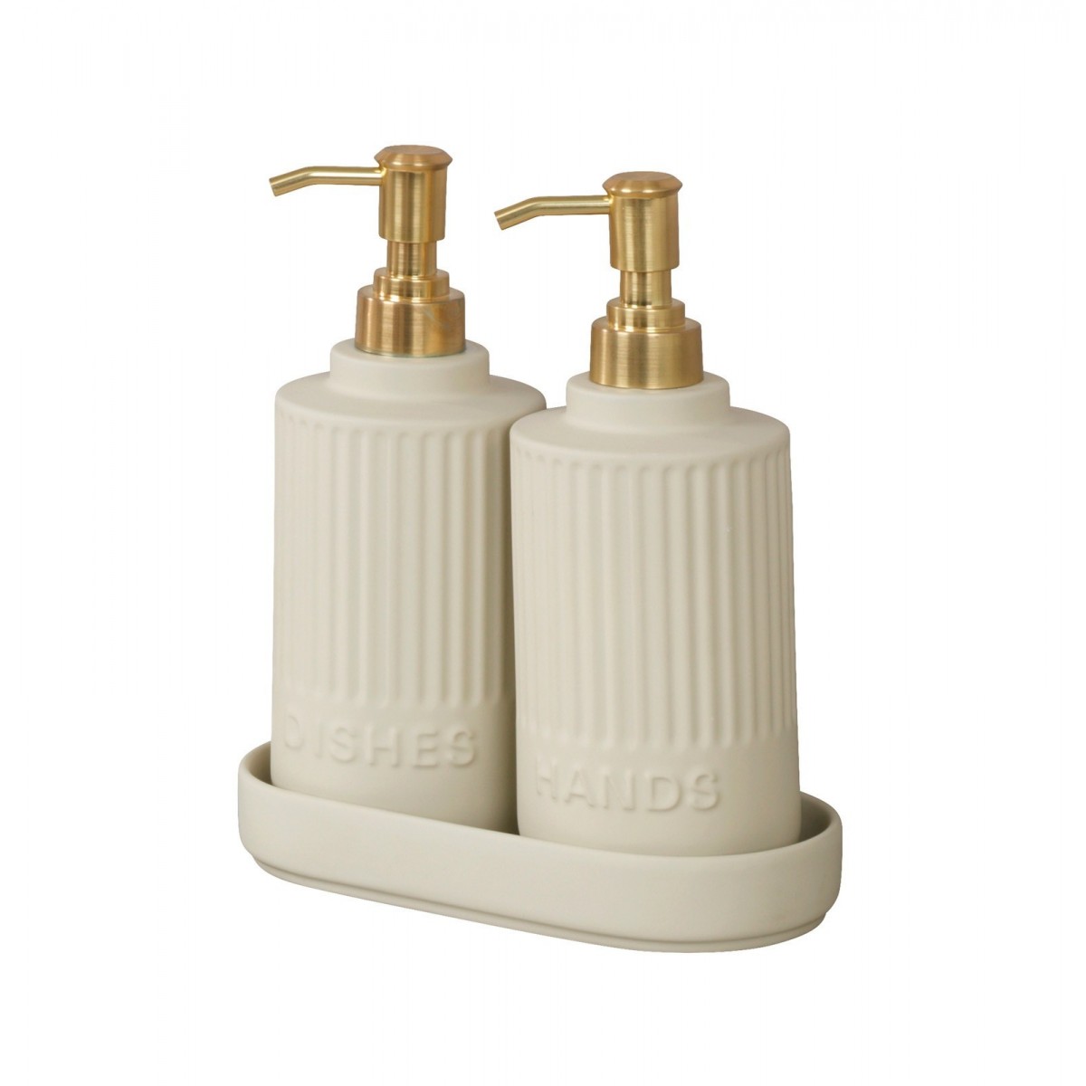 Rinsing station consisting of soap dispenser and washing-up liquid dispenser on a practical storage tray. Easy measuring of liquid soap and detergent by the pump heads in gold finish. Pleasant feel thanks to soft-touch surface.Washing-up liquid dispenser and soap dispenser with tray, creamMade of ceramic with a pleasant soft-touch surfacePump heads in matt gold look, made of plasticEasy dispensing of liquid soap and washing-up liquid, 550ml eachOverall dimensions (WxHxD): 19x21x10cm, each dispenser 18x17cm