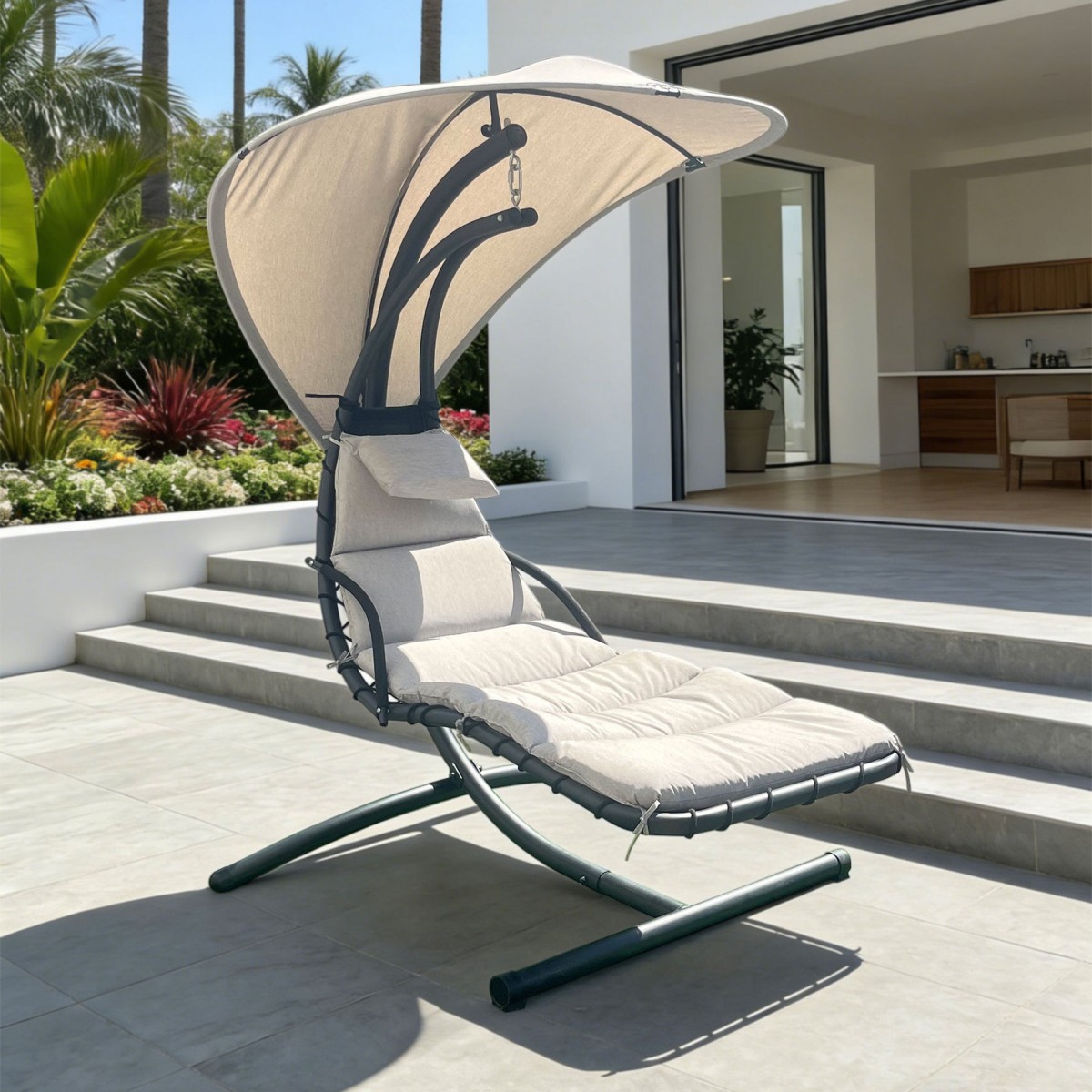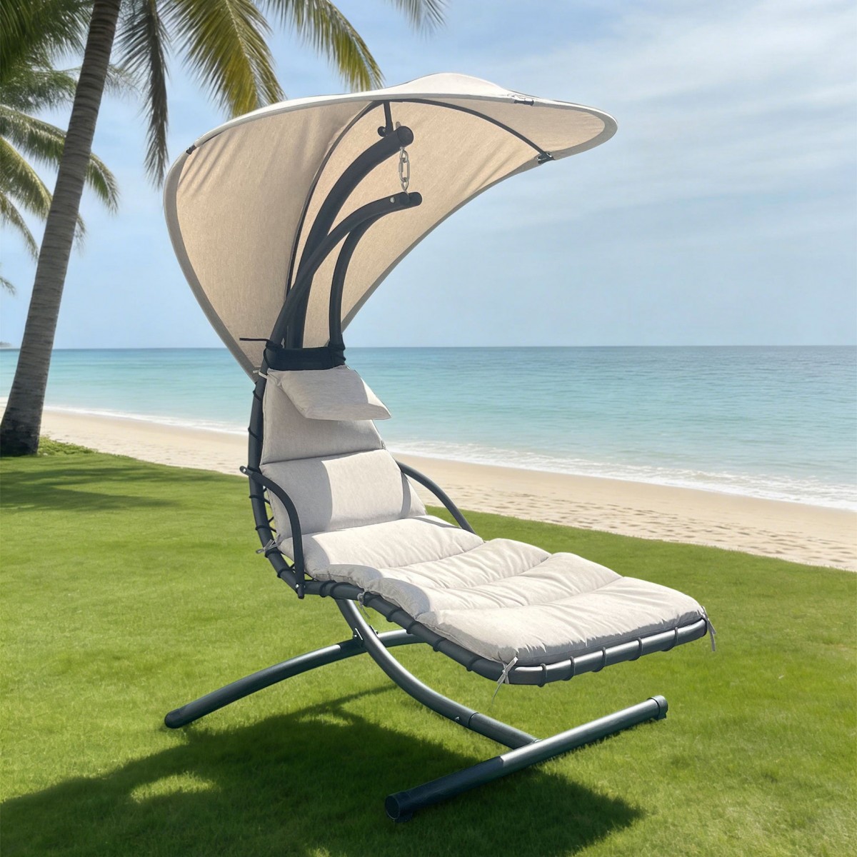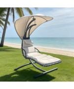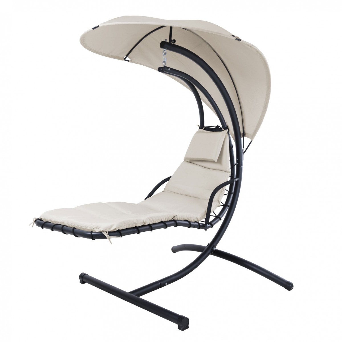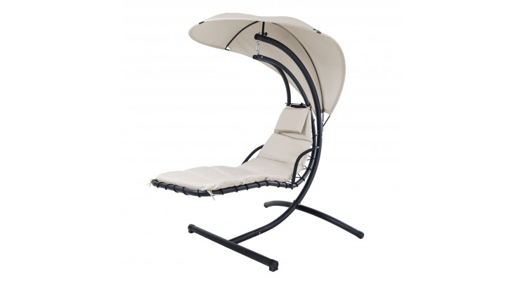 Realizat din structura solida de otel vopsita in camp electrostatic . Sezutul este realizat din textilina si include perna din poliester cu protectie impotriva umezelii si a razelor UV . Copertina este realizata din poliester cu protectie impotriva umezelii. Sustine 120kg.