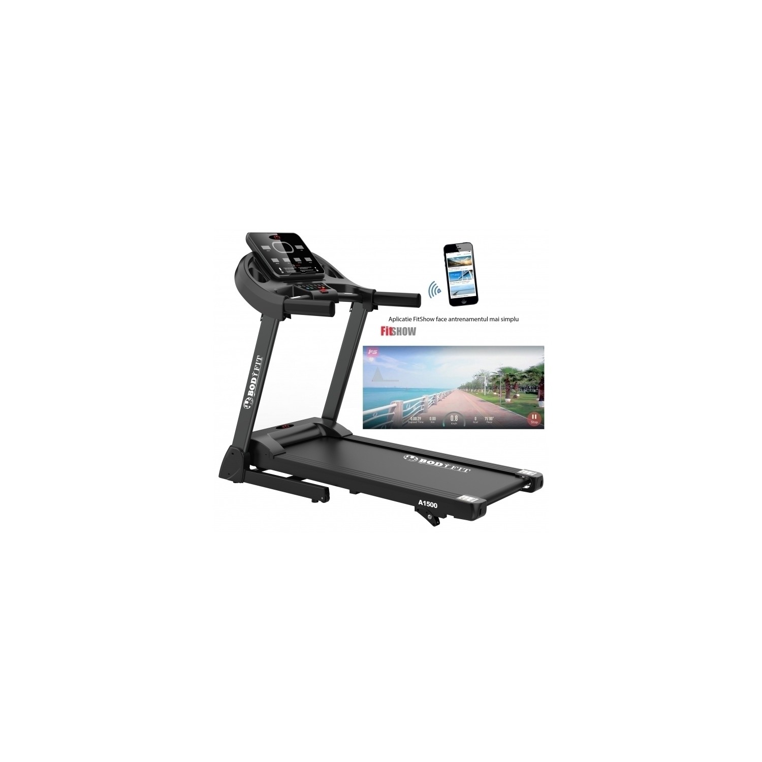 Banda de alergat electrica BodyFit A1500 dispune de posibilitatea de conectare prin bluetooth cu aplicatia FitShow, aplicatie ce o gasiti atat in App store cat si Googleplay.