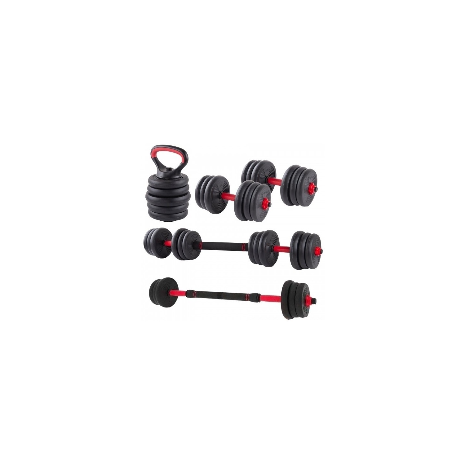 Setul este compus din 12 discuri de diferite greutati (vezi in descrierea de mai jos), 2 bare pt ganterele de maini ce pot avea o greutate de pana la 10 kg fiecare, o bara conectoare cu ajutorul careia puteti face o haltera sau puteti unii cele 2 gantere pt o haltera cu o greutate mai mare, suportul kettlebell ce va ajuta se creati o gantera kettlebell, 2 manere pt gantere tip kettlebell (ce pot fi facute atat cu bara de gantera normala cat si cu suportul kettlebell), si colierele pt fixarea greutatilor.