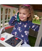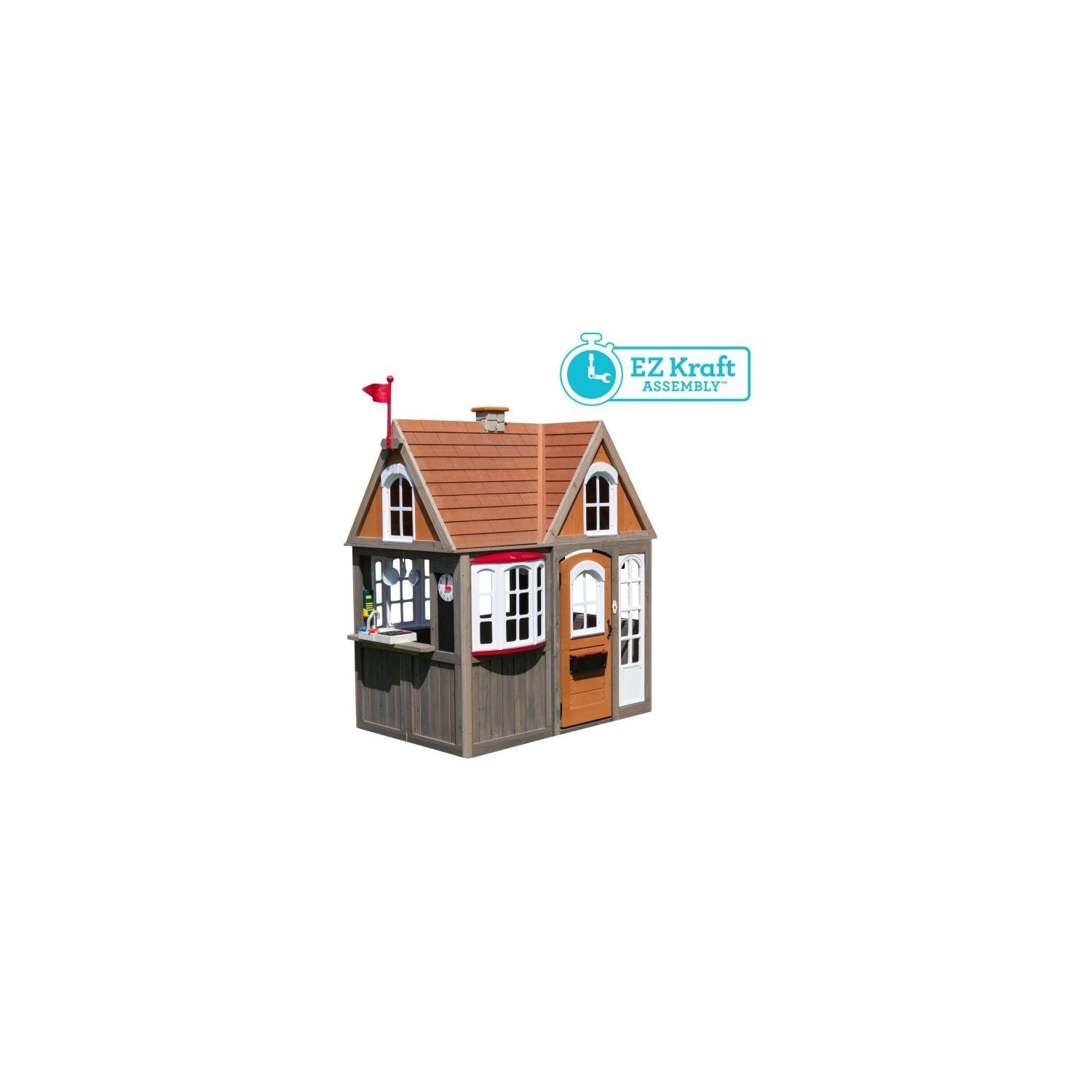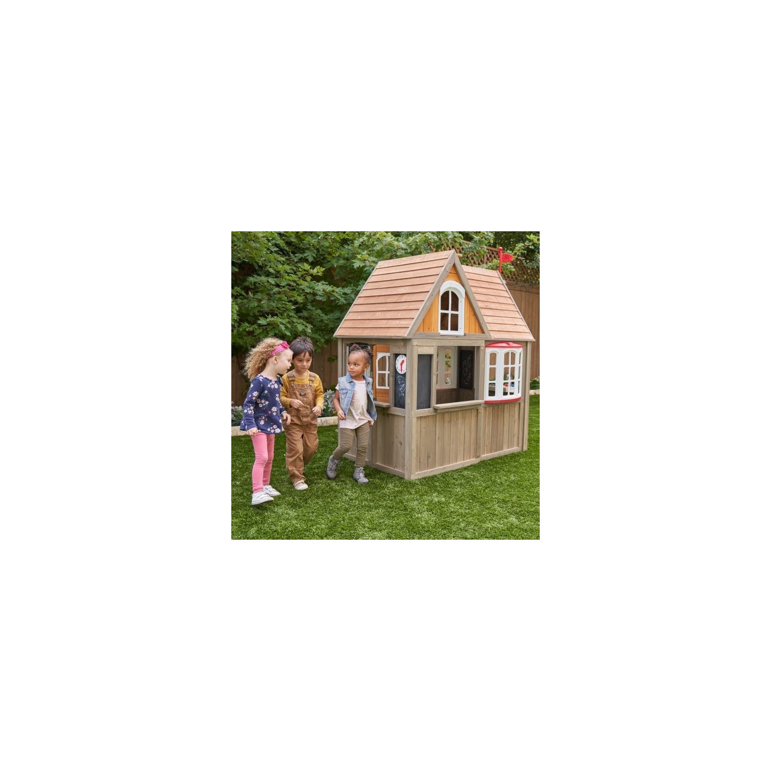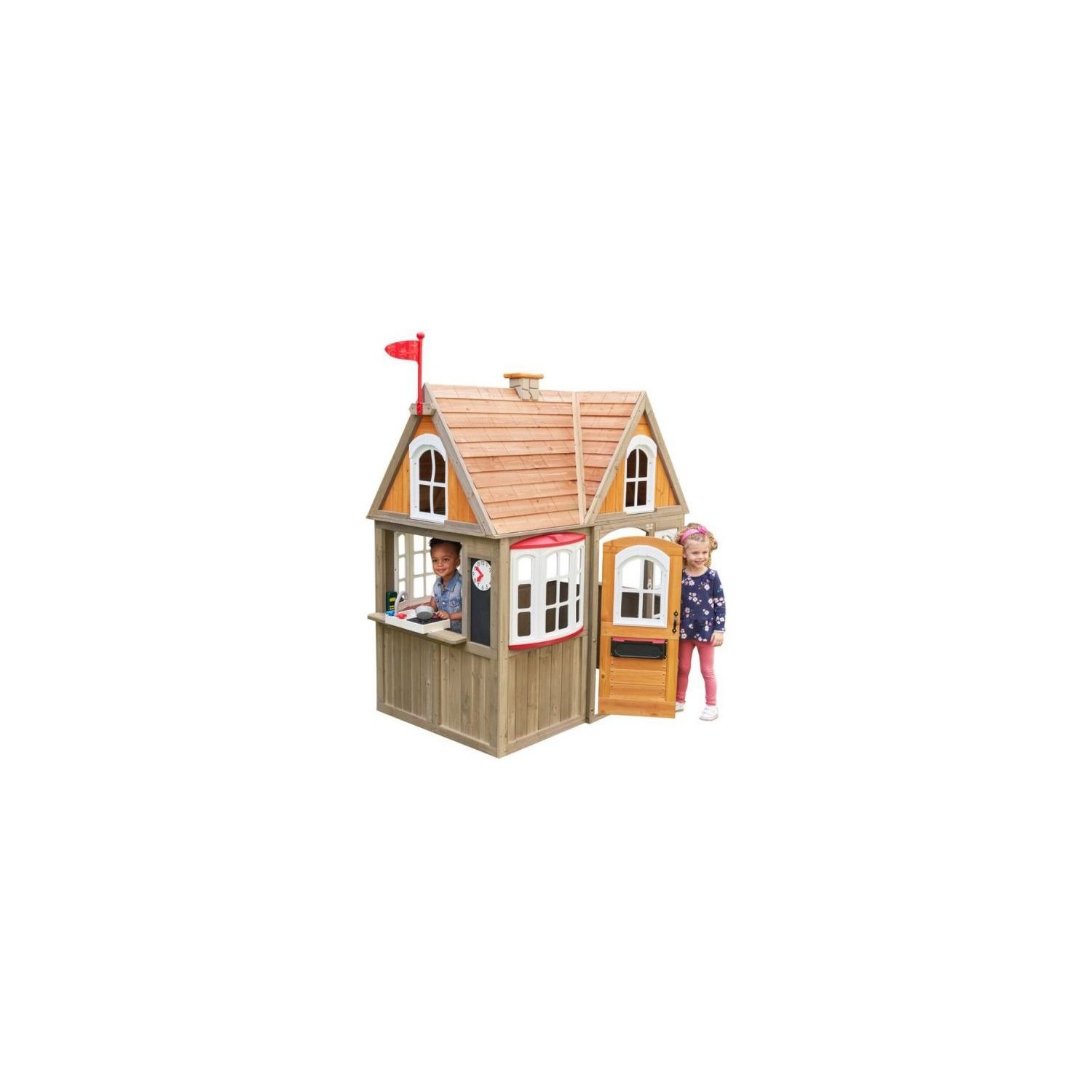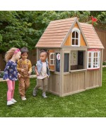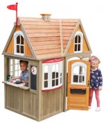 Casuta de joaca exterior din lemn pentru copii Greystone Cottage Playhouse Kidkrafteste din lemn tratat de cedru garantat, avand multiple forme de joaca.