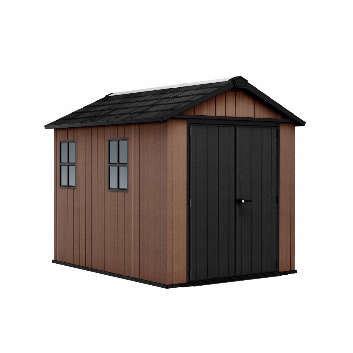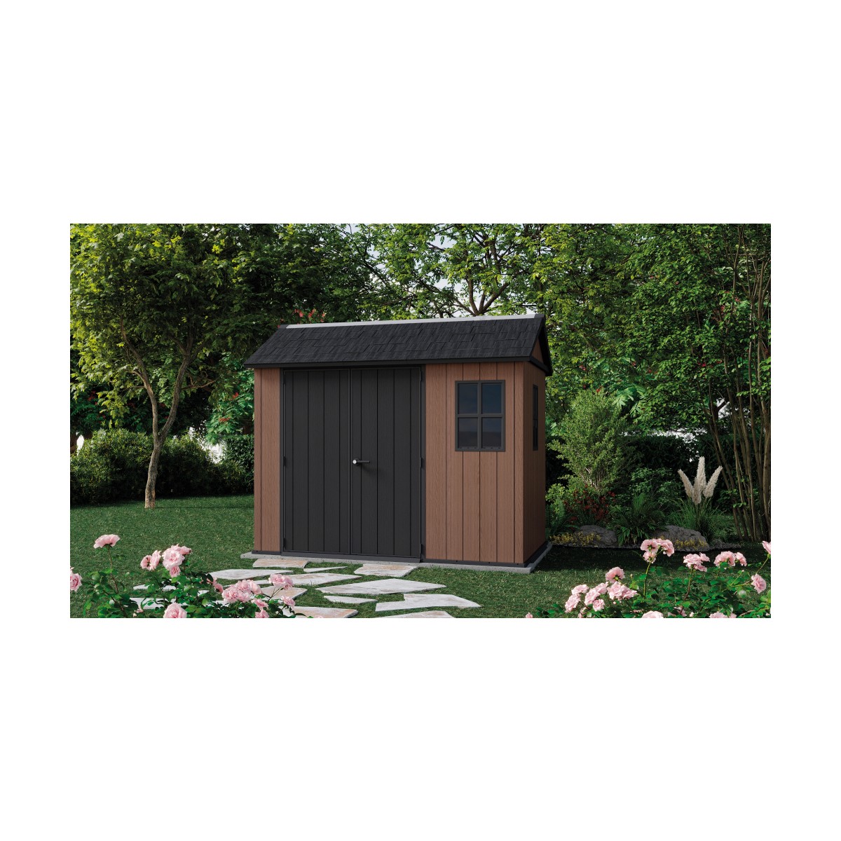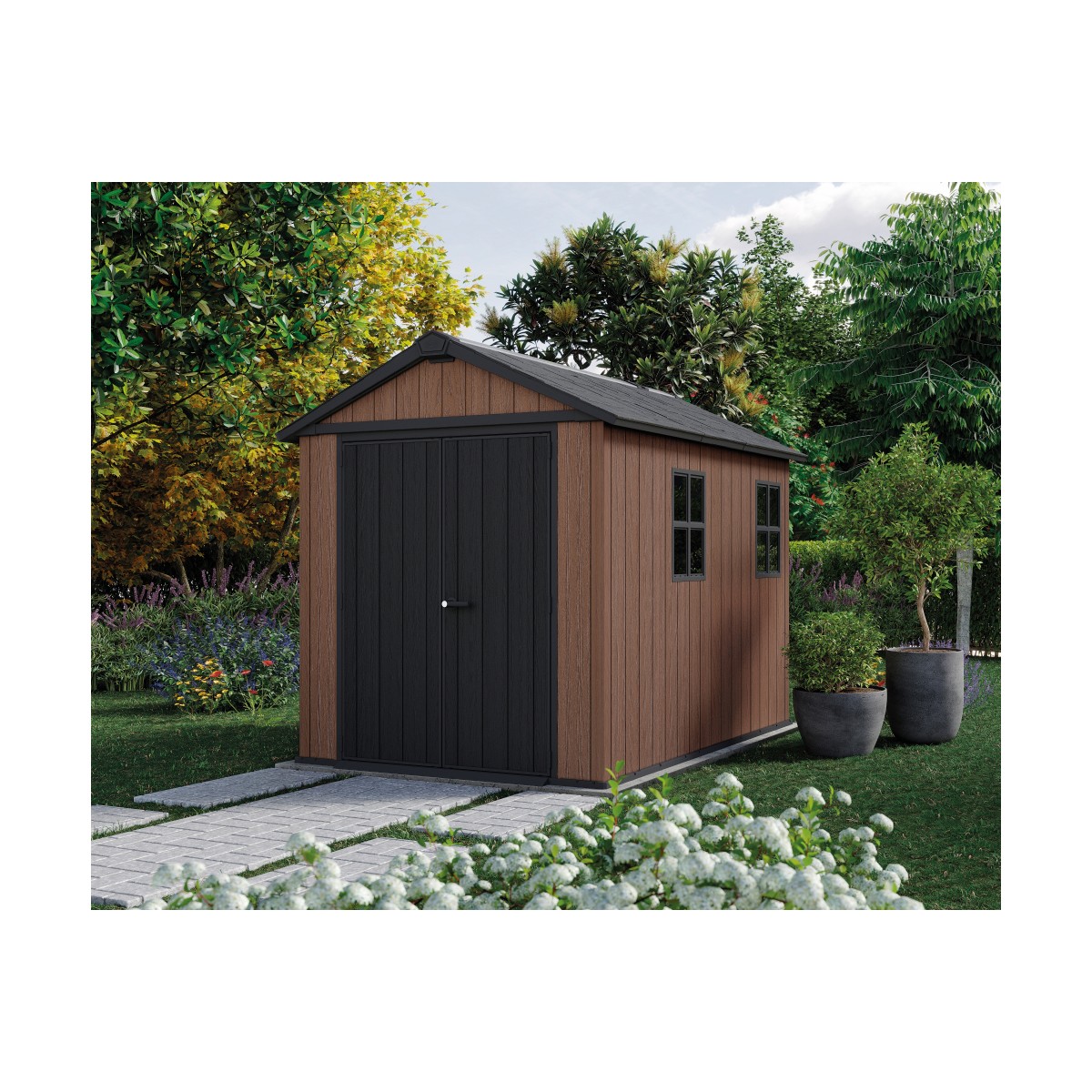 O casuta spatioasa si durabila, cu design modular si aspect elegant, perfecta pentru organizarea completa a gradinii fara costuri de intretinere.