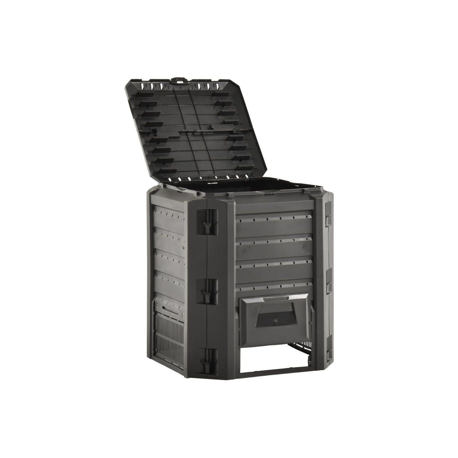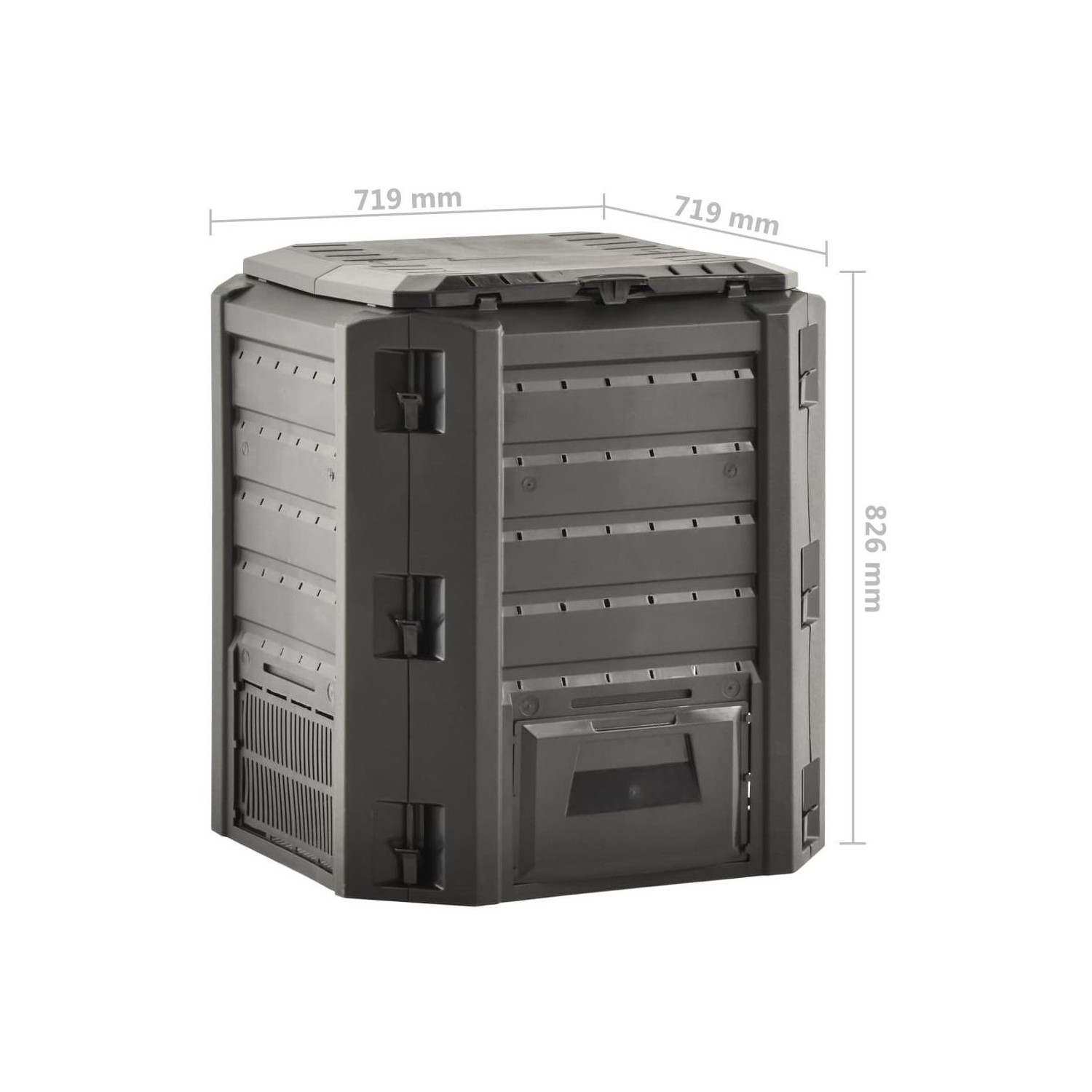 Avand un design compact, compostorul de gradina ocupa putin spatiu, dar are un volum mare. Capacul de deasupra faciliteaza umplerea prin partea superioara, iar clapeta asigura o indepartare simpla a humusului.