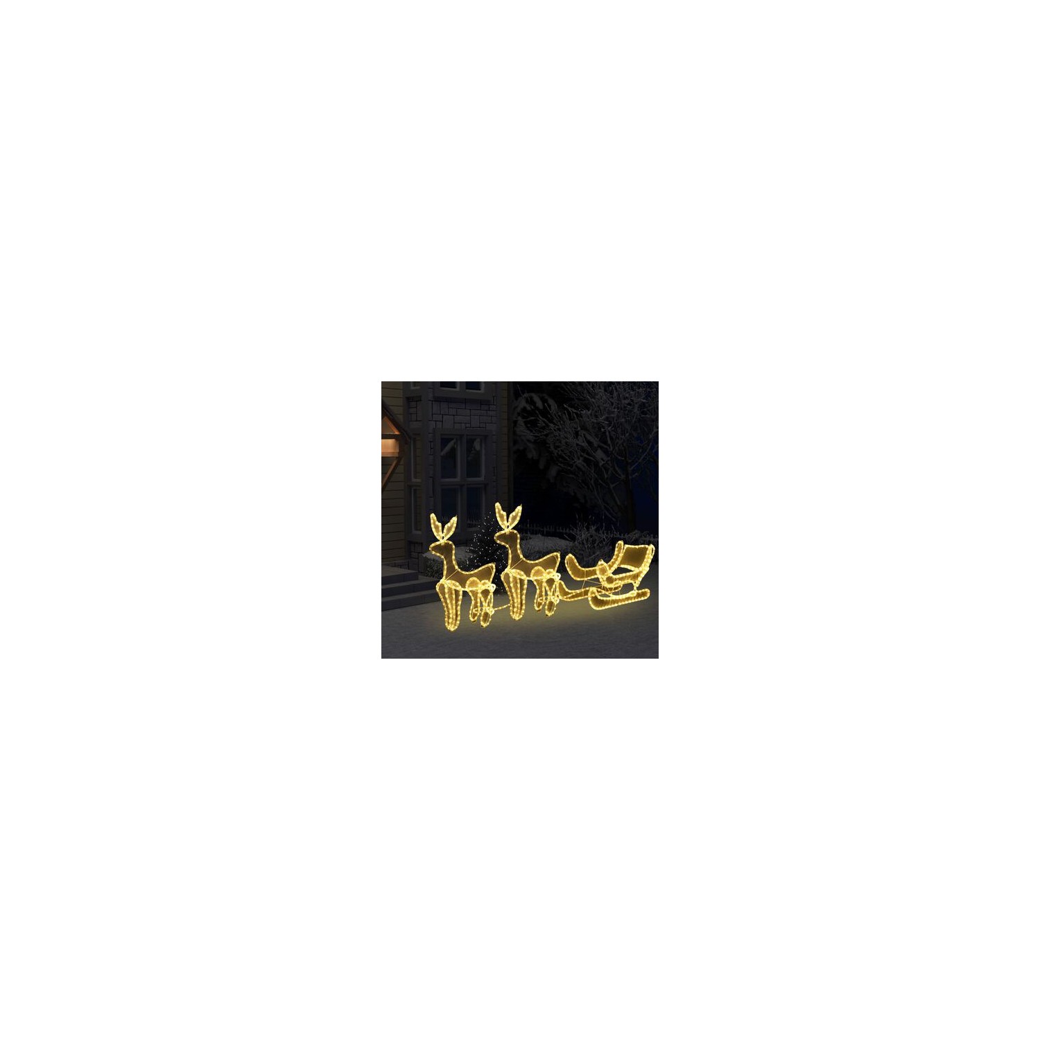Aceasta atragatoare decoratiune de Craciun, in forma de sanie cu 2 reni, include LED-uri si are un model tip plasa, fiind un element de decor incantator.