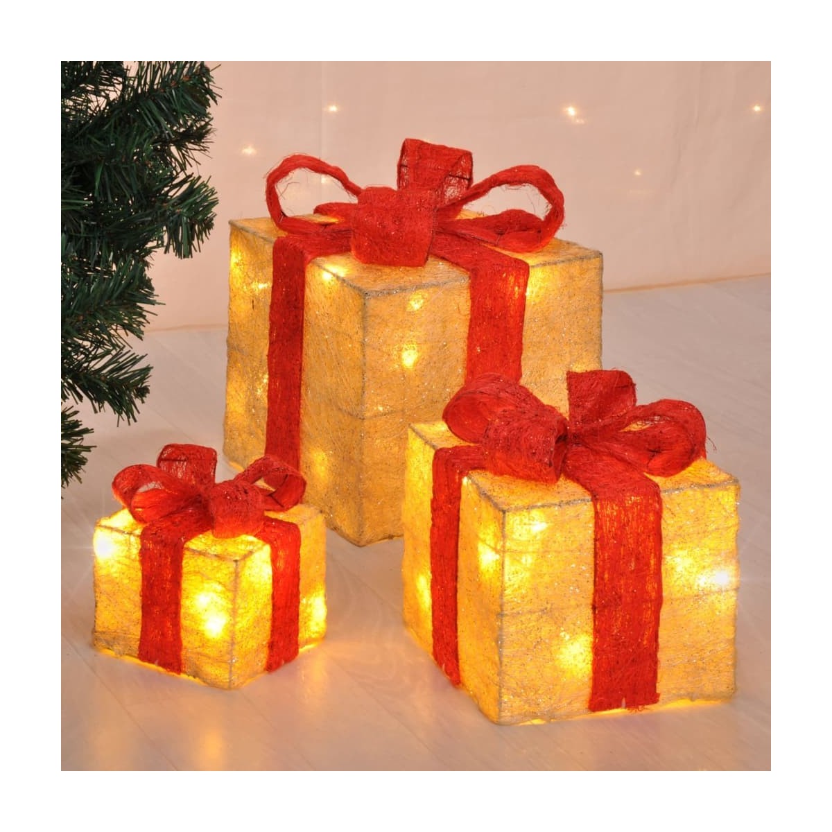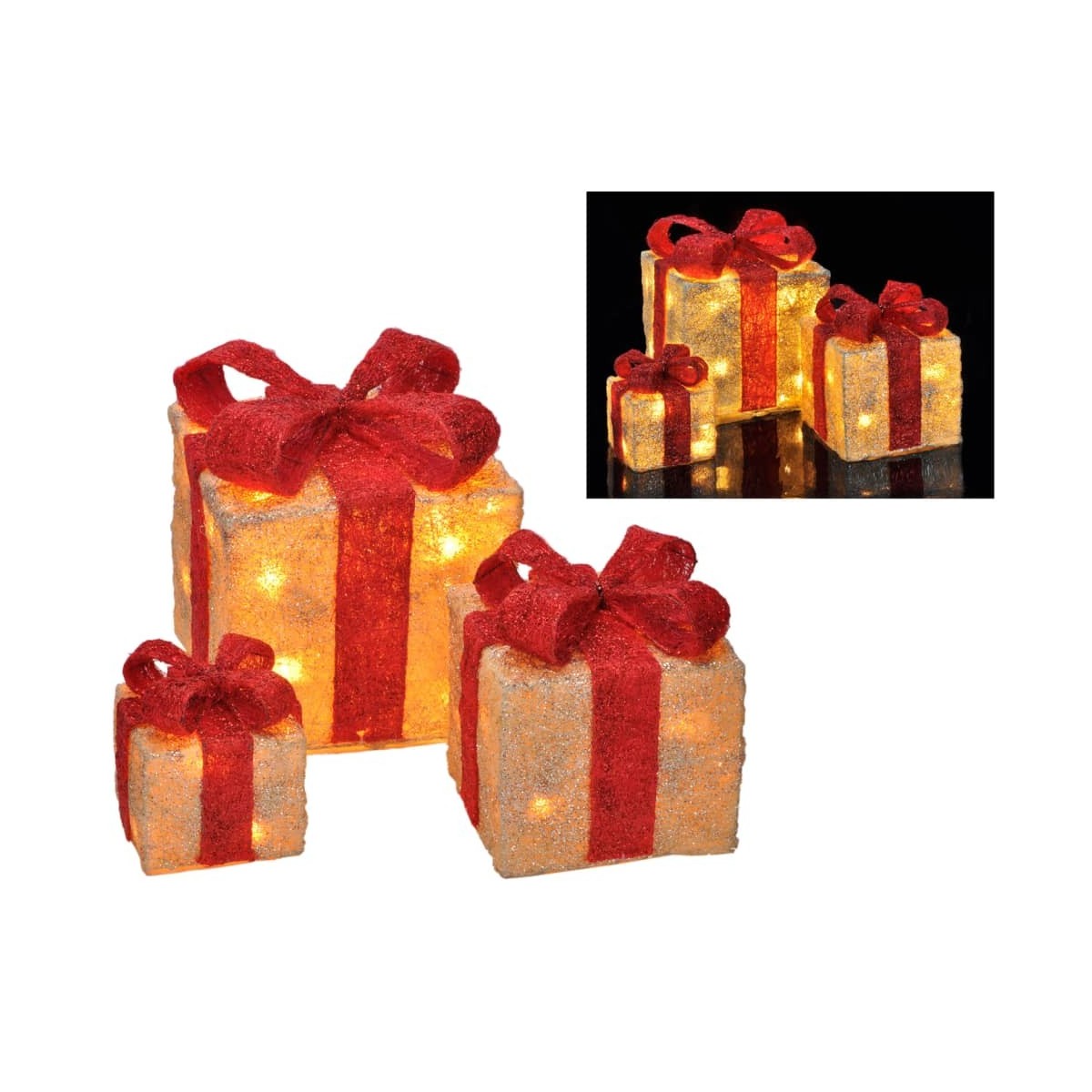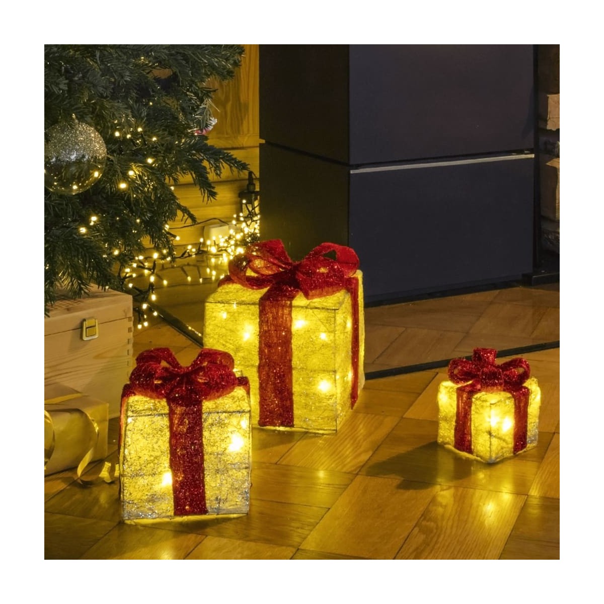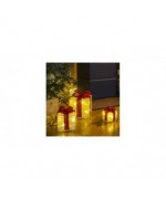 Adaugati o stralucire printre decoratiunile pomului de Craciun, cu acest set de trei cutii de cadou iluminate cu LED, de la HI. Aceste cutii sunt decorate cu panglici stralucitoare, oferind o sclipire ademenitoare si calda decorului dvs.
