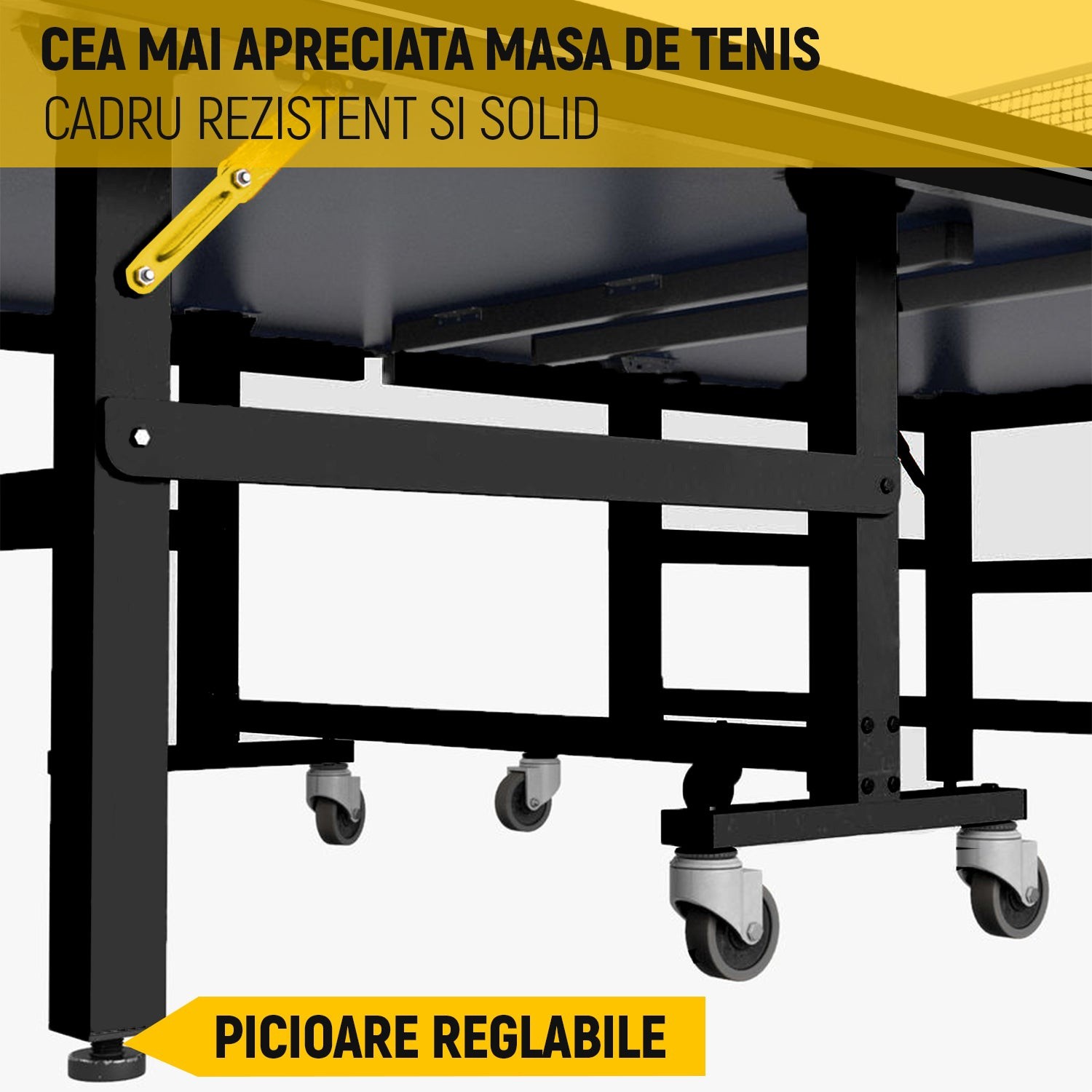 Picioarele stabile ale mesei permit ajustari personalizate ale inaltimii pentru o suprafata de joc complet plana si uniforma. Setul de plasa + suport de calitate competitionala se ataseaza si se indeparteaza cu usurinta datorita sistemului sau de fixare care permite reglaje de tensiune si inaltime.