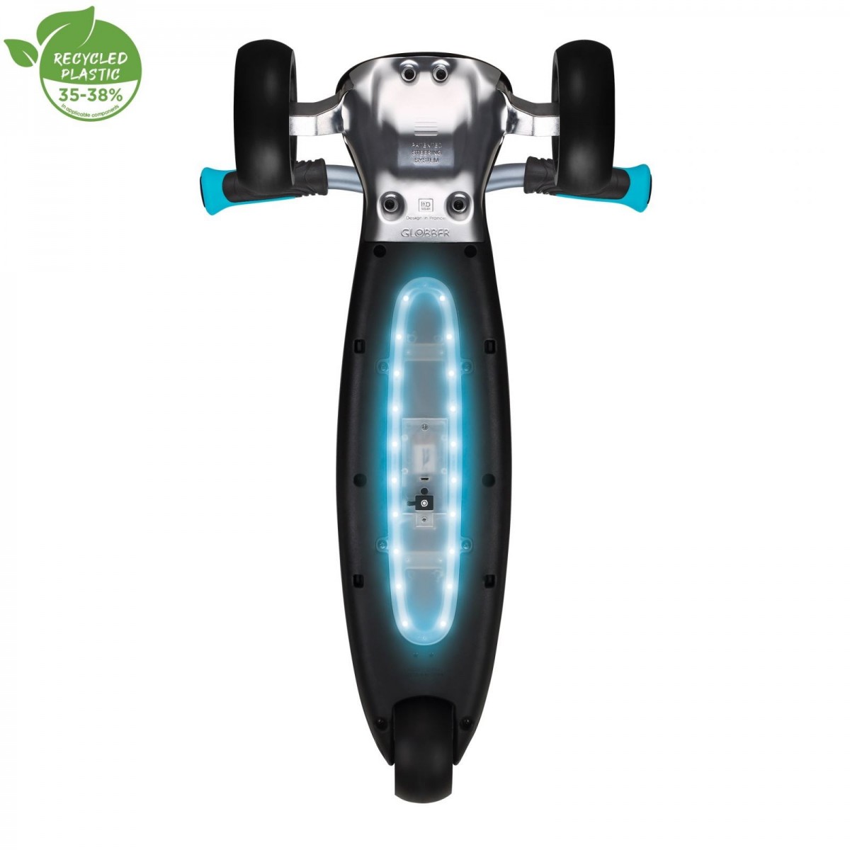 ULTIMUM LIGHTS este realizat cu 35-38% din plastic Global Recycled Standard (GRS)*. GRS este reperul internațional pentru verificarea prezenței conținutului reciclat în produsele finite, asigurarea transparenței materialelor și promovarea unei economii circulare.