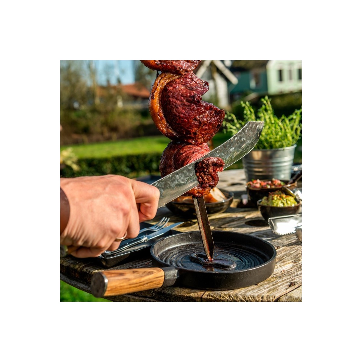 Dupa ce carnea este prajita pe o frigaruie din seria Forged Churrasco, aceasta este servita folosind tigaia de servire. Ceasta colecteaza marinada, sucurile din carne si bucatile mici de carne care se desprind in timpul felierii.