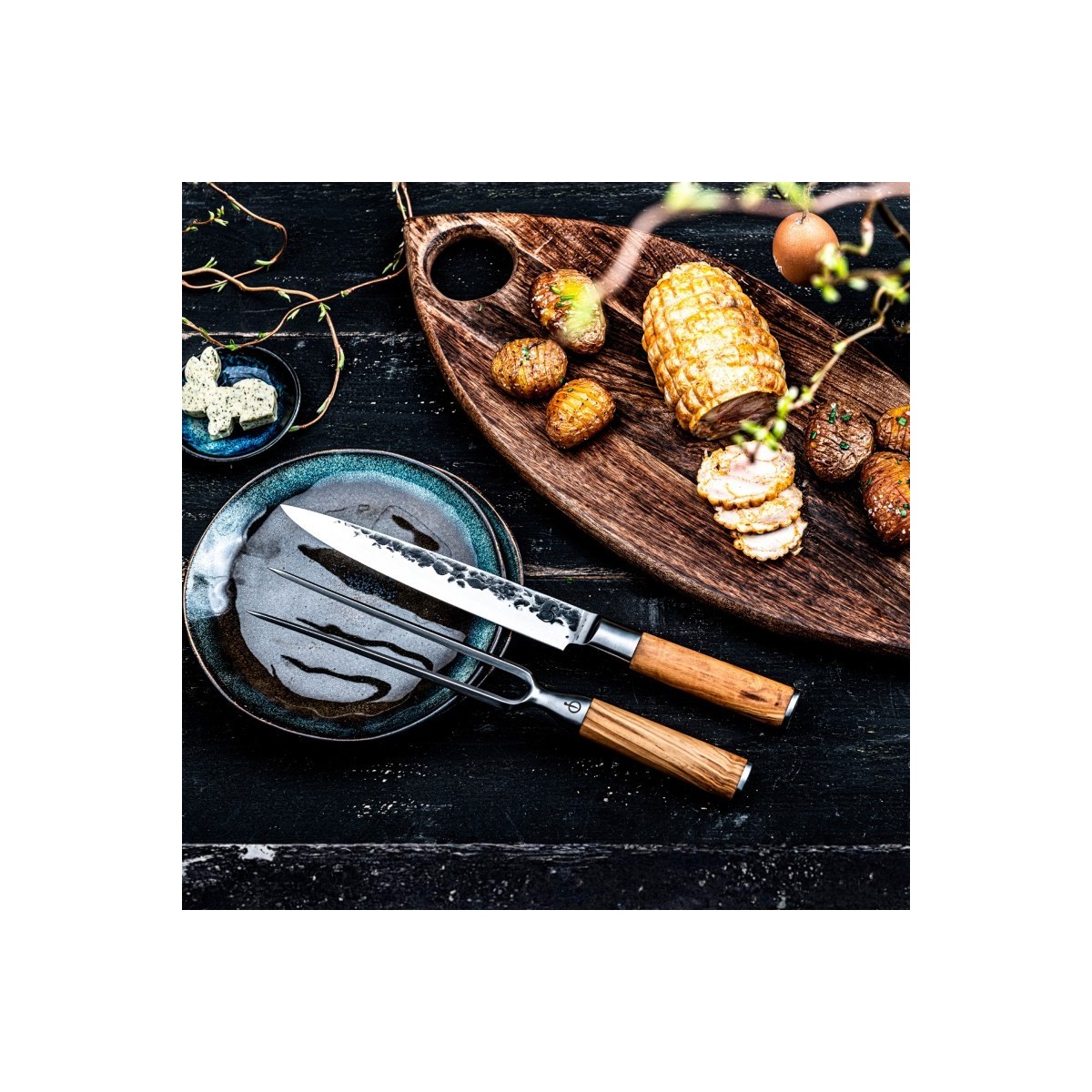 Furculita pentru transat Olive este utilizata pentru a fixa carnea sau pasarile in timpul transarii. Furculita pentru transat se combina perfect cu cutitul pentru transat Olive. Furculita pentru transat este ambalata intr-o cutie eleganta din lemn.