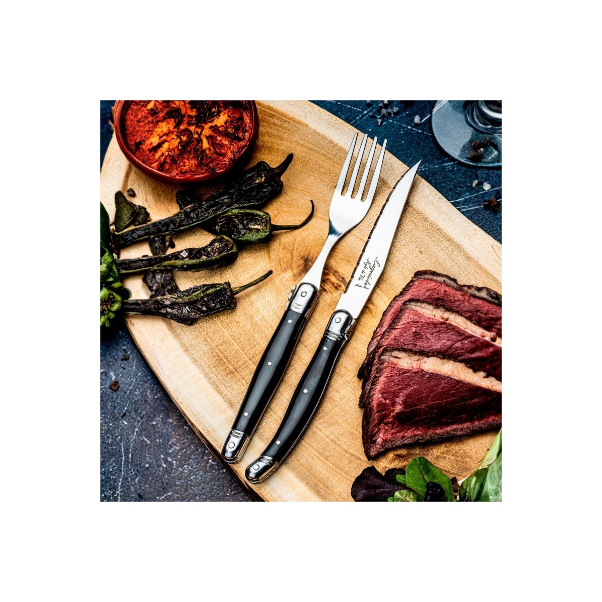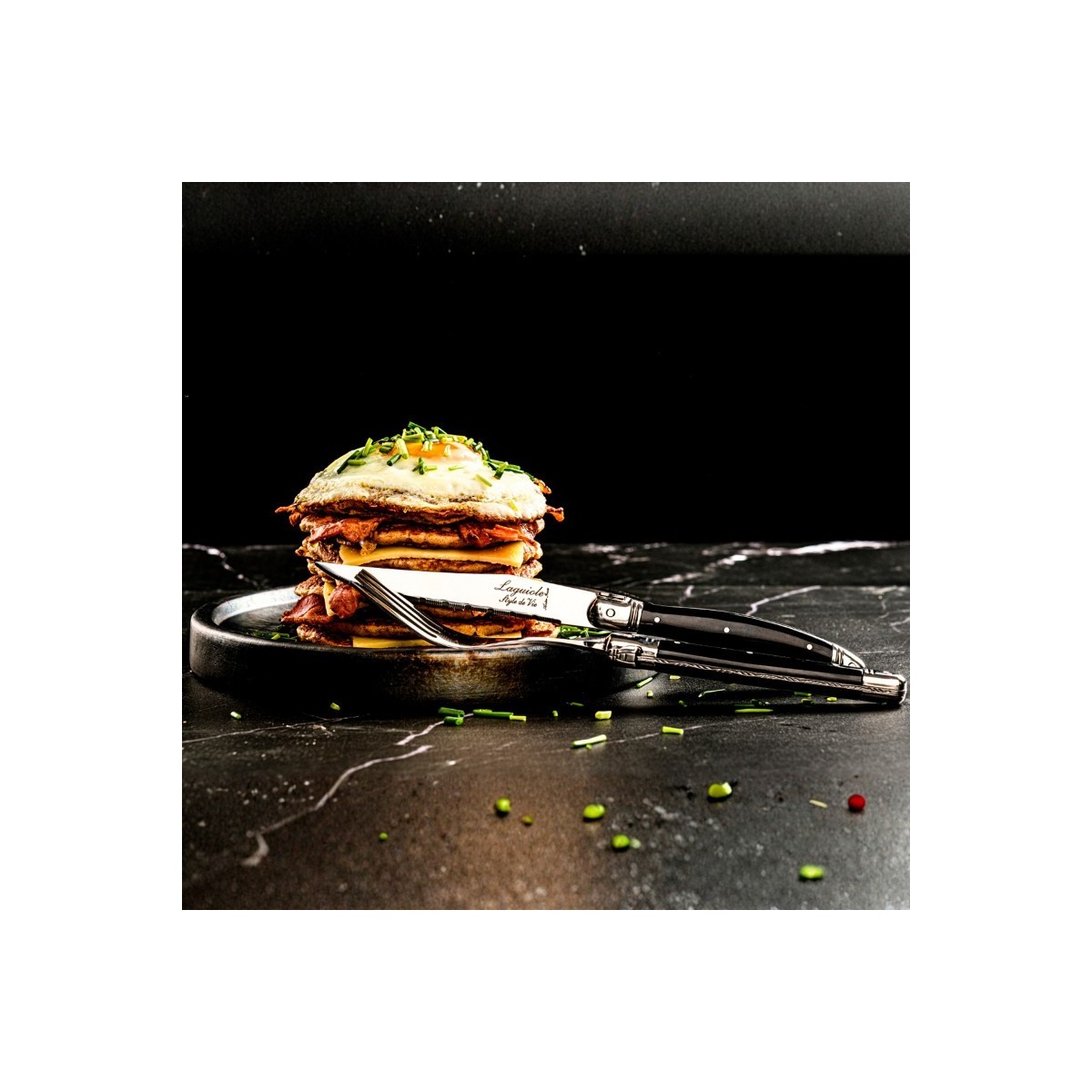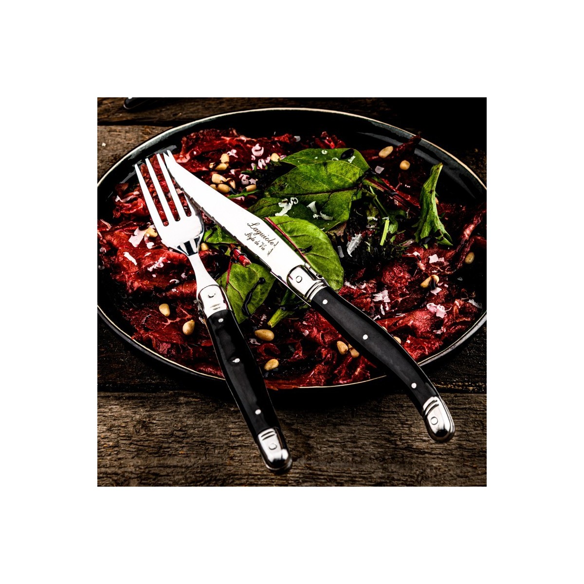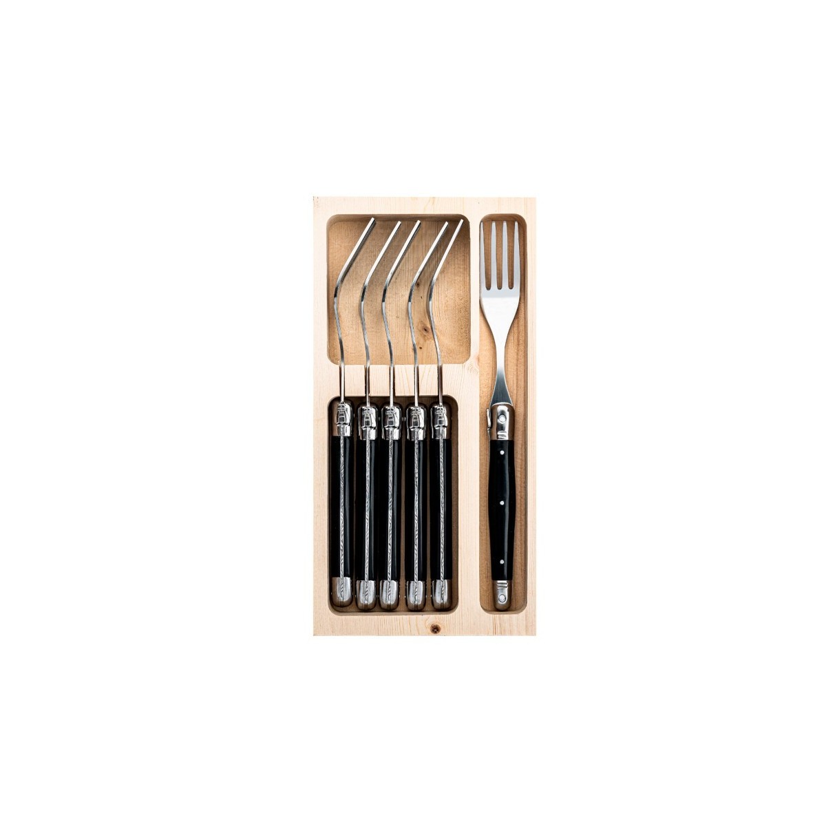 Setul de șase furculite cu maner negru din gama Laguiole Style de Vie Premium se potriveste oricarui stil de servire a mesei. Indiferent daca preferati o masa aranjata in stil indraznet sau dimpotriva, in stil elegant sau simplu, acest set este intotdeauna o alegere buna. Fiind realizate din otel inoxidabil si cu maner din plastic de culoare neagra, cu prindere confortabila, furculitele au un aspect atemporal si elegant.