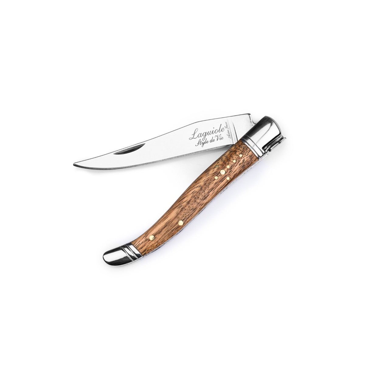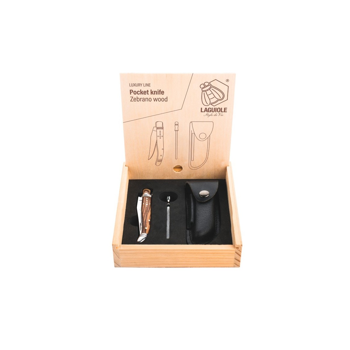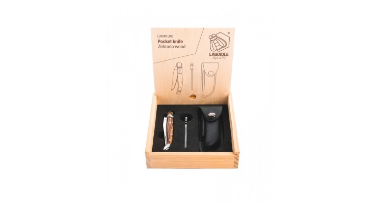 Un cadou adevarat pentru barbati. Cutitul de buzunar din lemn de zebrano, cu teaca si ascutitoare, este un cadou perfect pentru orice barbat. Lama neteda este fabricata din otel inoxidabil, are o grosime de 2,5 mm si prezinta sigla autentica Laguiole. Cutitul de buzunar nu poate fi introdus in masina de spalat vase. Fiecare cutit de buzunar este livrat intr-o cutie eleganta de cadou. Pe langa lemnul de zebrano, aceasta versiune este disponibila si in lemn de pakka rosu.