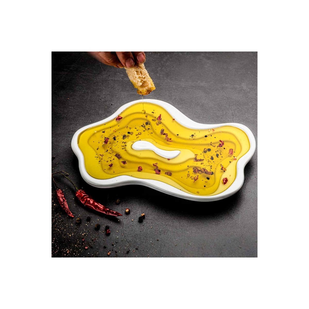 Bol elegant din ceramica pentru a inmuia bucati de paine sau bagheta, adaugand un plus de rafinament mesei dvs. Uleiul de masline isi schimba culoarea de la o nuanta deschisa la una inchisa datorita nivelurilor in trepte. Acest bol din ceramica masoara 22 x 16 cm si are o grosime de 1,5 cm. Bolul poate fi spalat in masina de spalat vase si are un finisaj alb mat.