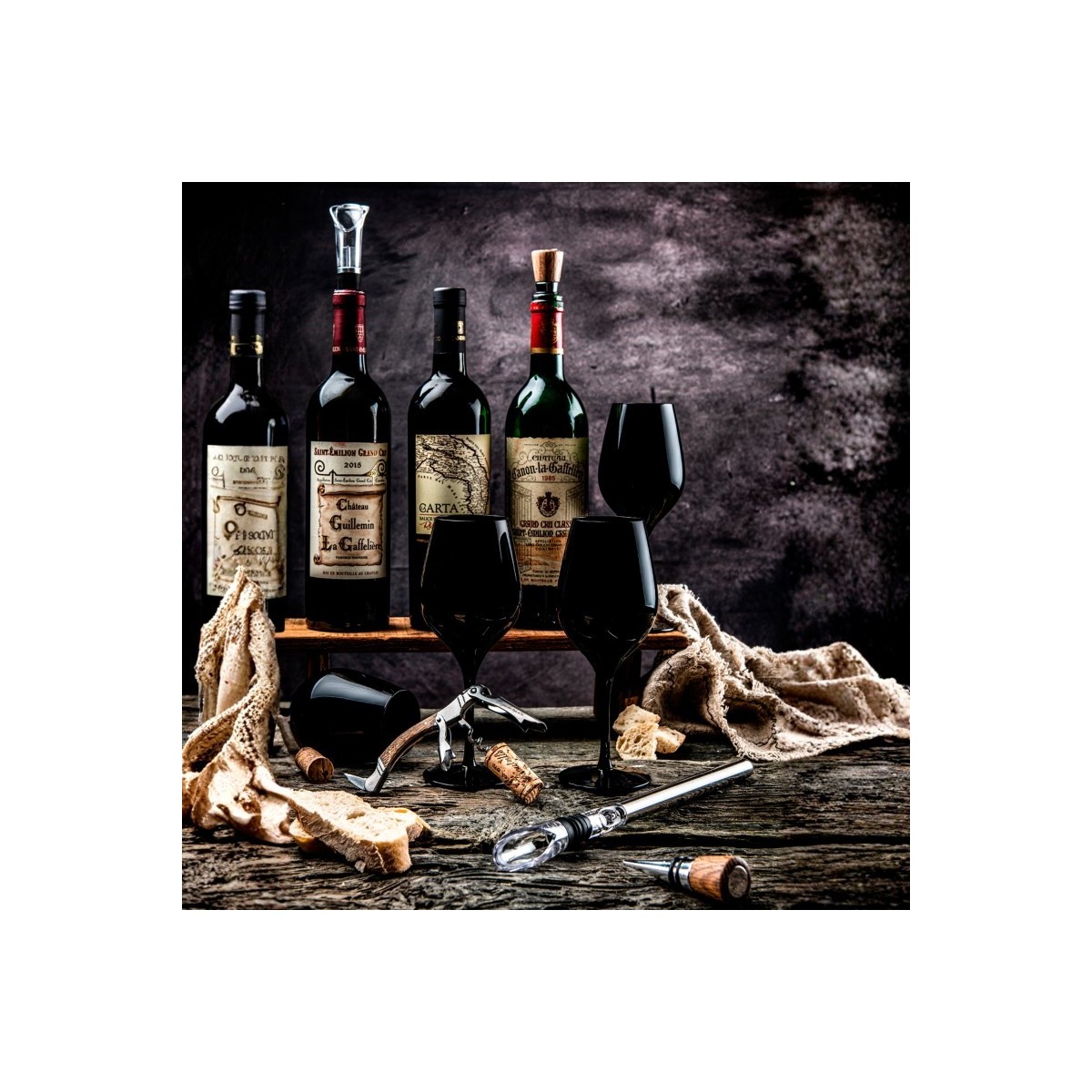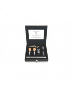 Setul perfect pentru orice iubitor de vin. Acest set include un tirbuson din lemn de stejar, doua dopuri pentru sticle, un decantor simplu si unul cu tub de racire, oferindu-va, astfel, toate accesoriile necesare pentru a savura vinul intr-un stil elegant.