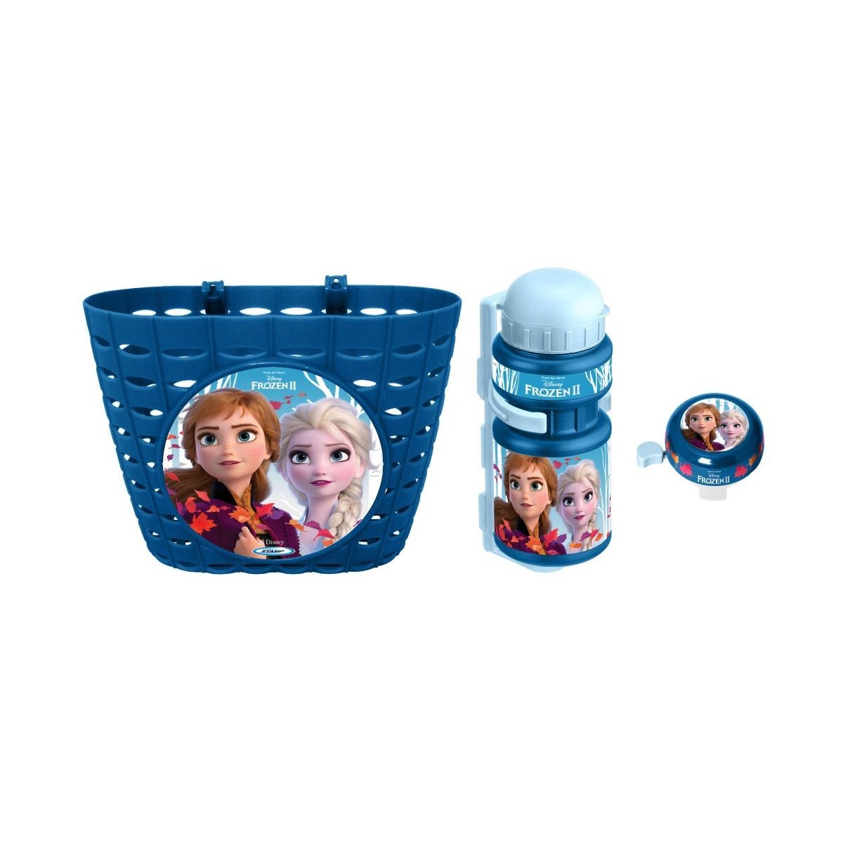 Set cosulet de transport, sticla de apa, si clopotel pentru bicicleta, frumos decorate cu personajele din indragitul desen animat Frozen.