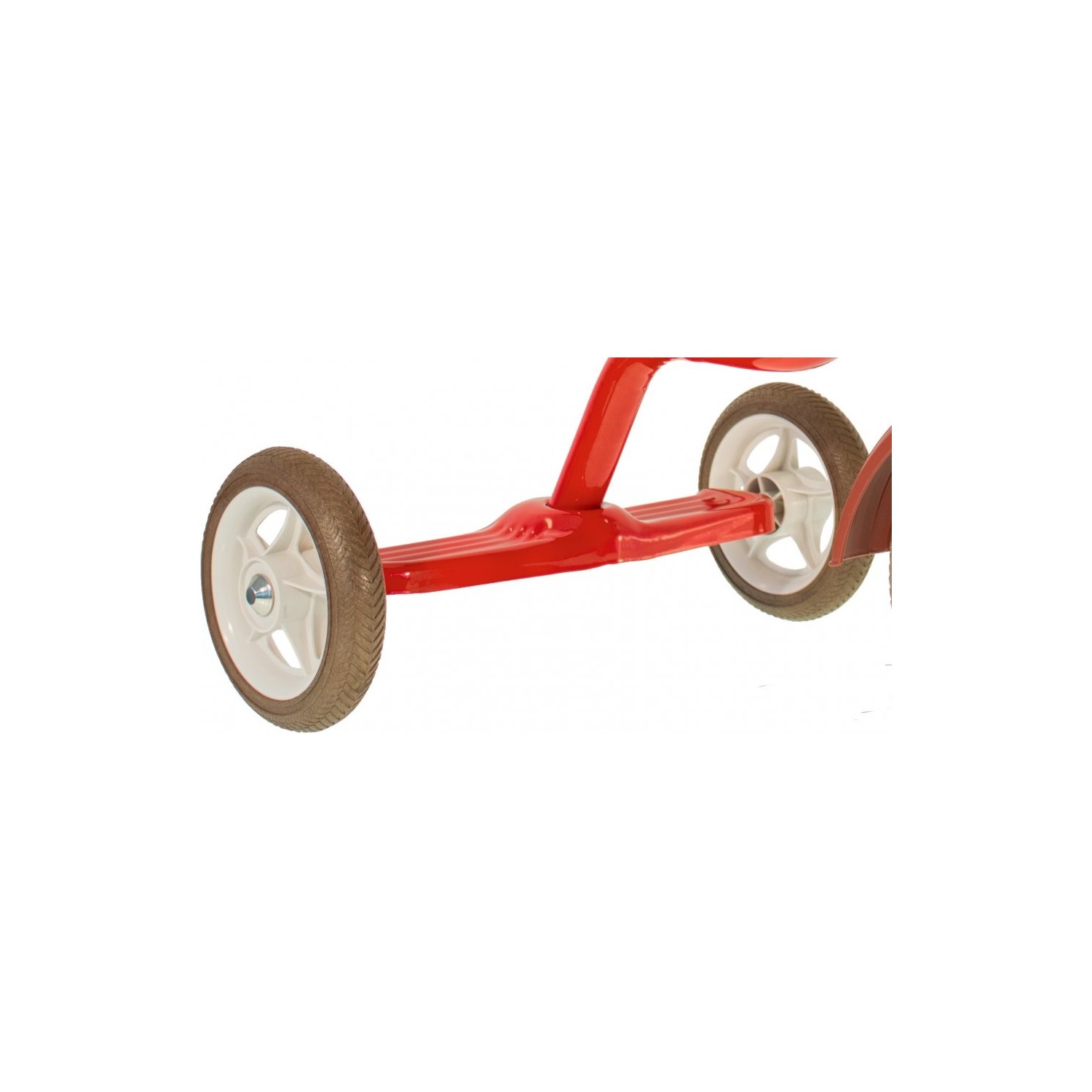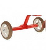 Tricicleta are cadru metalic, ghidon cromat, roti din cauciuc EVA, si platforma pe axul din spate.