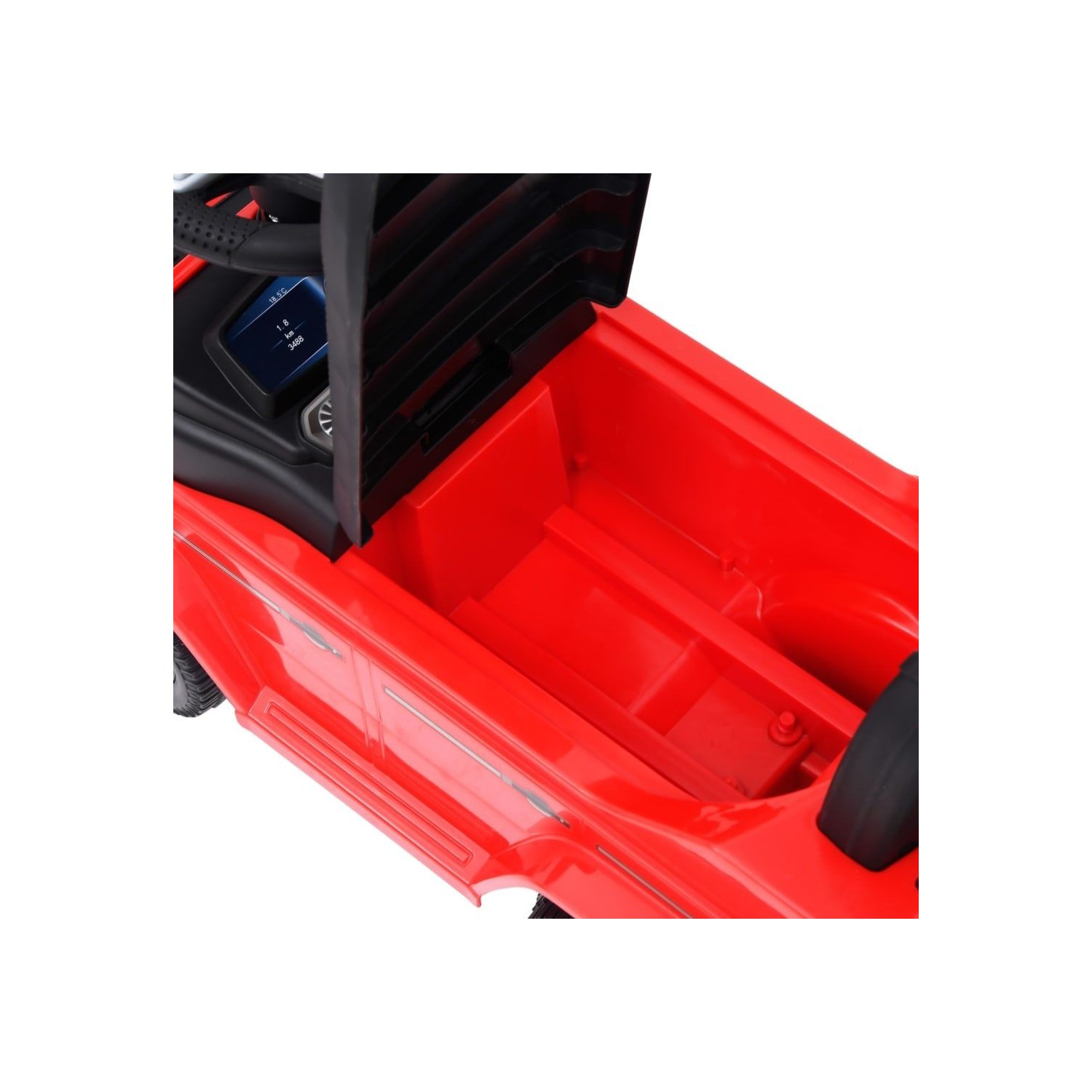 Masina pentru copii ride-on are un volan pentru directie, un scaun jos si un spatar conceput ergonomic, care faciliteaza urcarea si coborarea.