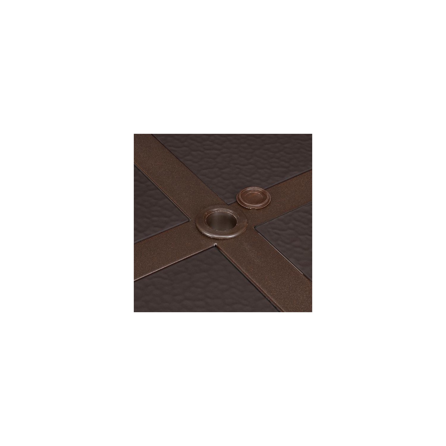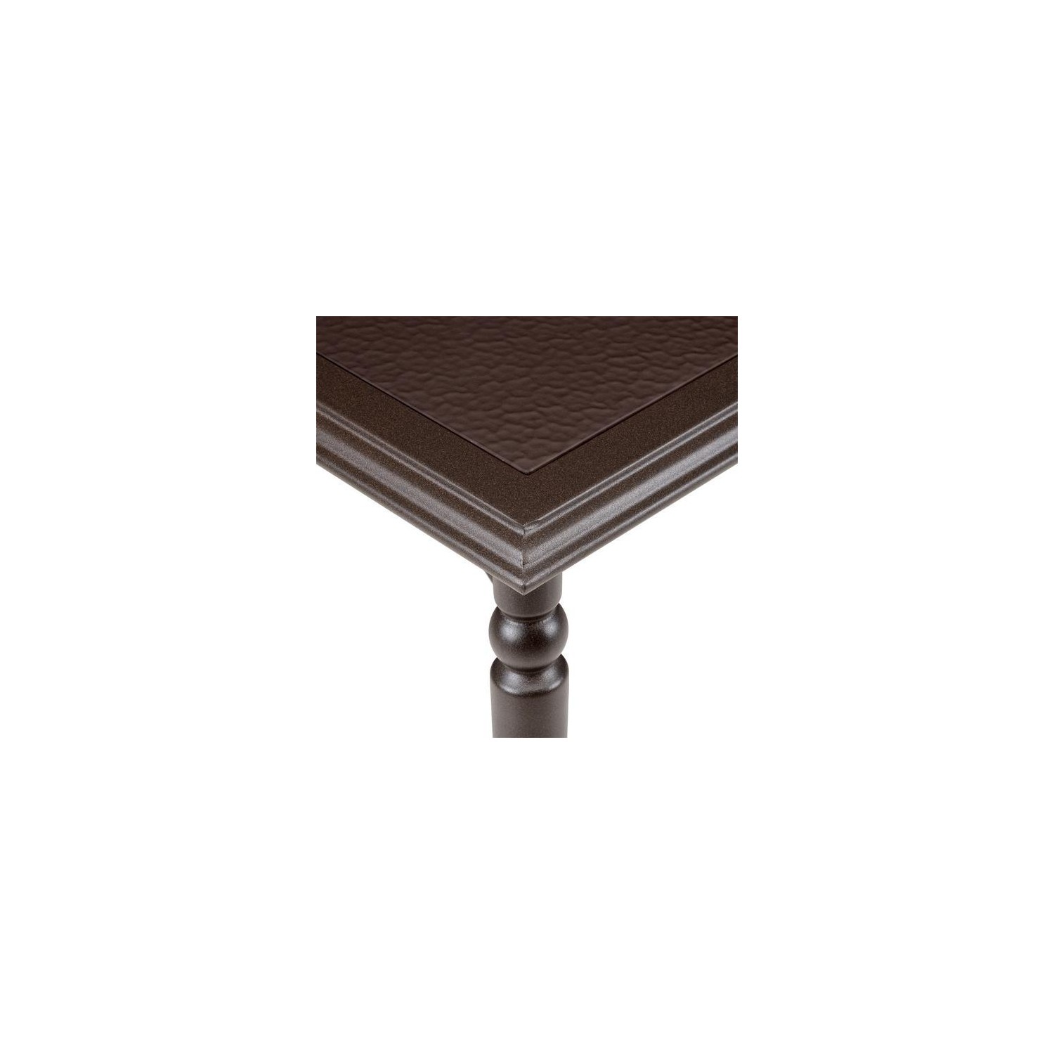 Topul mesei este realizat din sticla securizata cu finisaj maro, iar structura din otel si aluminiu vopsita în câmp electrostatic rezista la ruginire si intemperii.