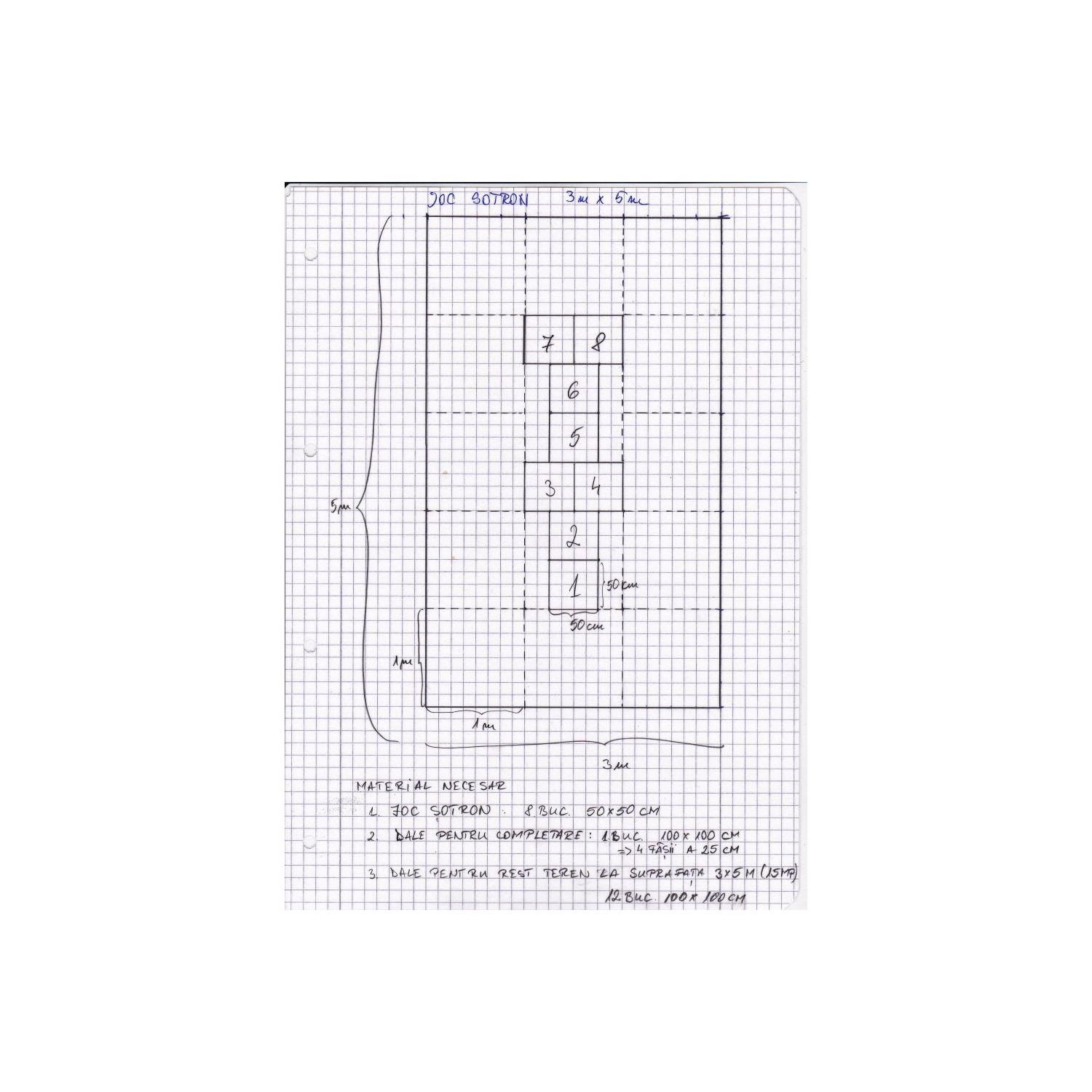Jocul sotron face parte din cele mai populare jocuri pentru copii si adulti. Este format din 8 buc. dale de 50x50 cm numerotate de la 1-8. Se poate introduce intr-un chenar de 3x5 M, astfel completarea se face cu dale 13 buc. 100x100 cm. Diferenta de pret/ material se calculeaza separat pentru fiecare proiect in parte.