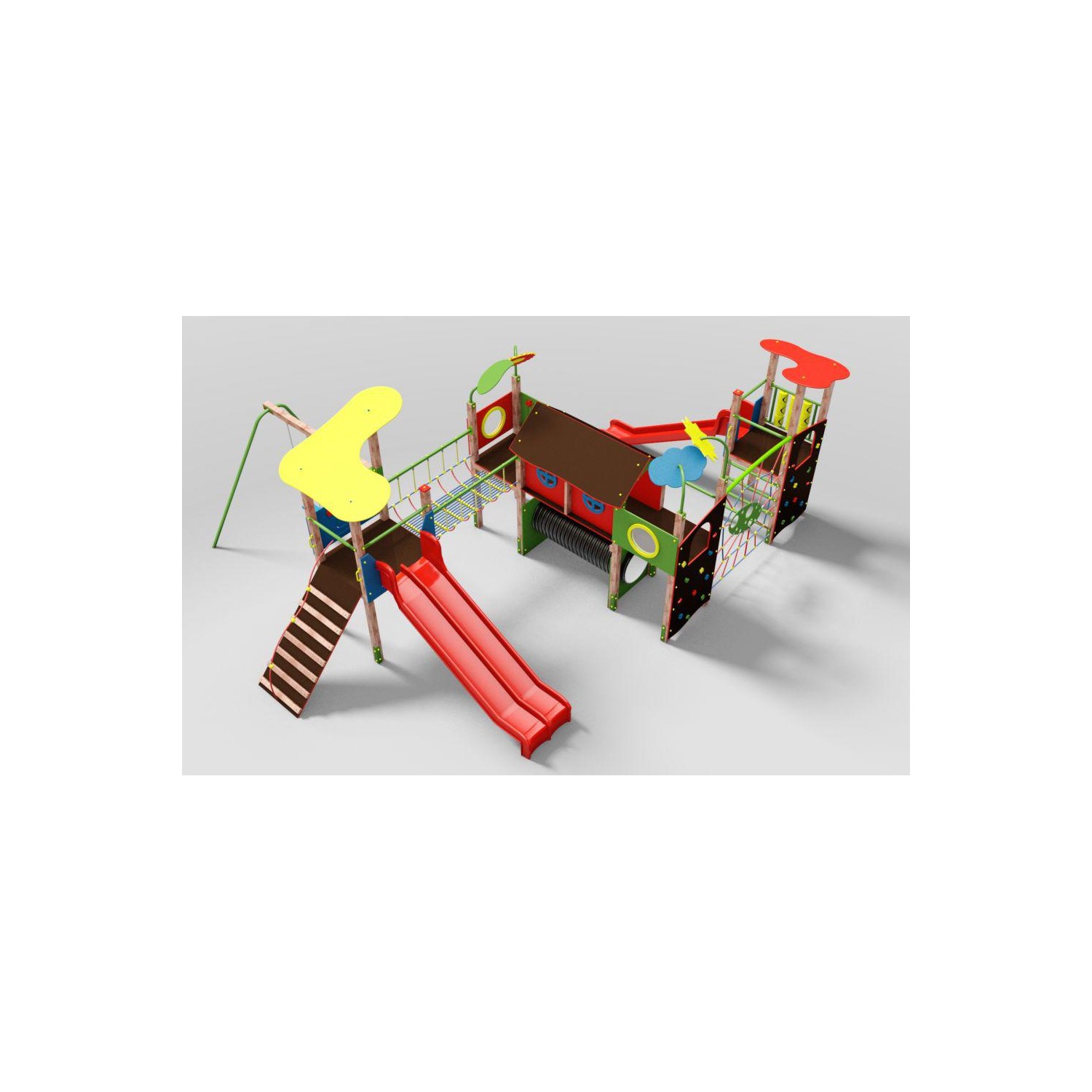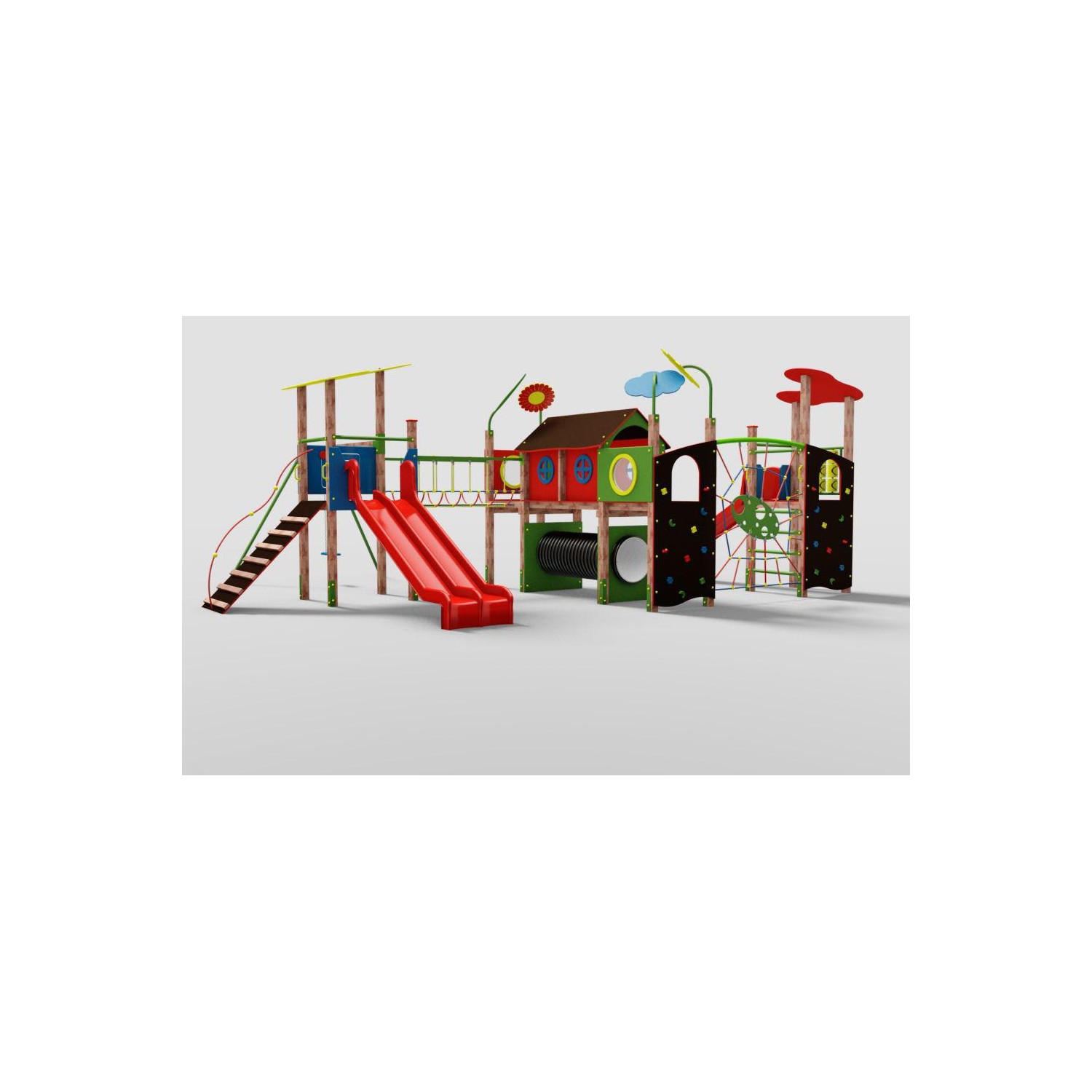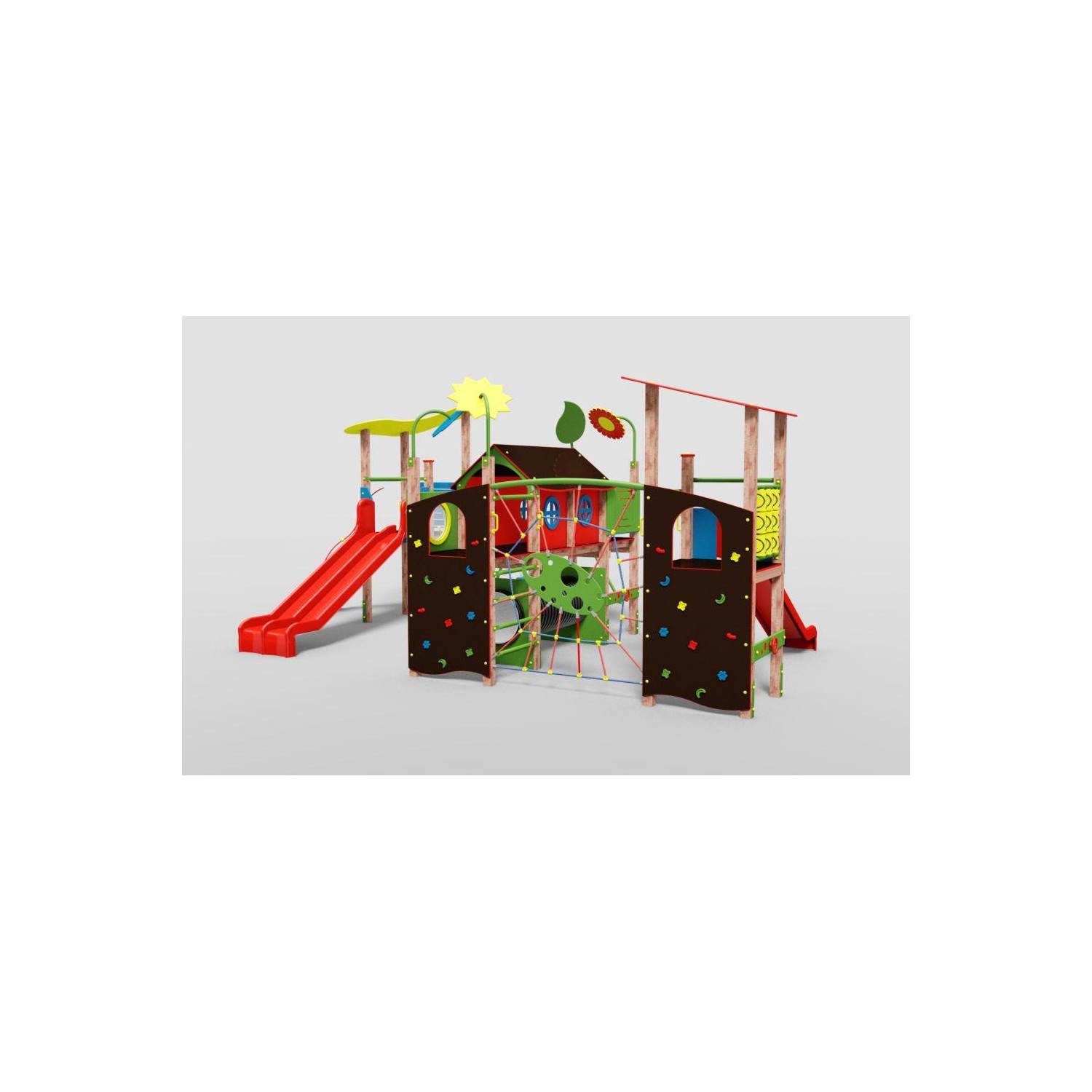 Este un complex care contine 4 turnuri si instrumente de catarare. Produsul este conform cerințelor EN 1176-1.3: 2008 Acest complex de joacă multifuncțional este recomandat pentru grădinițe, școli. Turnului este dotat cu un tobogan cu urechi mari, cu un perete de cățărare cu pietre în diferite forme /culoare pentru a ajuta pe cei mici.