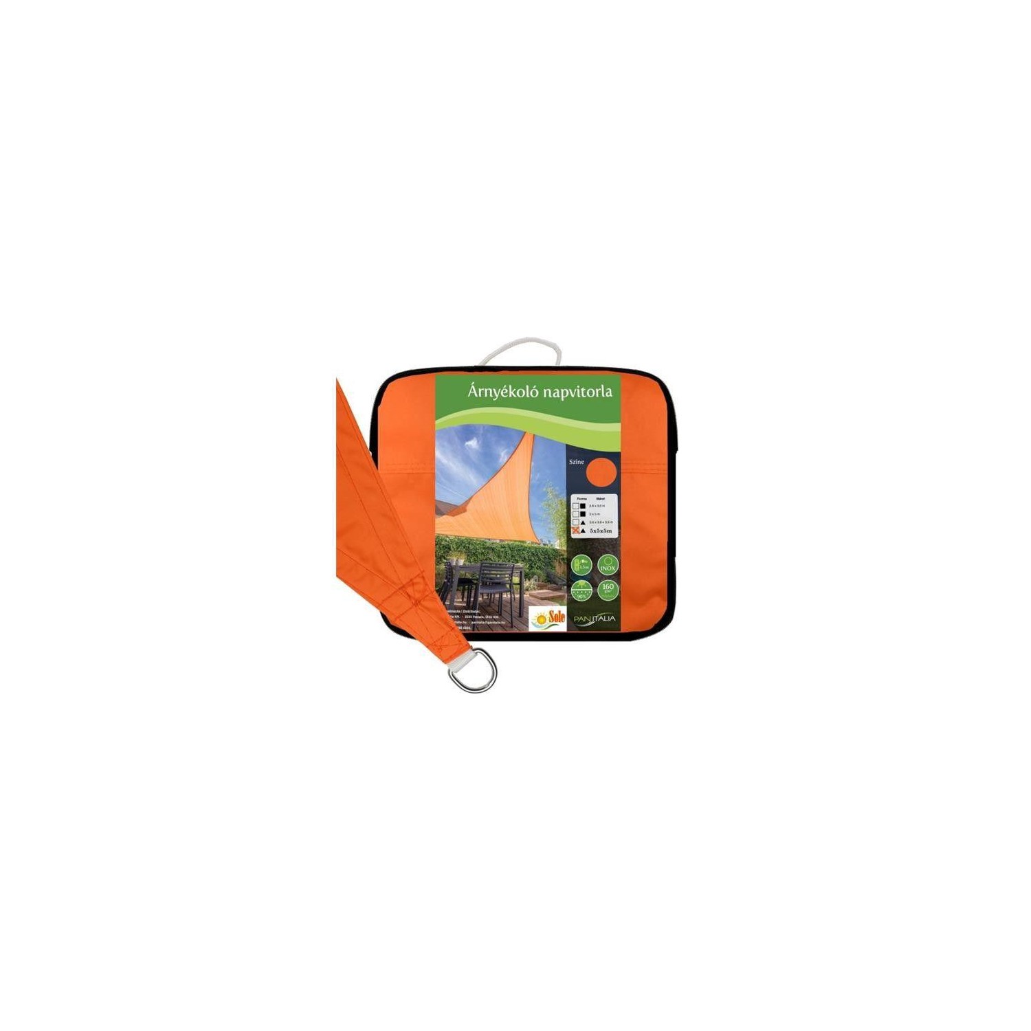 Parasolar, forma triunghiulara. Material:poliester 160 g/m2 Culori disponibile: portocaliu, Dimensiuni:3,6m x 3,6m x 3,6m