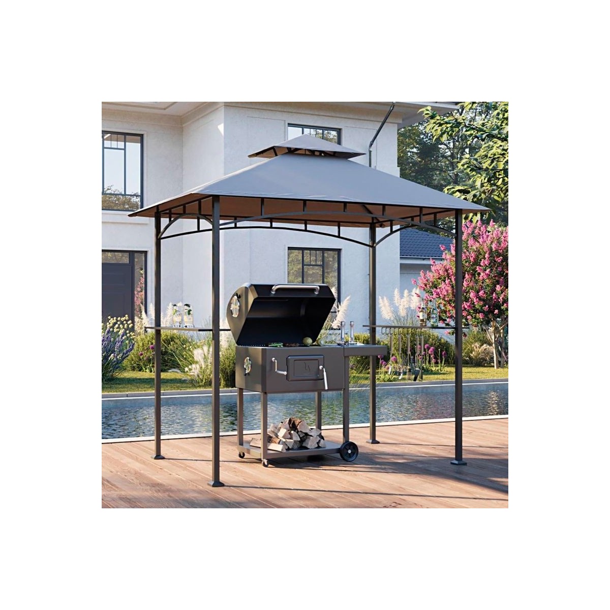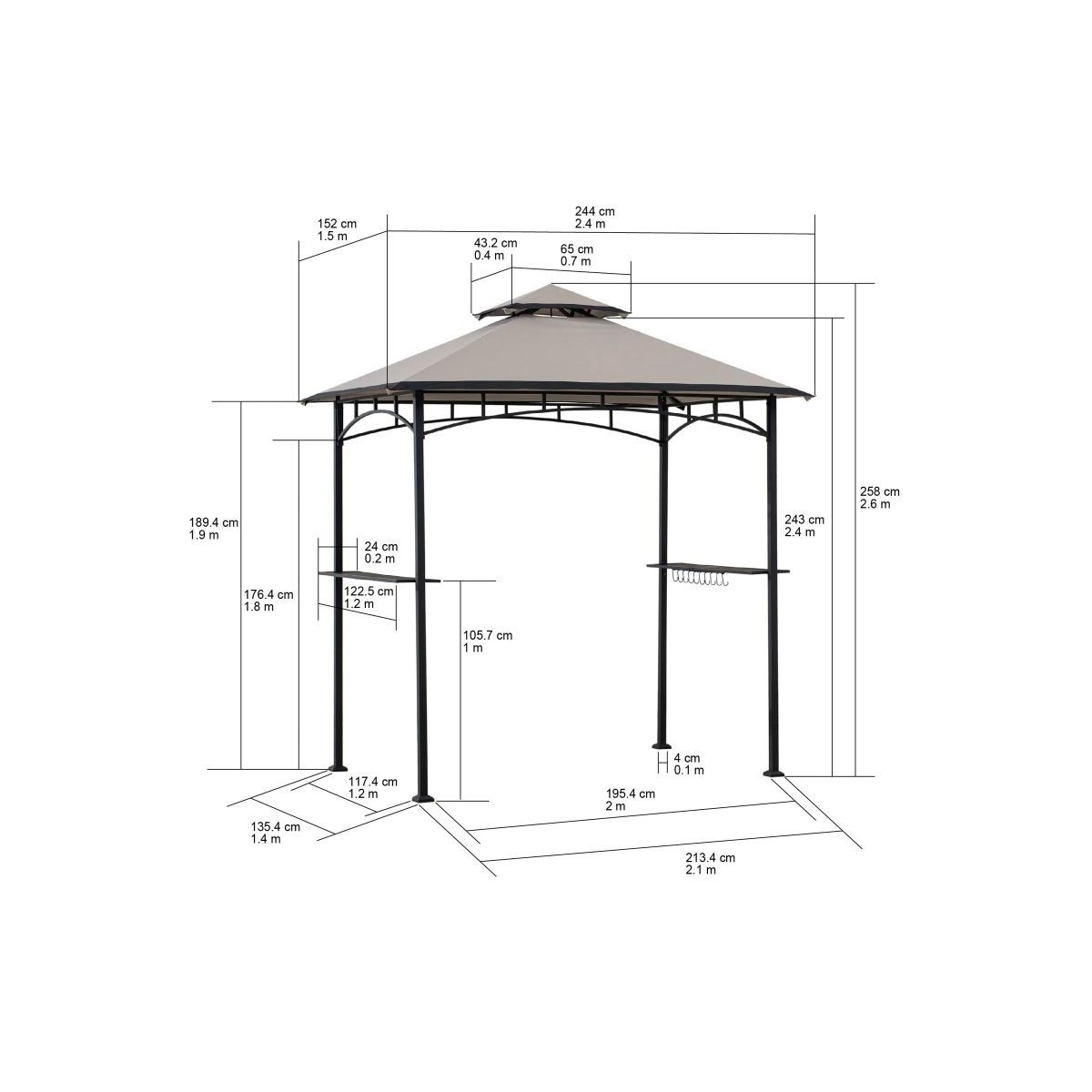 Acest pavilion pentru gratar a fost creat ca sa va puteti bucura din plin de timpul petrecut in gradina. Structura din otel rezistent la rugina si acoperit cu pulbere, cu dimensiuni de 244x152 cm, care sustine o copertina rezistenta la intemperii, nu numai ca va protejeaza gratarul, dar va si ajuta sa va bucurati de racoare in timpul gratarului. Astfel, nu mai riscati niciodata sa stati in ploaie in timp ce intoarceti burgerii pe grill. Copertina cu 2 niveluri contribuie la evacuarea fumului. Accesoriile practice, cum ar fi carligele pentru ustensilele de gratar si rafturile incorporate, fac ca pavilionul sa fie functional si atractiv. Cu ajutorul instructiunilor de asamblare usor de pus in practica, va puteti bucura de o atmosfera perfecta la gratar in cel mai scurt timp posibil.