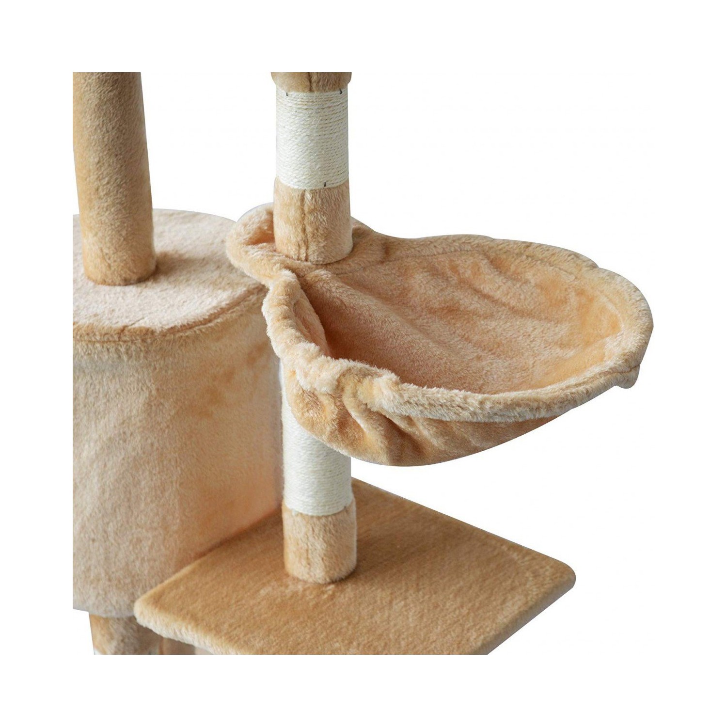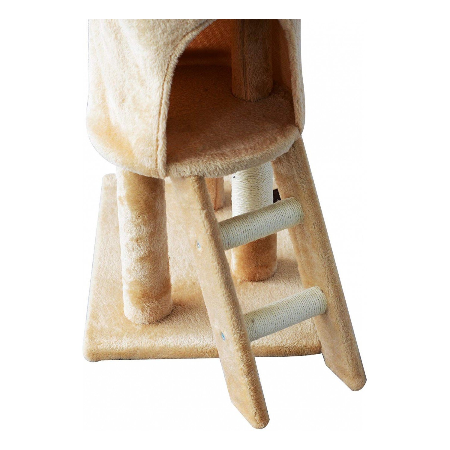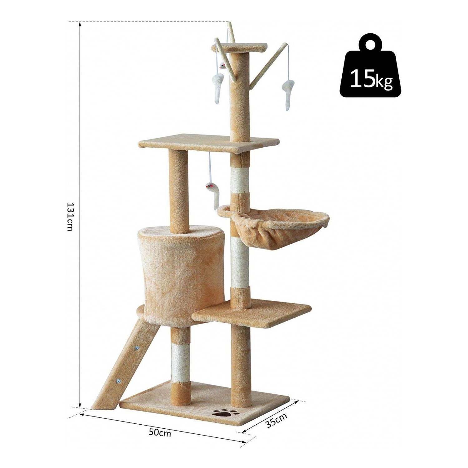 Ansamblu de joaca contine: 1 casuta de pisici, un hamac, 3 platforme de joaca, o scarita si 4 jucarii suspendare in forma de soricei