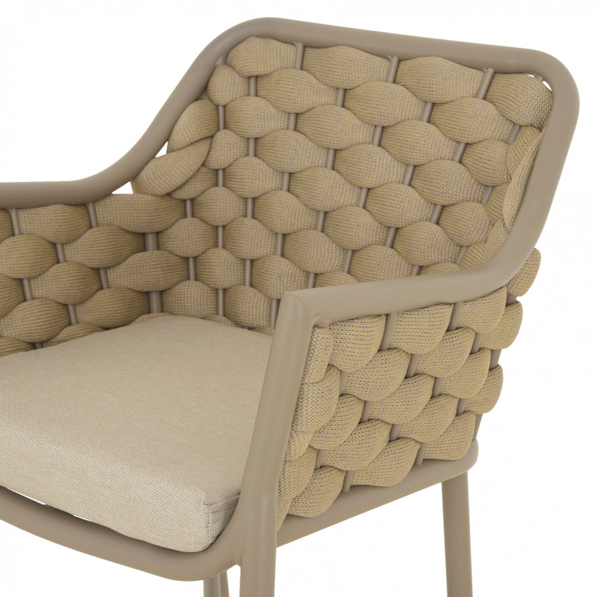 Structura este realizata din aluminiu vopsit in camp electrostatic, ceea ce asigura rezistenta la coroziune si o greutate redusa pentru utilizare practica. Impletitura din chinga poliester cu protectie UV completeaza designul si ofera un plus de confort si flexibilitate in utilizare.