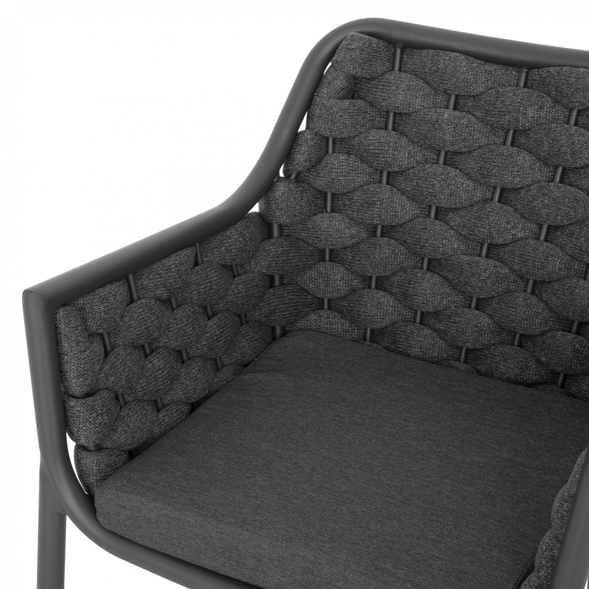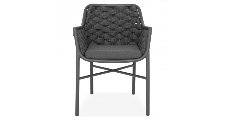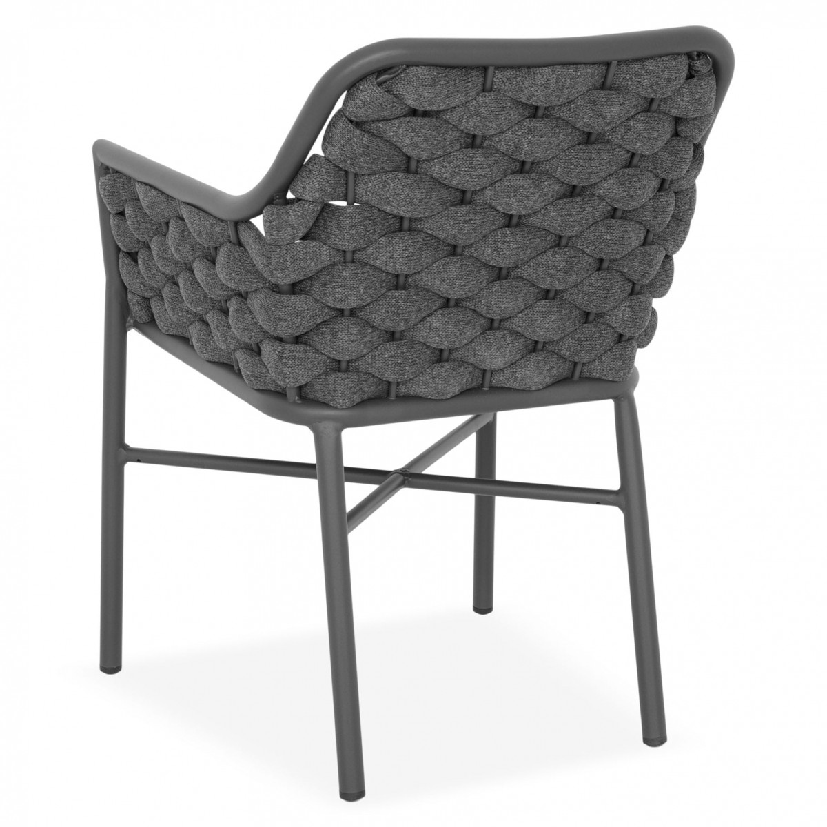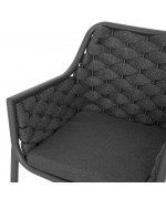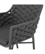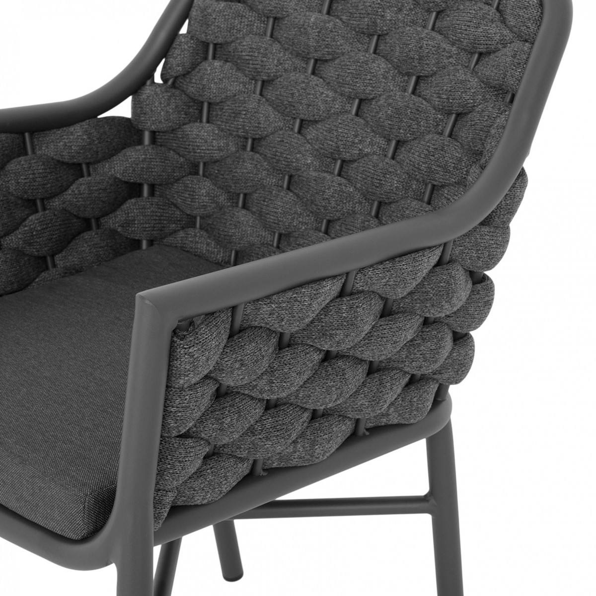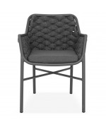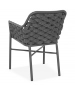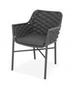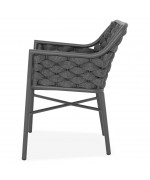 Structura este realizata din aluminiu vopsit in camp electrostatic, ceea ce asigura rezistenta la coroziune si o greutate redusa pentru manipulare usoara. Impletitura din chinga poliester cu protectie UV adauga un plus de confort si un design actual, potrivit pentru utilizare frecventa in exterior.