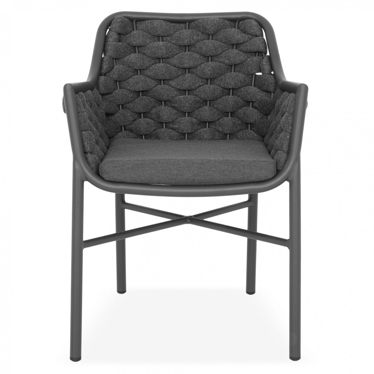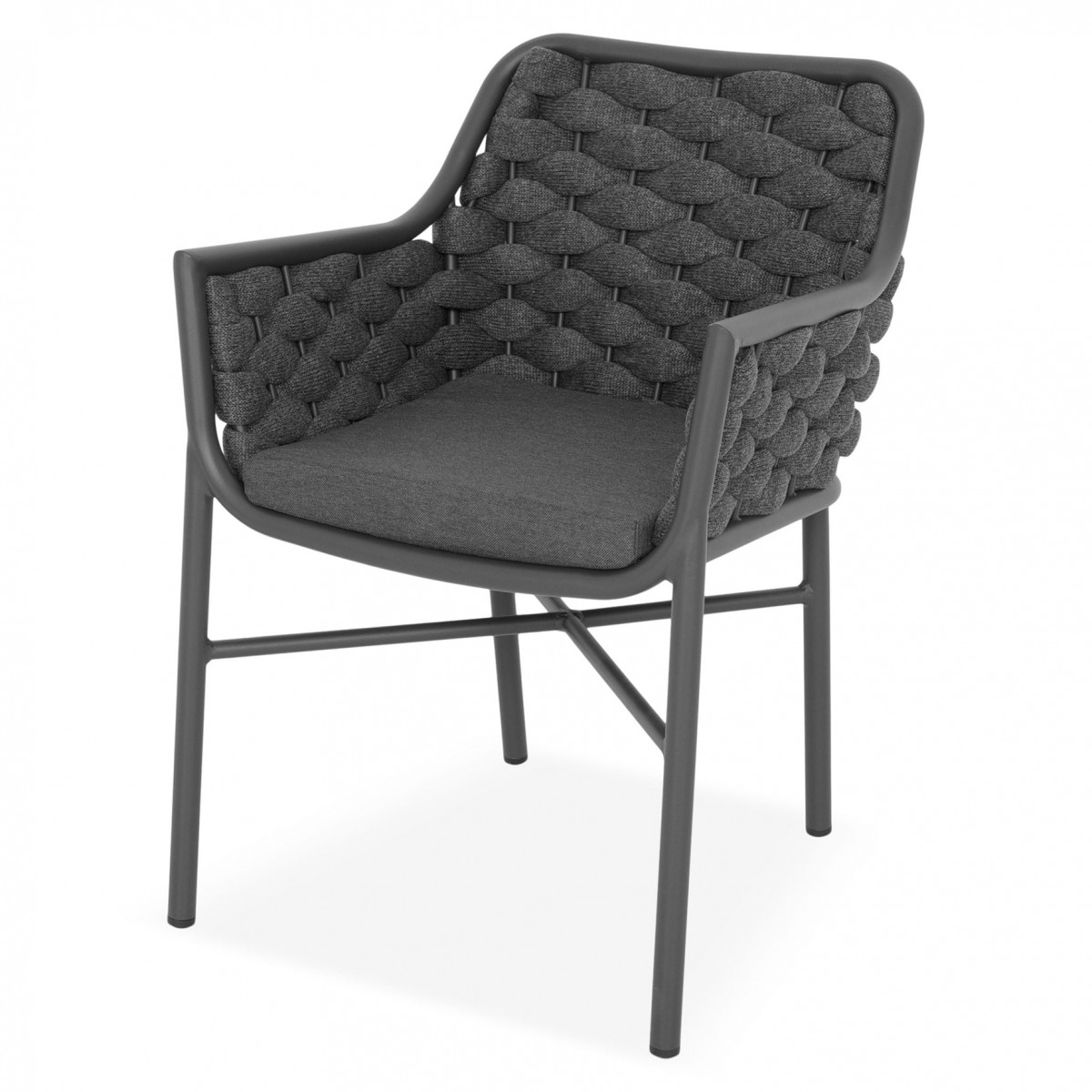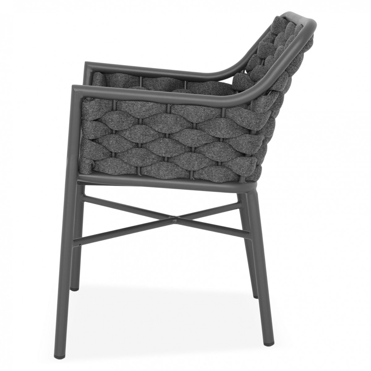 Structura este realizata din aluminiu vopsit in camp electrostatic, ceea ce asigura rezistenta la coroziune si o greutate redusa pentru manipulare usoara. Impletitura din chinga poliester cu protectie UV adauga un plus de confort si un design actual, potrivit pentru utilizare frecventa in exterior.