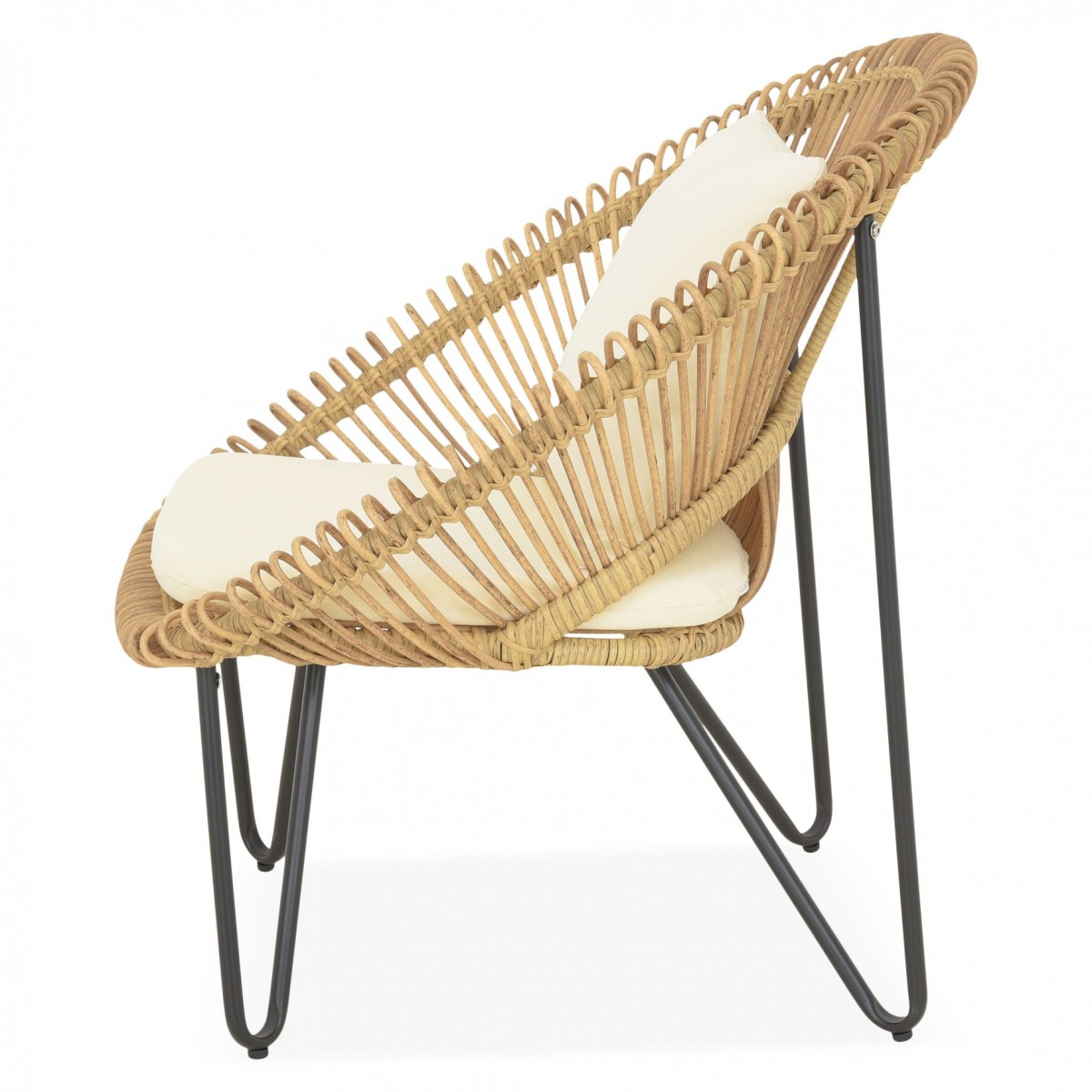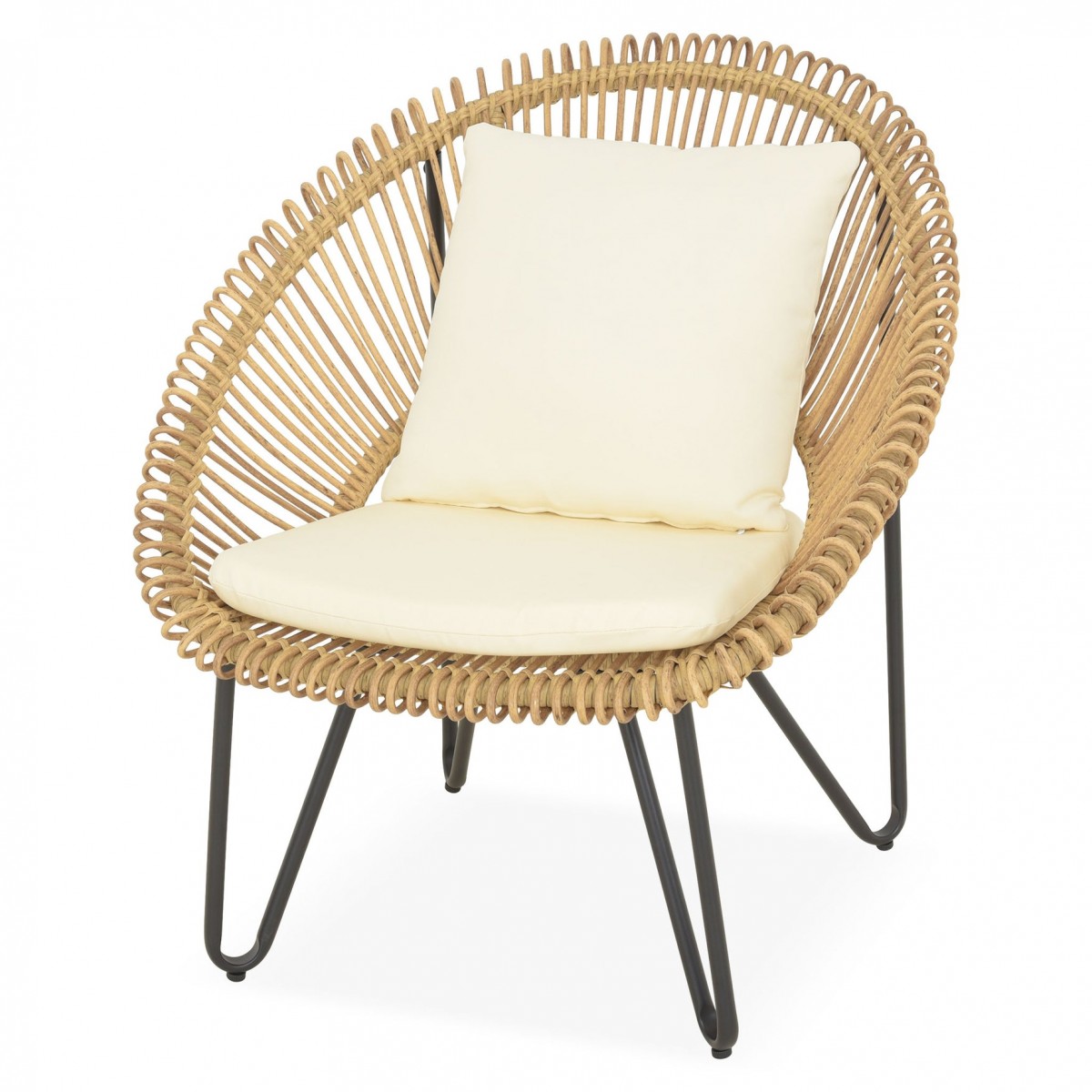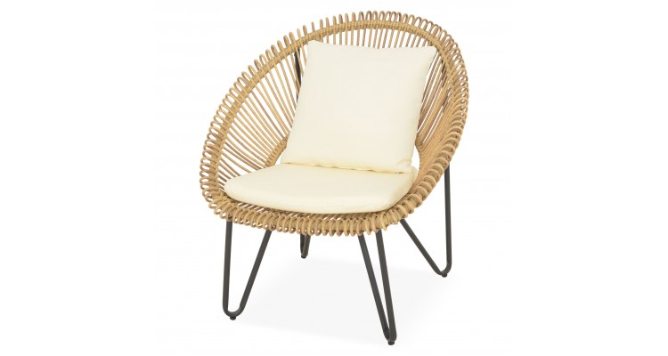 Structura solida din otel vopsit in camp electrostatic asigura stabilitate si rezistenta in utilizare. Impletitura din fibre sintetice tratate UV imita aspectul natural al ratanului, oferind un plus de stil si durabilitate, fiind potrivita pentru utilizare in aer liber pe termen lung.