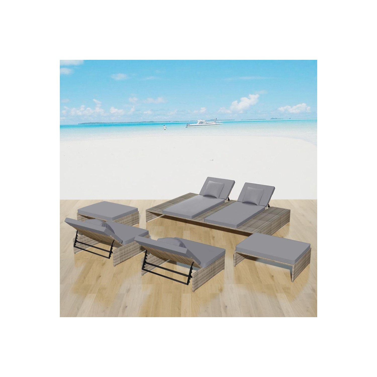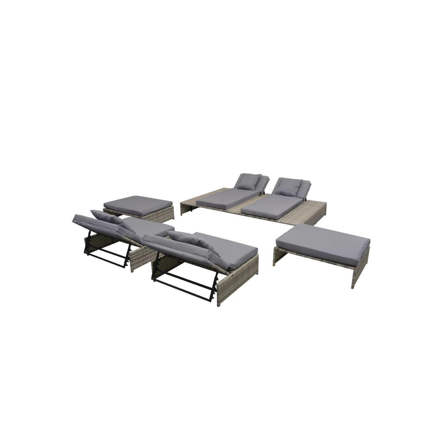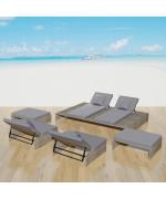 Setul lounge dispune de un cadru din oțel robust și durabil, acoperit cu pulbere. Spătarele patului dublu și canapelelor pot fi reglate pentru poziția cea mai confortabilă. Pernele și saltelele groase, detașabile, adaugă confort la ședere. Pe șezlongul mare pot încăpea 2 persoane și vă puteți ține băuturile, telefoanele, cărțile sau alte obiecte la îndemână, pe laturi. Setul este ușor și modular și poate fi așezat în diverse configurații pentru a se potrivi oricărui decor. Pachetul de livrare include 1 șezlong dublu, 2 canapele, 2 taburete, 6 saltele, 4 perne. Notă: Vă recomandăm să acoperiți setul de lounge pe timp de ploaie, zăpadă sau îngheț.