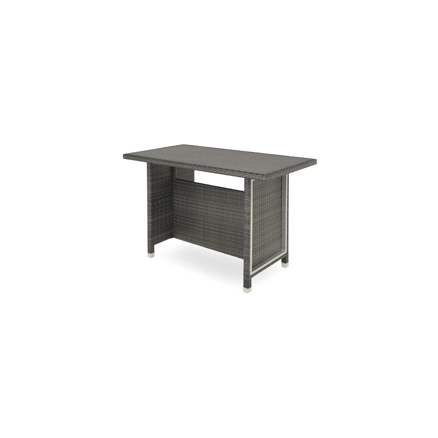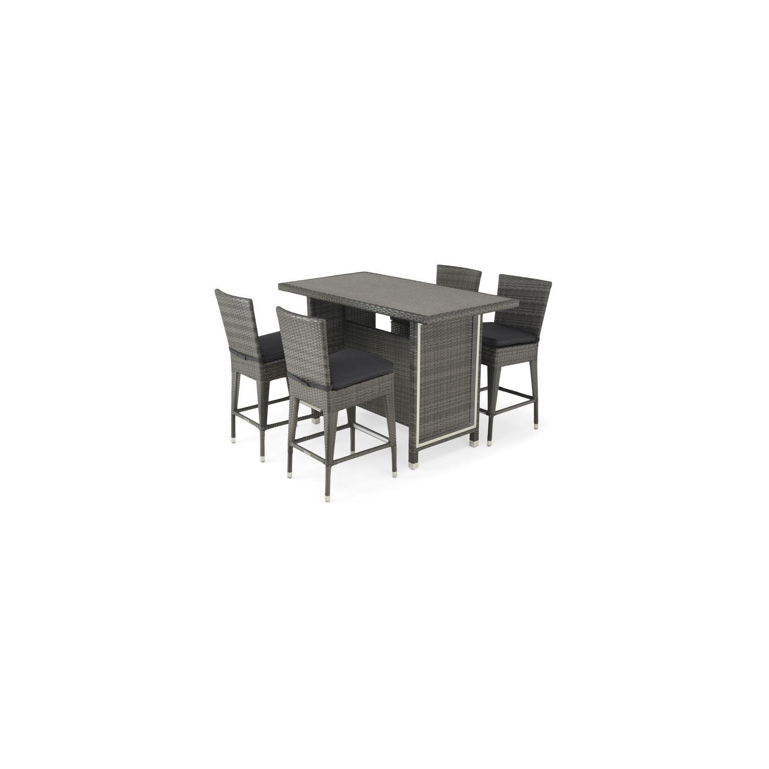 Realizat din structura de aluminiu vopsita in camp electrostatic si impletita cu fibre sintetice tratate UV. Include perne din tesatura Olefin rezistenta la umezeala si impotriva razelor UV. Topul mesei este realizata din sticla securizata cu aspect de piatra. Dimensiuni : Scaun bar - 44x54x98Hcm Masa bar - 140x75x103Hcm