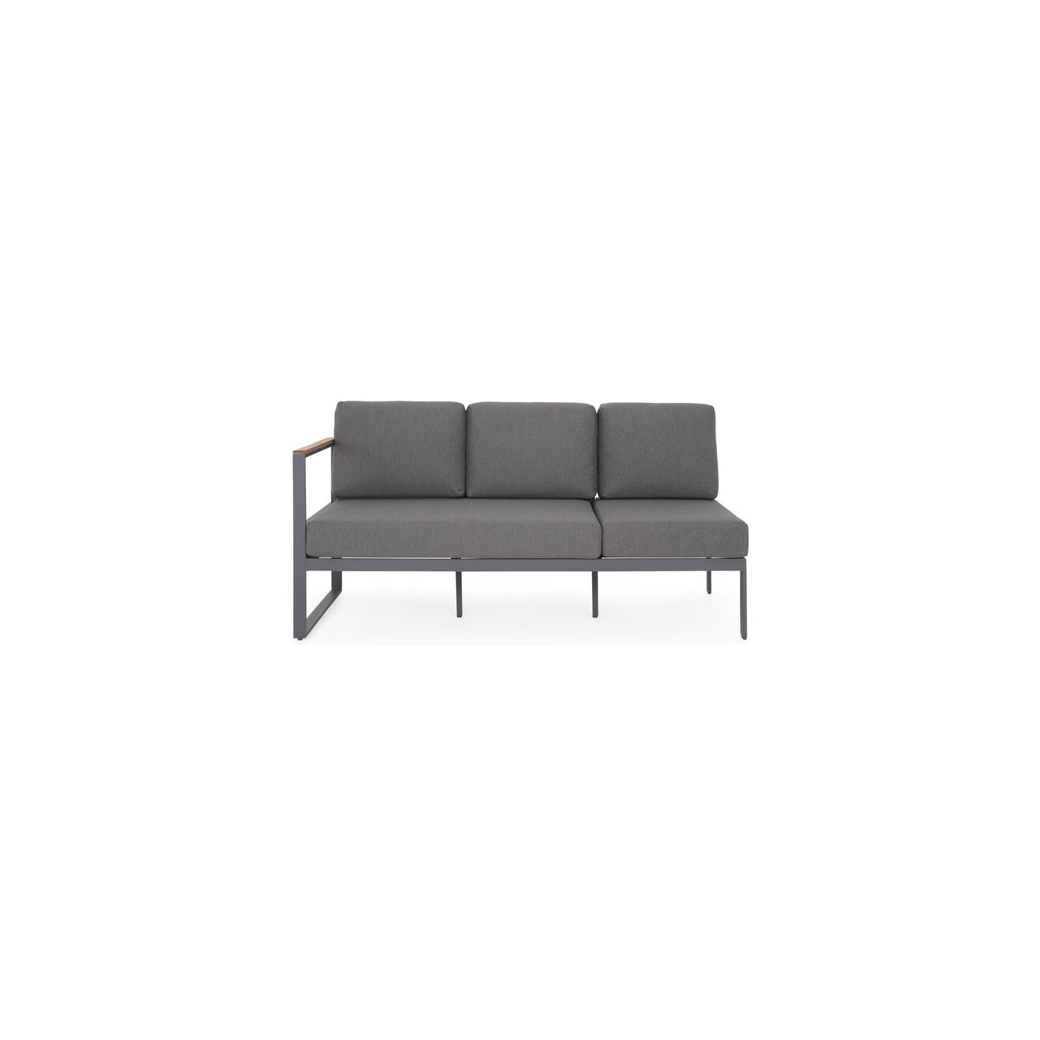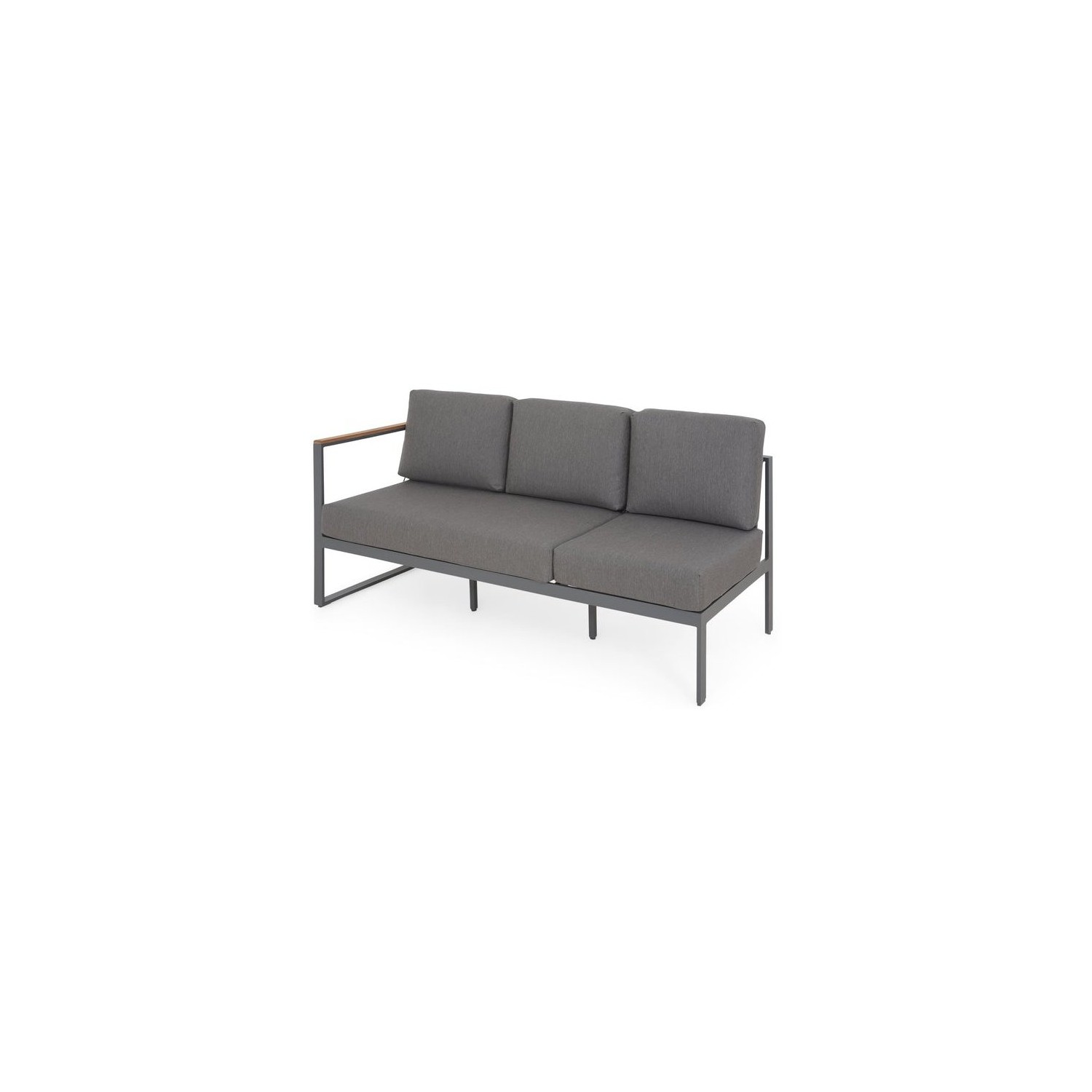 Piesele setului au structuri rezistente din aluminiu vopsit în câmp electrostatic, iar confortul este asigurat pe pernele din poliester. Canapea 3 locuri 1 brat - 185x77x90Hcm Canapea 3 locuri - 202x77x90Hcm Masa - 150x80x74Hcm