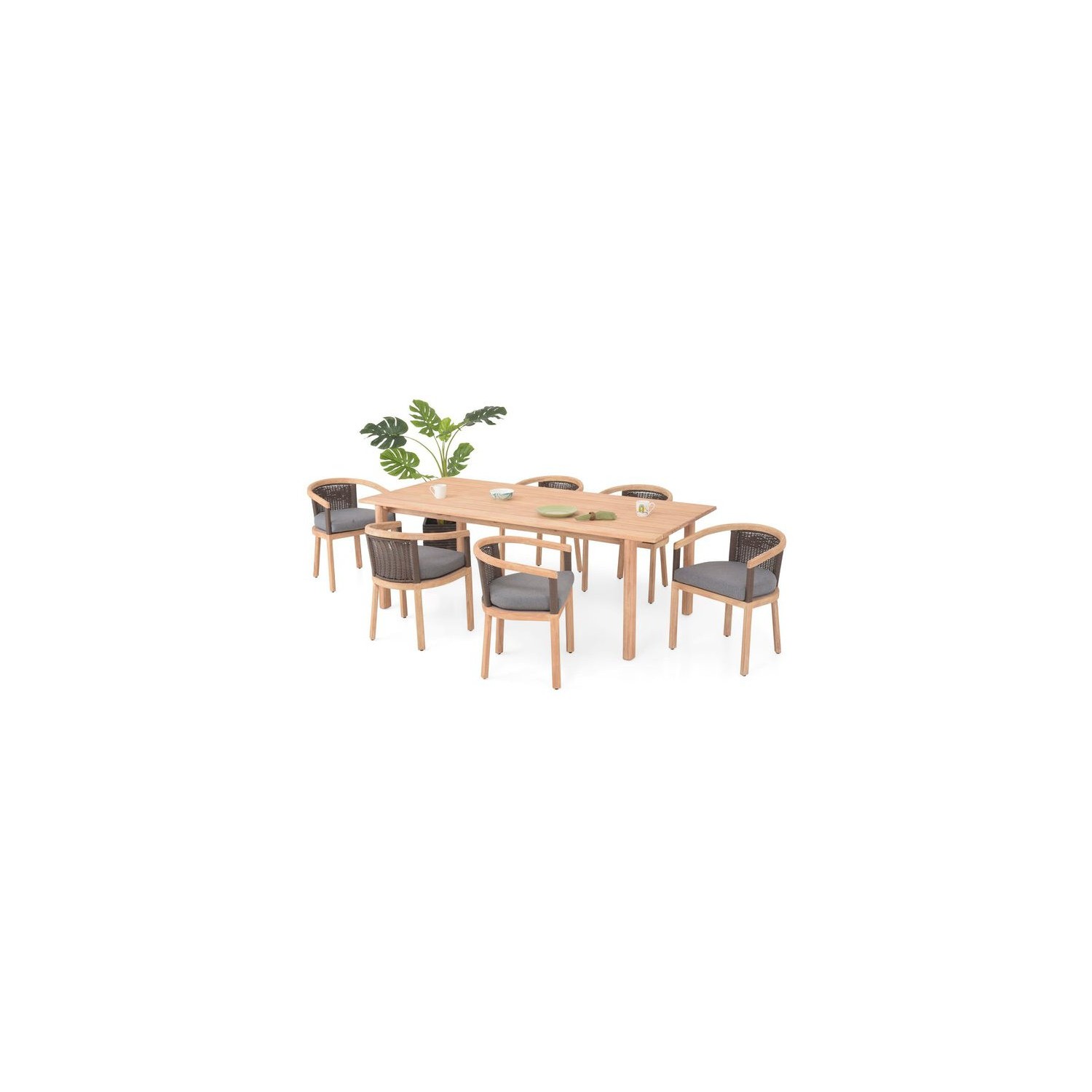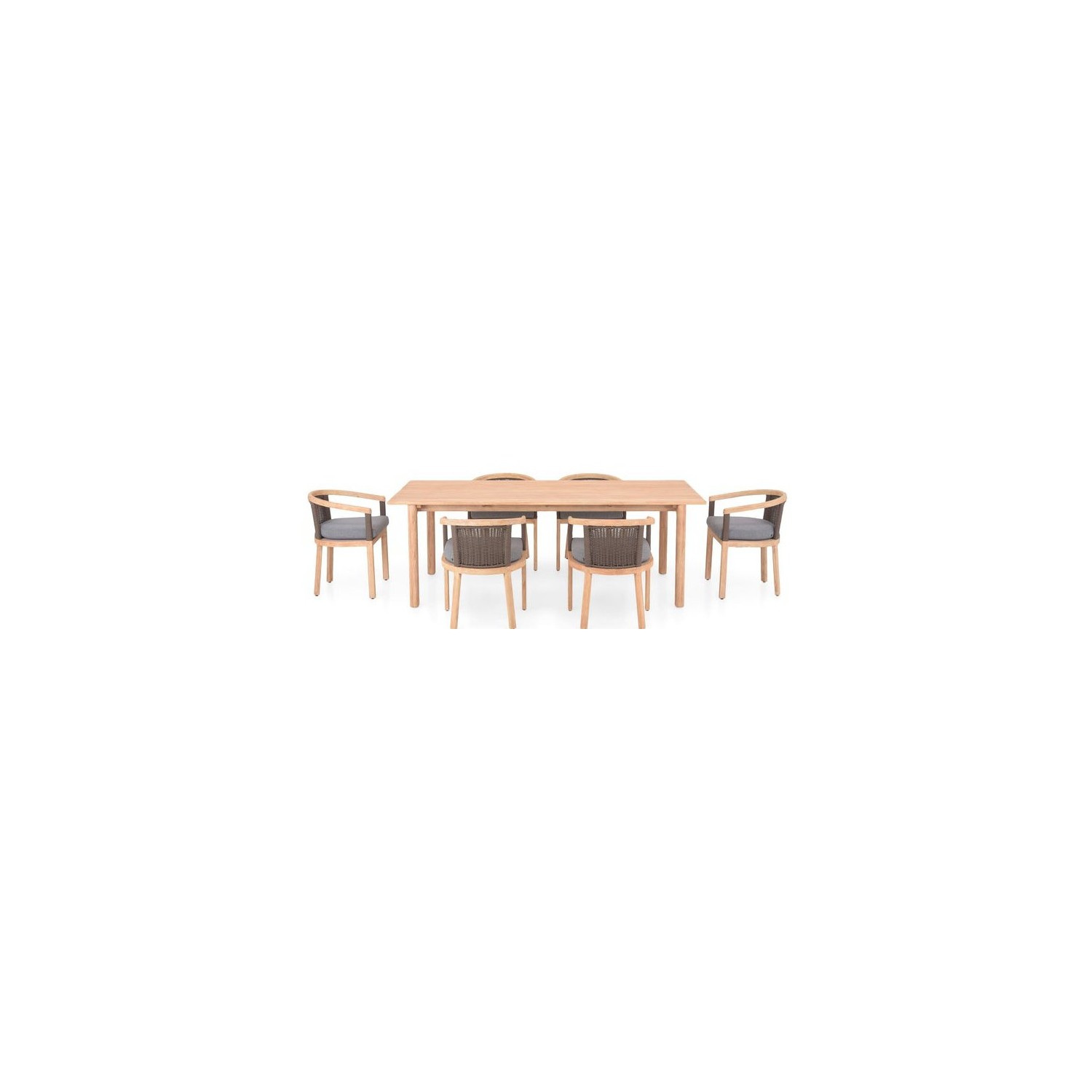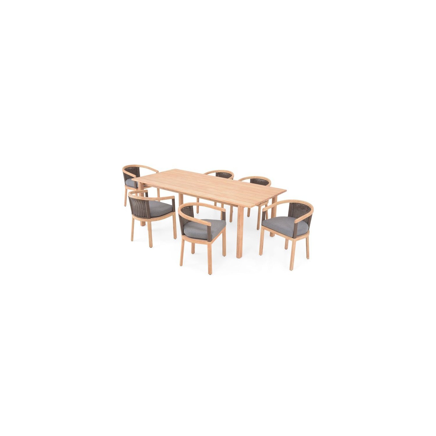 Realizat din lemn de teak certificat finisaj antichizat. Include elemente din aluminiu vopsit in camp electrostatic si impletit cu fibre sintetice tratate UV. Include perne din tesatura Olefin 20cm grosime cu protectie impotriva umezelii si a decolorarii.