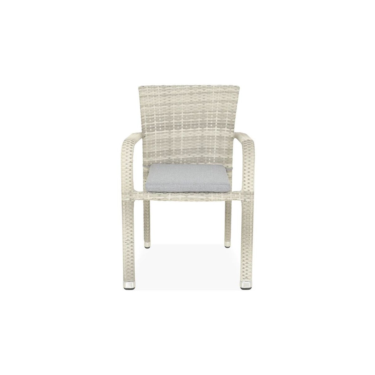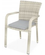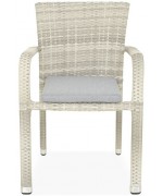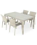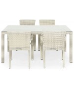 Scaunele, suprapozabile, si, de asemenea, masa, sunt realizate din structura solida de aluminiu, impletita cu fibre sintetice ce imita ratanul, cu protectie impotriva razelor UV.