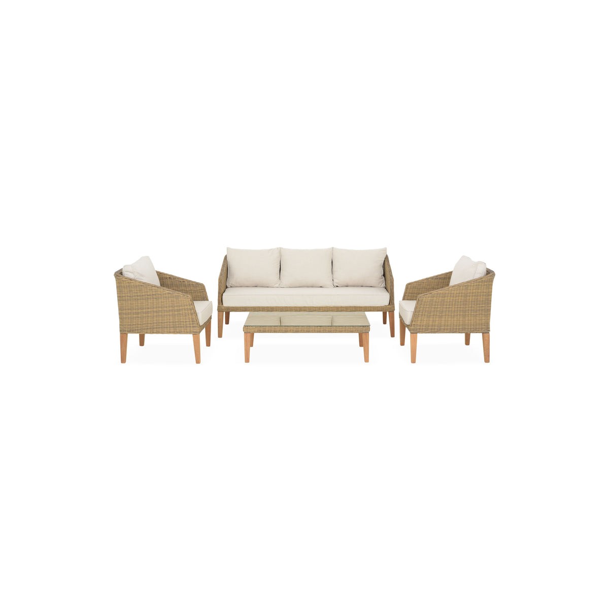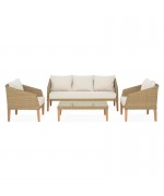 Set mobilier terasă/grădină, 2 fotolii, canapea și masă Debby. Integrați în spațiul vostru exterior un set de mobilier de terasă/grădină Dabby care să vă ofere spațiul necesar pentru a vă relaxa. Piesele setului sunt realizate din structură solidă de oțel, copsită în câmp electrostatic și împletită cu fibre sintetice ce imită ratanul, iar picioarele sunt fabricate din lemn masiv de acacia pentru un aspect luxuriant. Confortul deplin este oferit de pernele din poliuretan îmbrăcate cu poliester protejat împotriva umezelii.