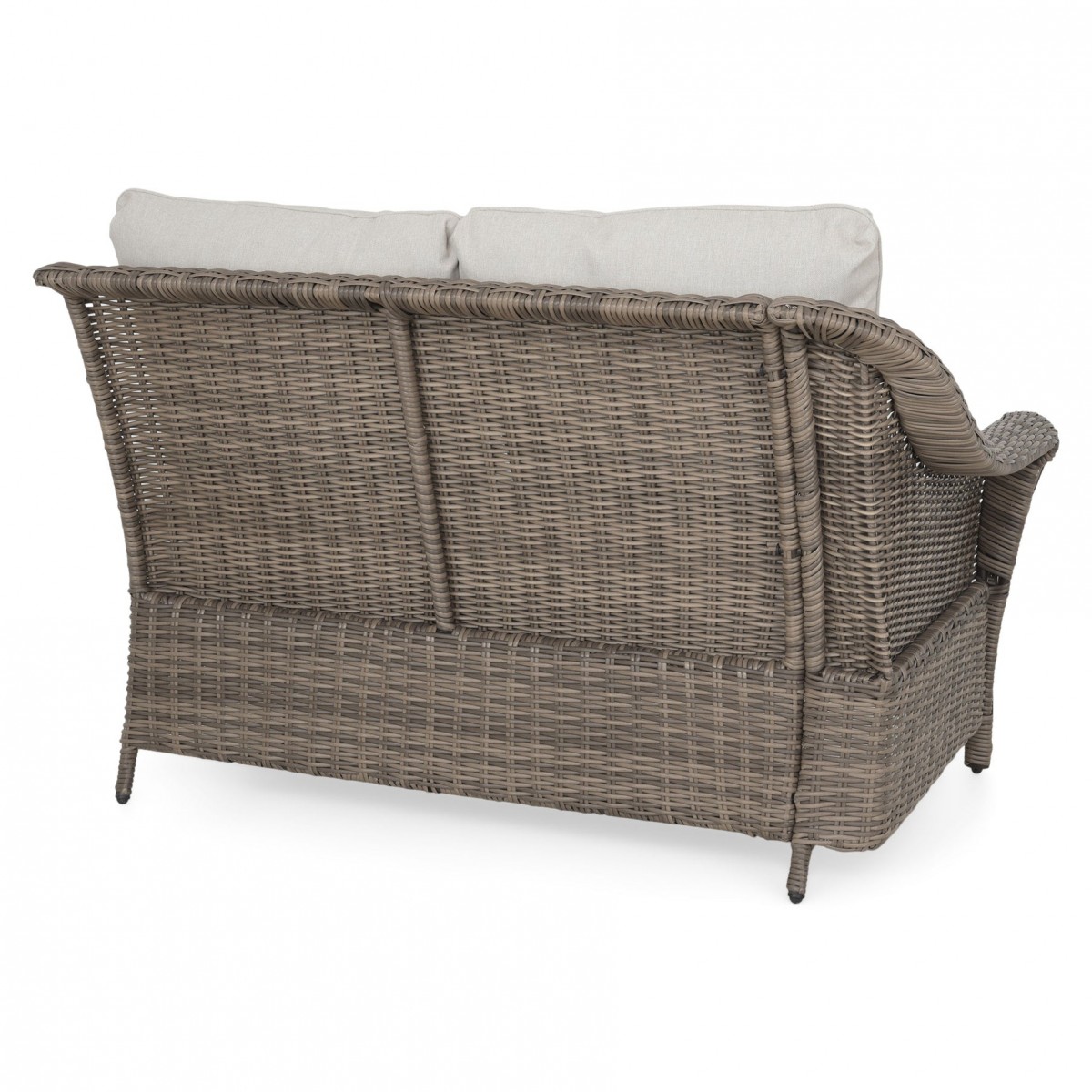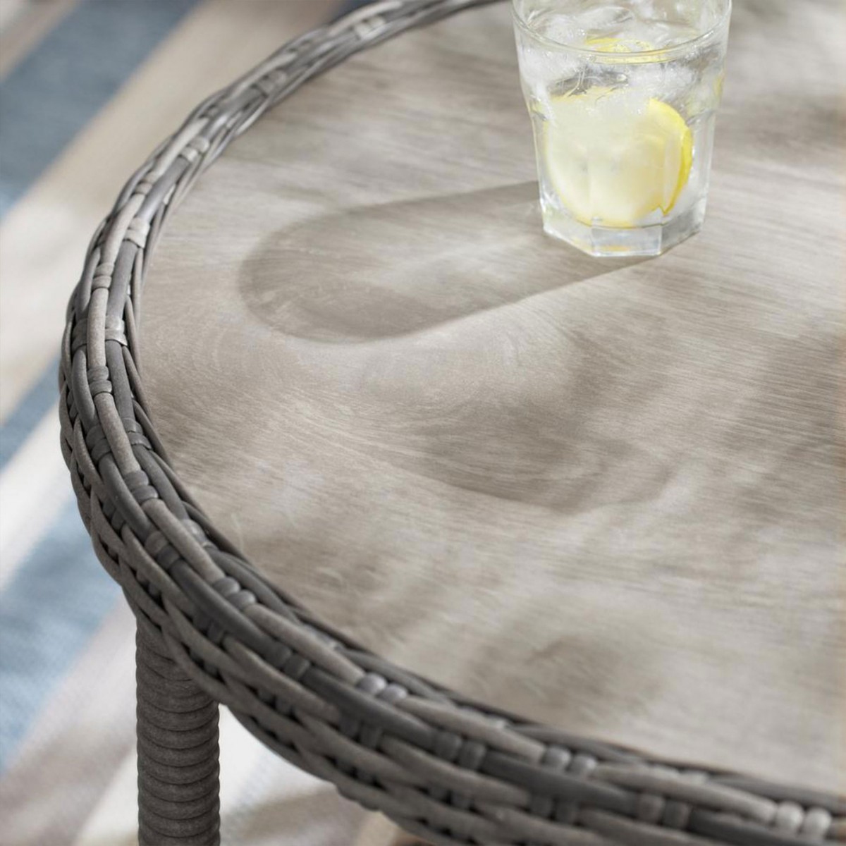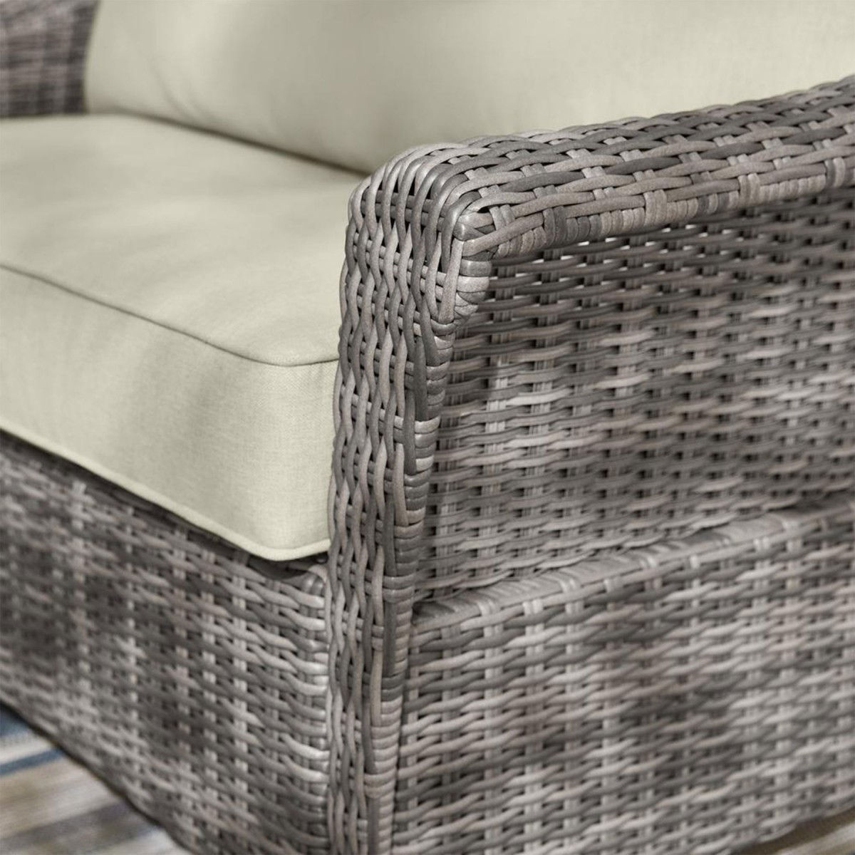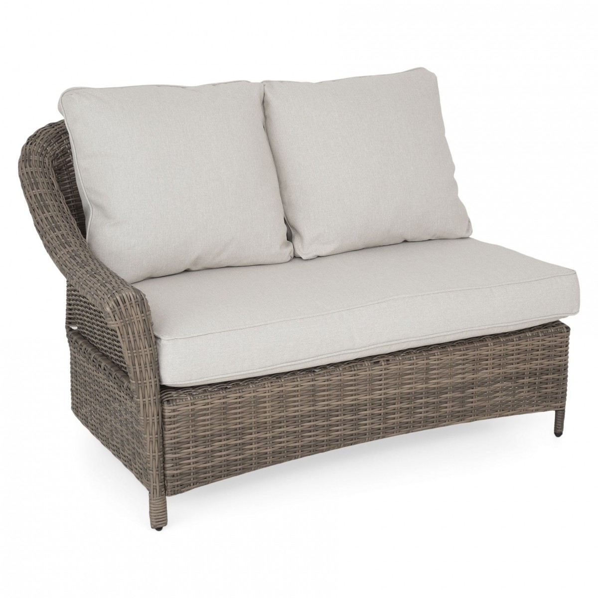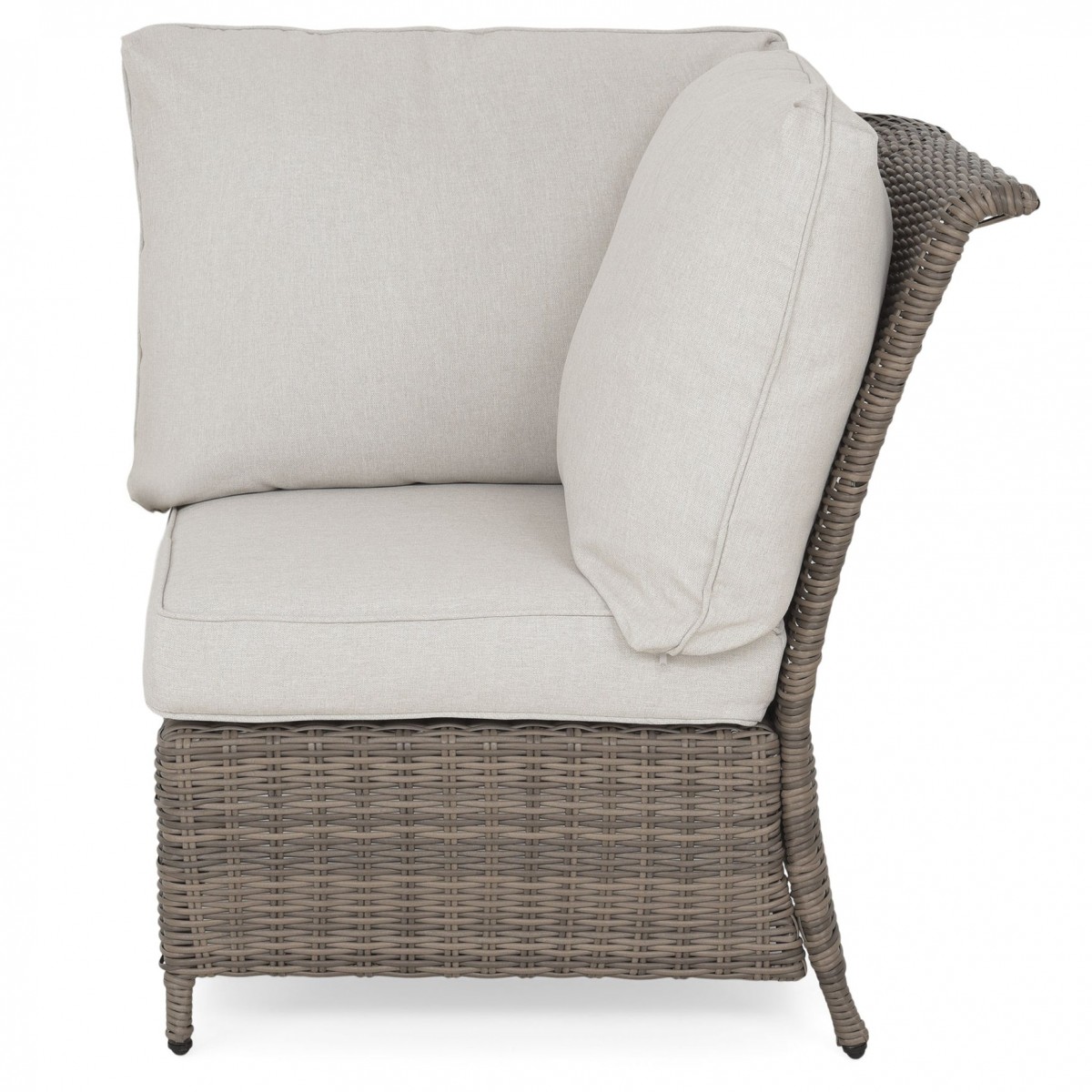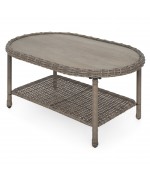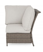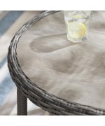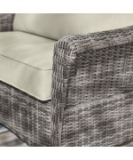 Realizat din structura solida de otel vopsita in camp electrostatic si impletita cu fibre sintetice tratate UV ce imita ratanul. Include perne din poliuretan imbracate in tesatura Olefin cu protectie impotriva umezelii si a decolorarii. Husele sunt prevazute cu fermoar pentru a fi mai usor de indepartat si curatat. Topul masutei este realizat din ceramica Dimensiuni: Masuta cafea : 94x60x45Hcm element colt : 83X83X86 canapea 2 locuri brat st/dr : 135X83X86 Dimensiuni coltar: L.220/220 x l.86 x H.98 cm