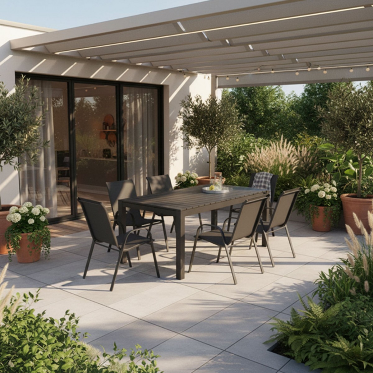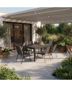 Masa extensibila ofera flexibilitate maxima, adaptandu-se rapid de la mesele in familie la grupuri mai mari de invitati. Blatul cu aspect de lemn (polywood) pastreaza estetica naturala, dar elimina intretinerea complicata a lemnului clasic. Scaunele cu sezut si spatar din textilina sunt confortabile, respirabile si ideale pentru zilele calde, chiar si in conditii de utilizare zilnica.