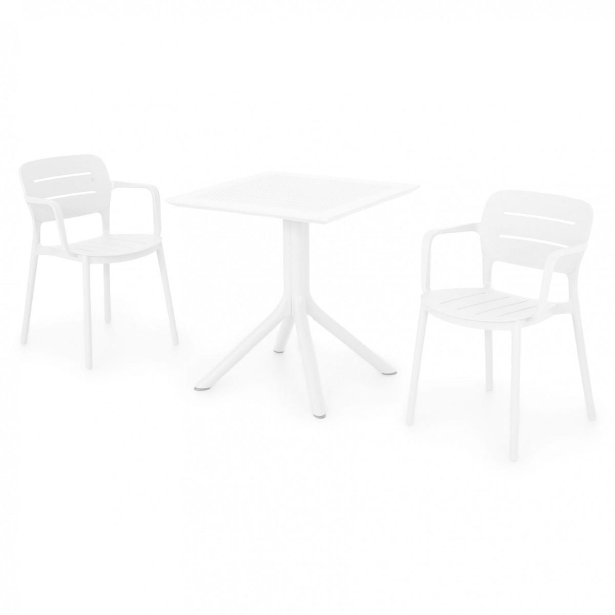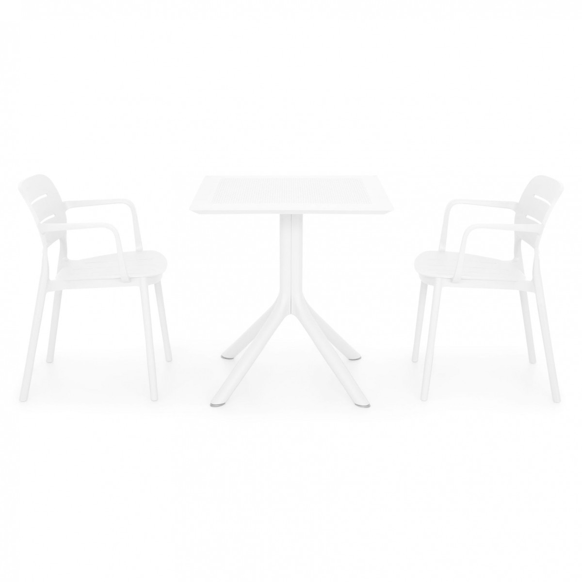 Masa: masa de cafea fixa, L.70 x l.70 x H.75 cm, grosime blat 1 cm, structura cu picioare, blat din polipropilena, protectie UV