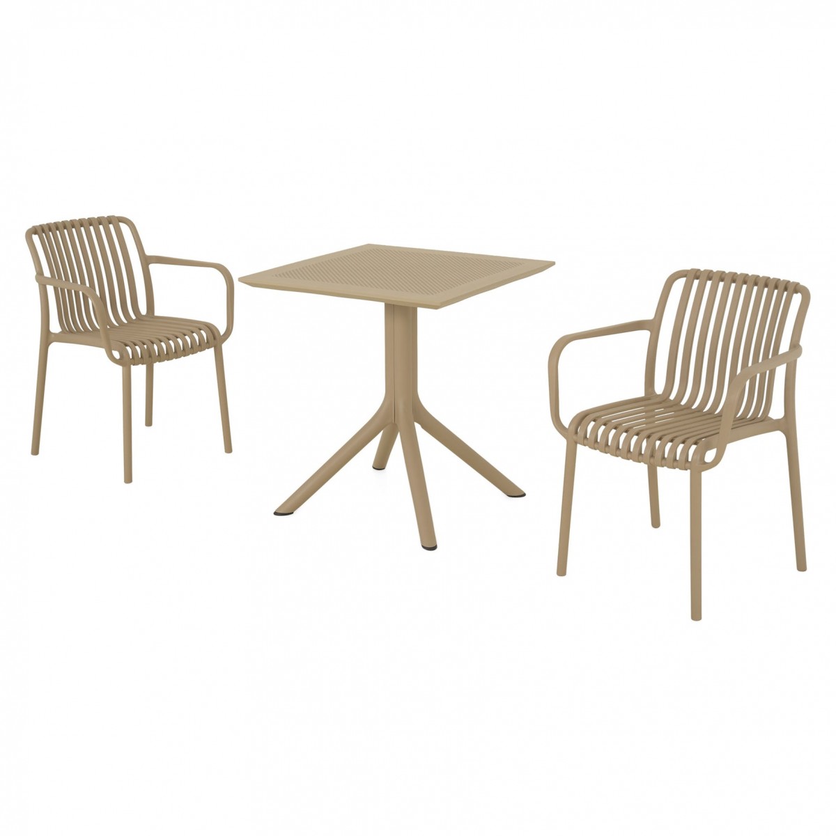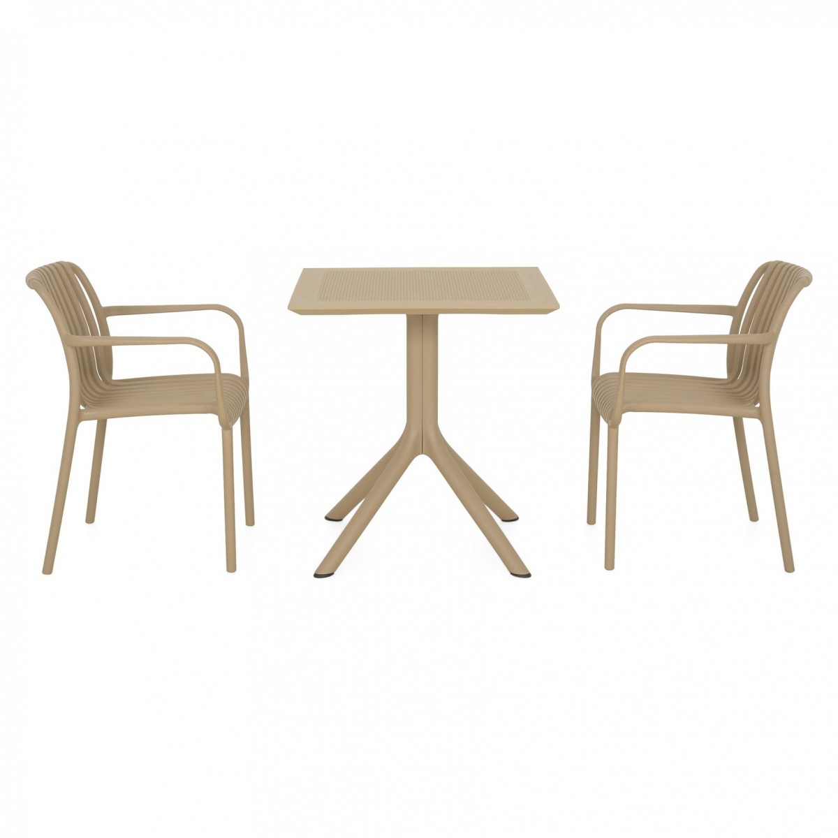 Masa: masa de cafea fixa, L.70 x l.70 x H.75 cm, structura cu picioare, blat din polipropilena, protectie UV