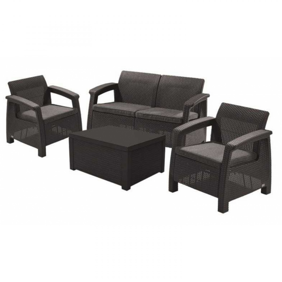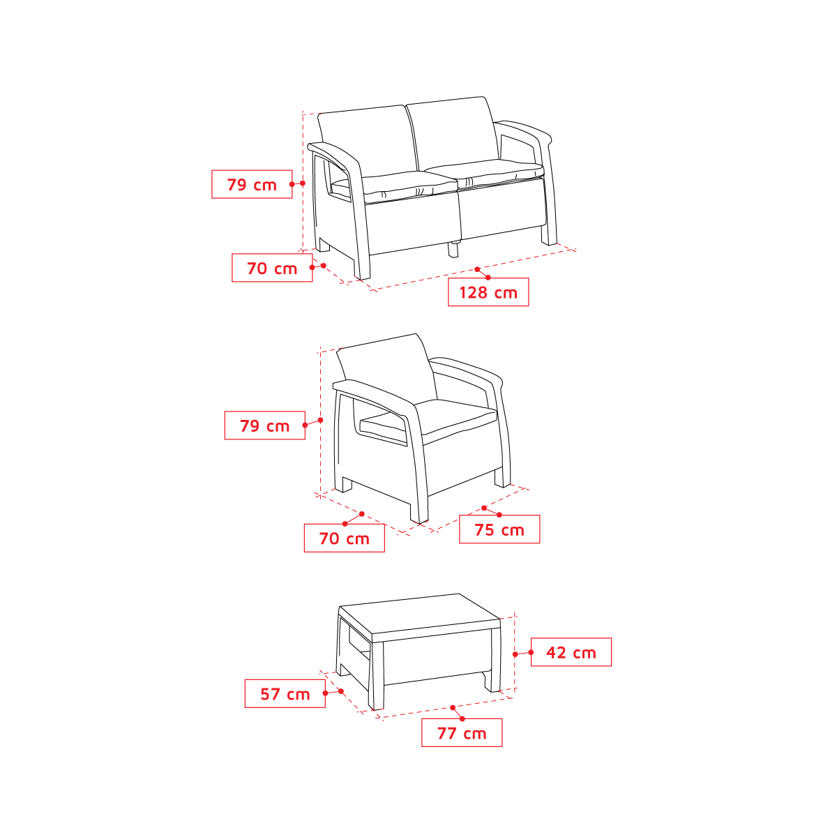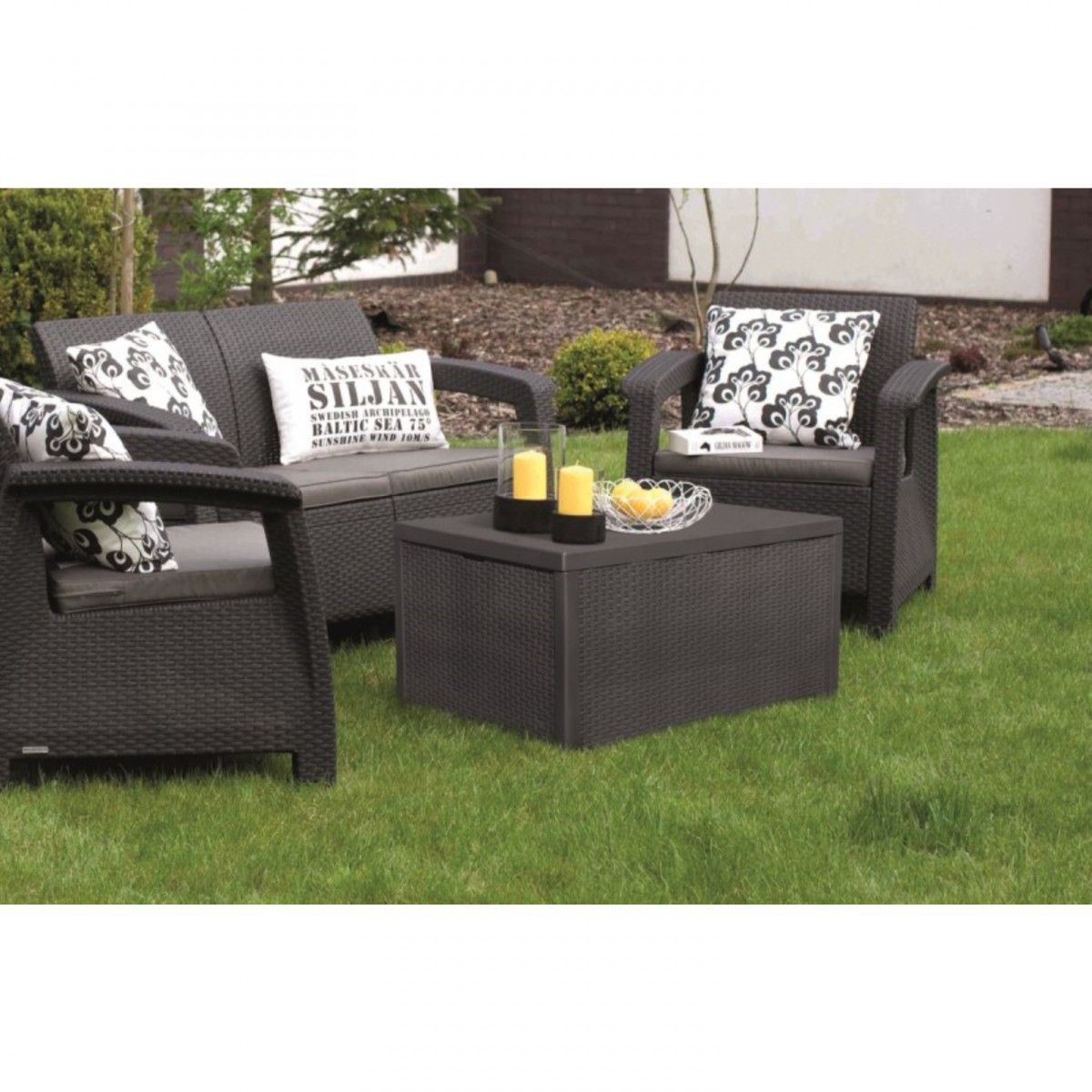 Setul de mobilier Keter Corfu II Duo Box este o alegere practica si eleganta pentru relaxare in aer liber. Format dintr-o canapea pentru doua persoane, doua fotolii si o masa multifunctionala, acest set imbina designul modern cu utilitatea. Textura inspirata din ratan natural ofera un aspect placut, iar masa poate fi folosita si ca spatiu de depozitare pentru perne sau accesorii.