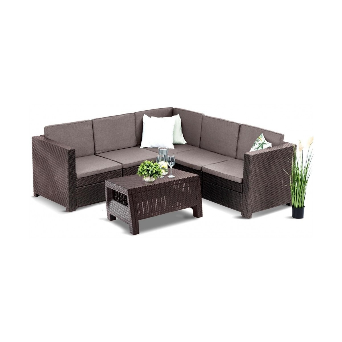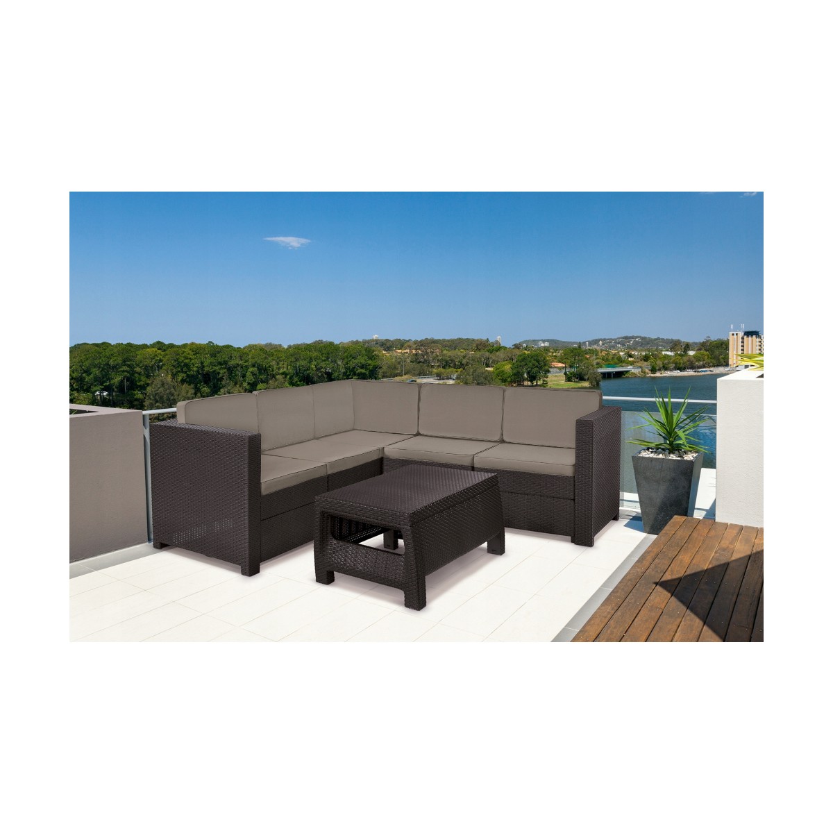 Setul de mobilier Provence este alegerea ideala pentru amenajarea unui spatiu de relaxare elegant si confortabil, fie in gradina, pe terasa sau in zone comerciale. Format dintr-un coltar spatios pentru 5 persoane si o masuta de cafea, acest set impresioneaza prin designul modern si textura ce imita ratanul natural. Structura usoara si modulara permite adaptarea configuratiei in functie de spatiu.
