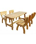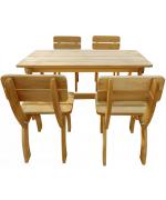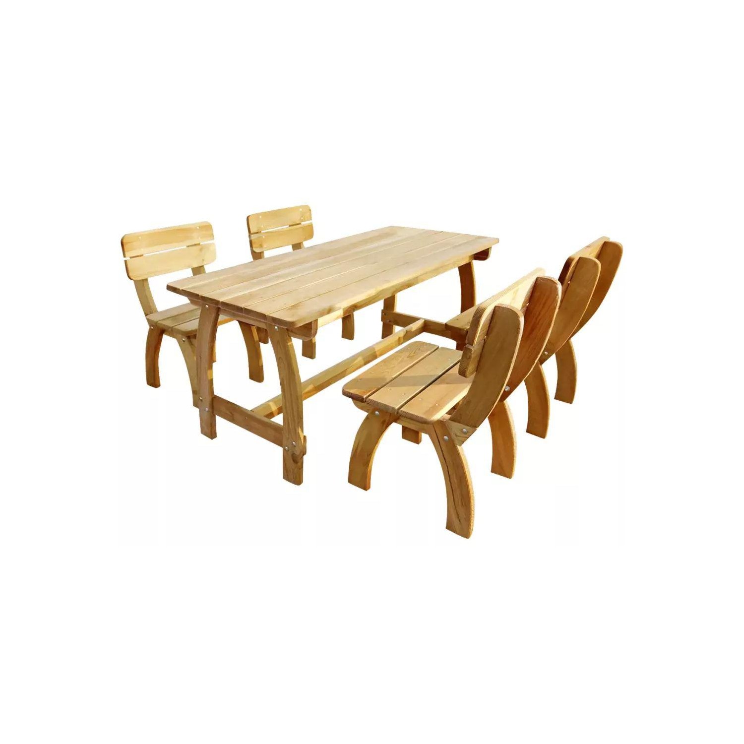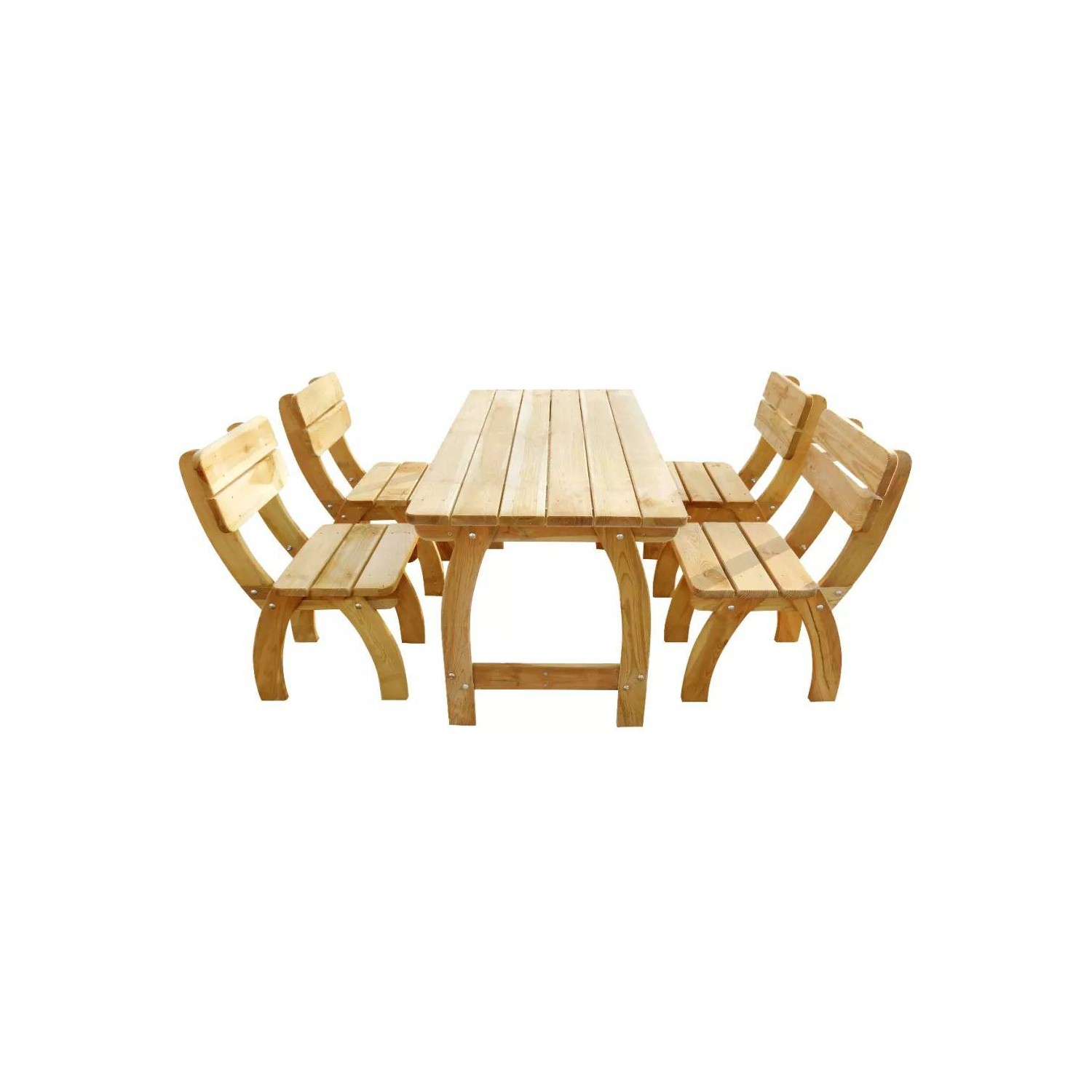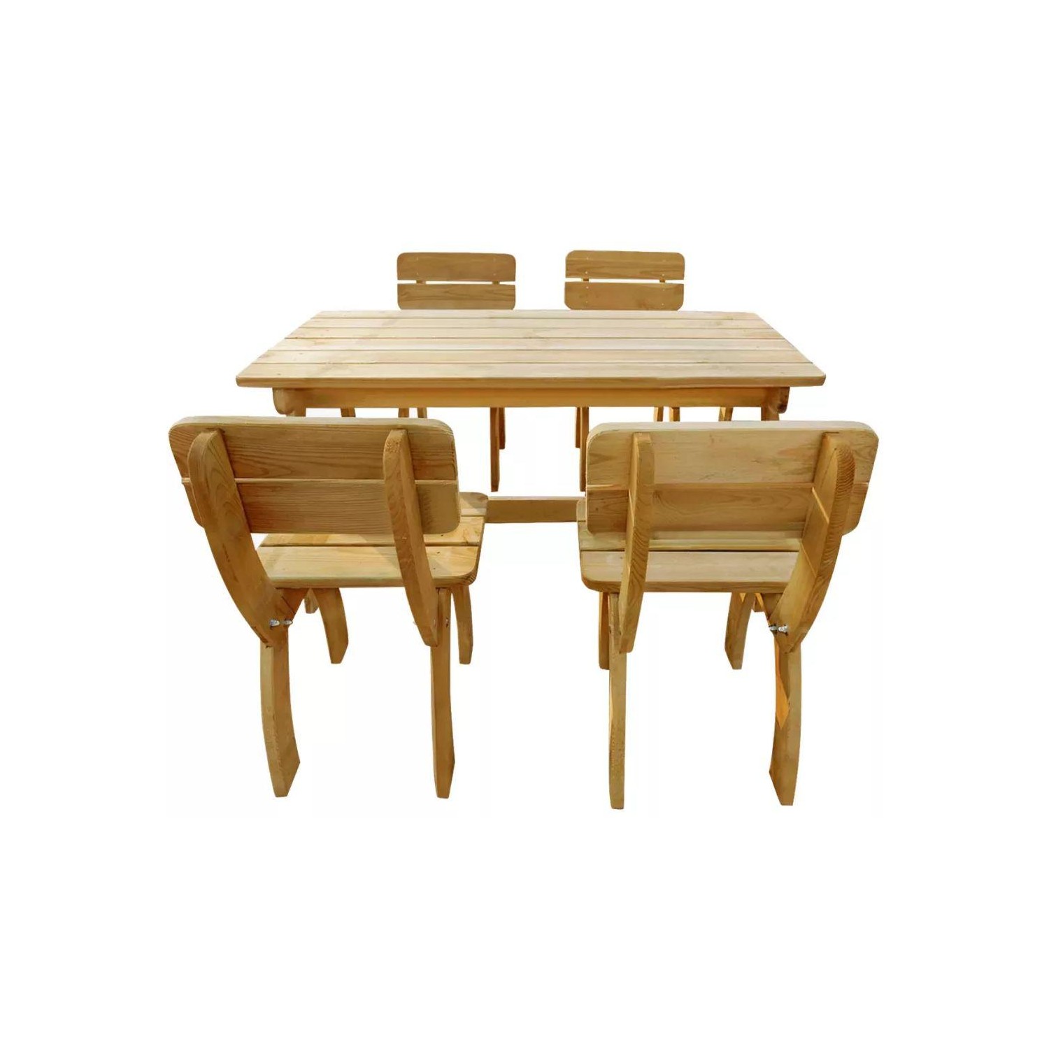 Acest set elegant de mobilier pentru gradina va aduce putin din frumusetea stilului rustic in gradina ta, sau in orice alt spatiu exterior. Realizat din lemn de pin verde de calitate superioara, acest set de mobilier pentru gradina este foarte robust, durabil si rezistent la putrezire. Livrarea include 4 scaune si 1 masa. Setul este foarte usor de asamblat. Va rugam sa retineti ca lemnul este un produs natural si poate prezenta imperfectiuni.