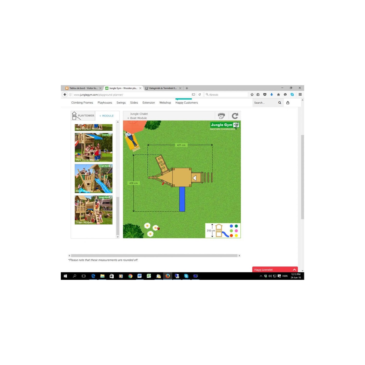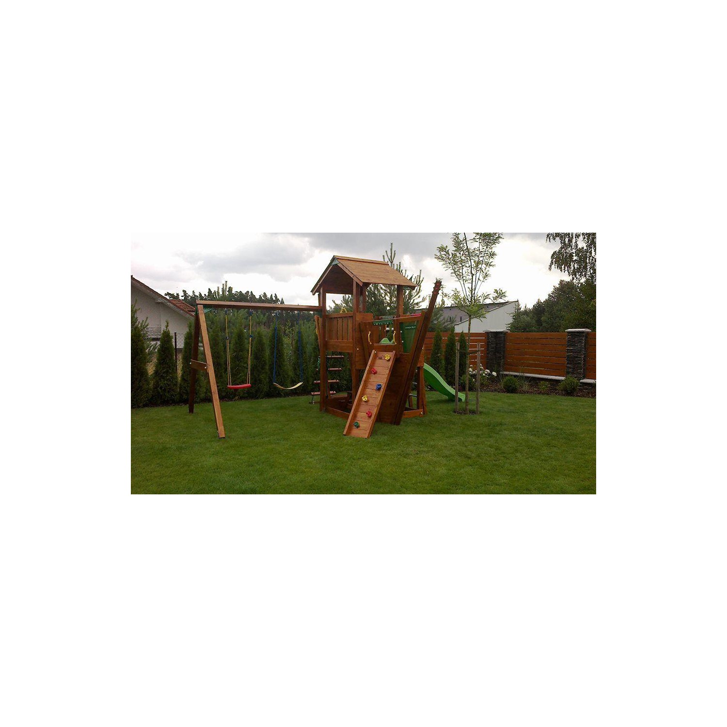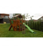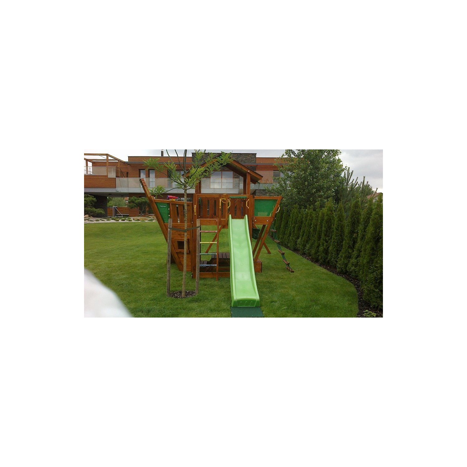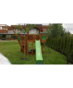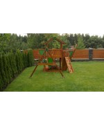 Loc de joaca de uz rezidential. Acest complex de joaca contine urmatoarele turnuri/module/accesorii: 1 buc Turn CHALET- cu tobogan 2,9 m lungime, culoare la alegere: rosu, galben, albastru, verde,verde mar, mov 1 buc Modul BOAT 1 buc Modul SWING EXTRA cu leagane inclus (cu 2 sezuturi simple) Complexul din poza este vopsit. Pretul complexului NU INCLUDE vopseaua/cost manopera/serviciu vopsire. Informație importantă: Materialul lemnos este un material viu, care este în contact permanent și direct cu schimbările de temperatură, cu umezeală, respectiv cu razele solare. Datorită contactului permanent cu condițiile meteo din exterior, pot apare unele crăpături, fiind un fenomen natural. Acest lucru nu afectează în nici un fel durata de viață a produselor. Suprafata:421cm x 660cm Inaltime:310 cm Materialul acoperisului: lemn Materia prima material lemnos brad impregnat Se recomanda pavarea zonei de siguranta, model recomandat: covor cauciuc de 4 cm grosime Varsta recomandata: copii cu varsta intre 3-14 ani Jungle Chalet (PDF) Boat Module (PDF)