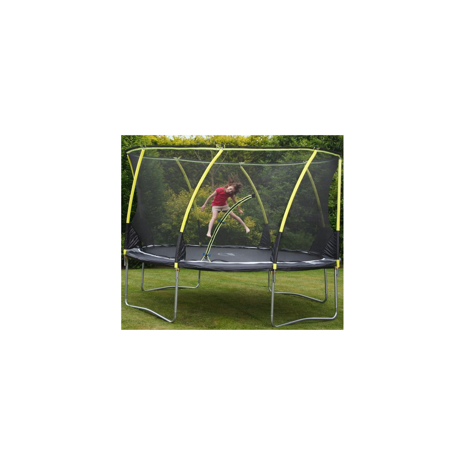 Protectia arcurilor este prinsa pe exterior, astfel incat copii sa nu poata sari peste arcuri. Astfel, trambulina este mult mai sigura.