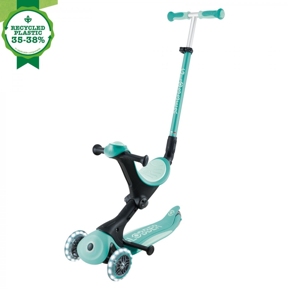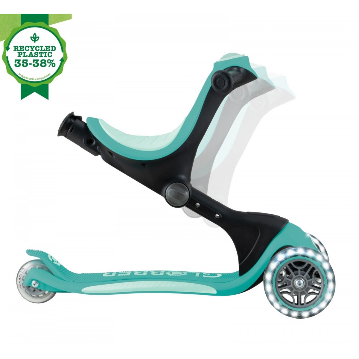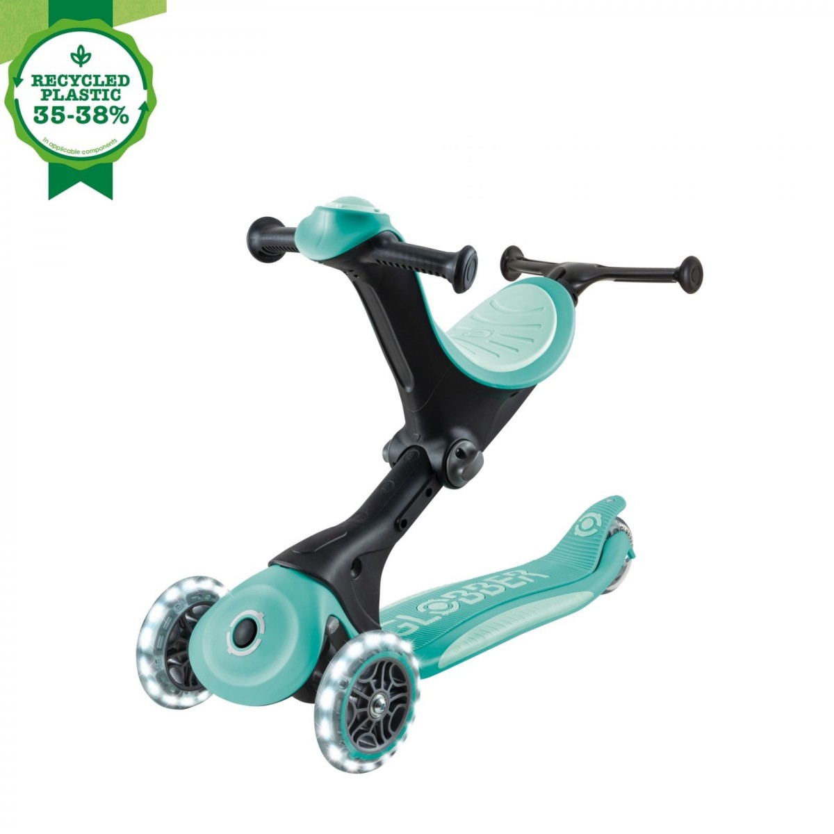 Trotineta Globber 4 in 1 Deluxe Lights, ECOLOGIC este fabricat cu 35 pana la 38% din plastic Global Recycled Standard (GRS) și paie de grâu bio-sursă*.