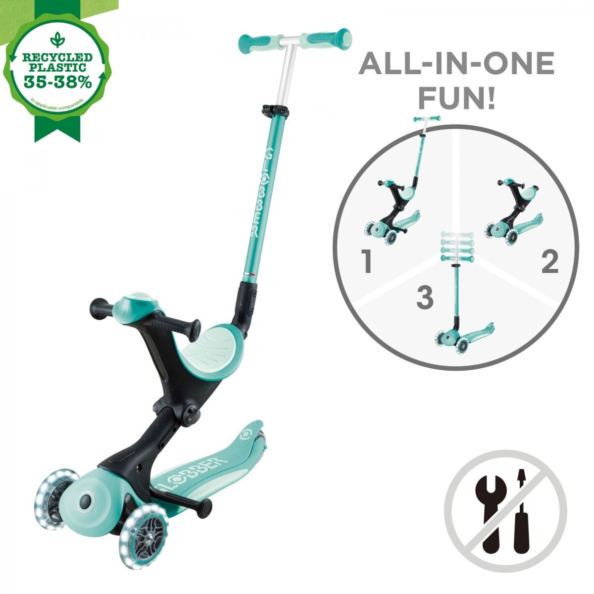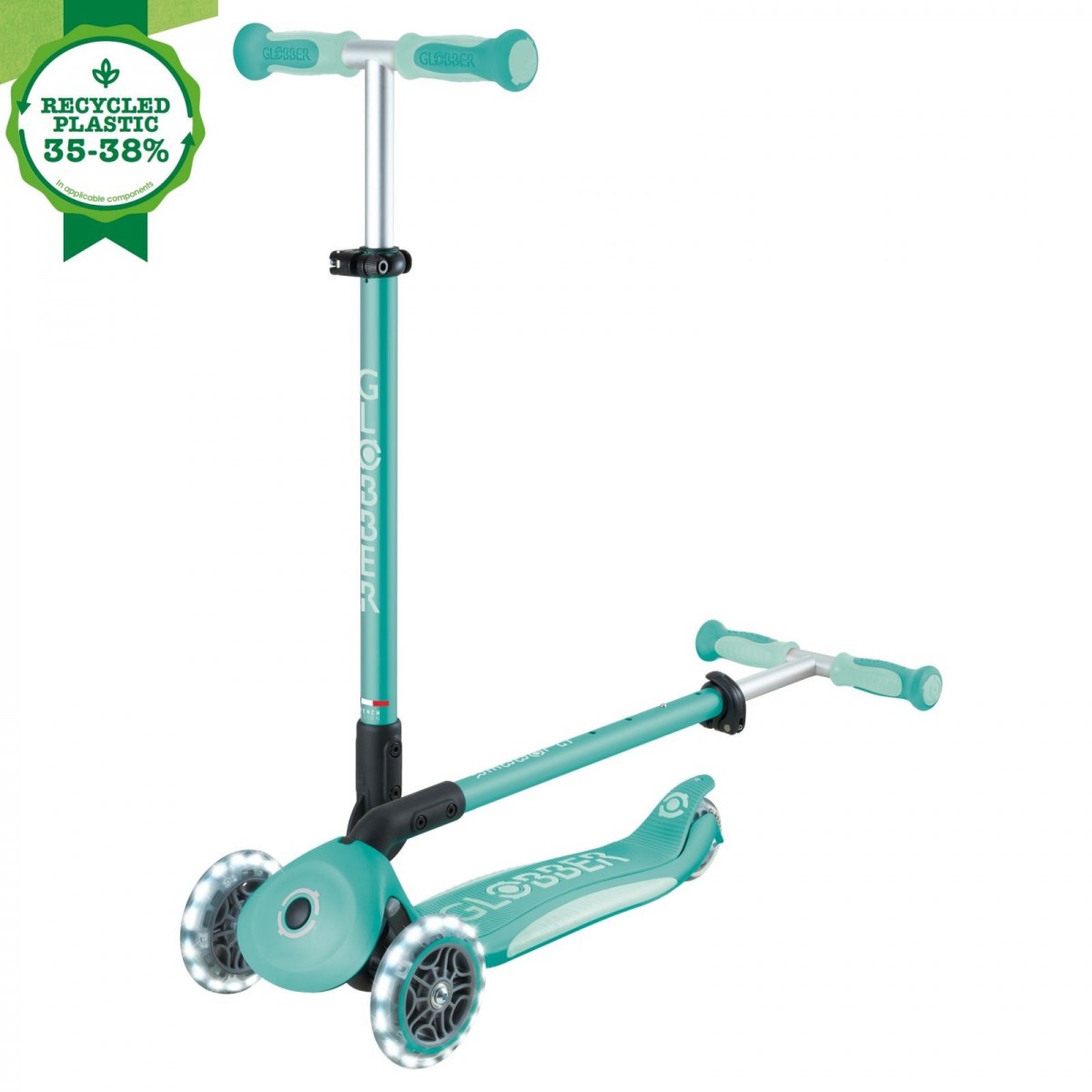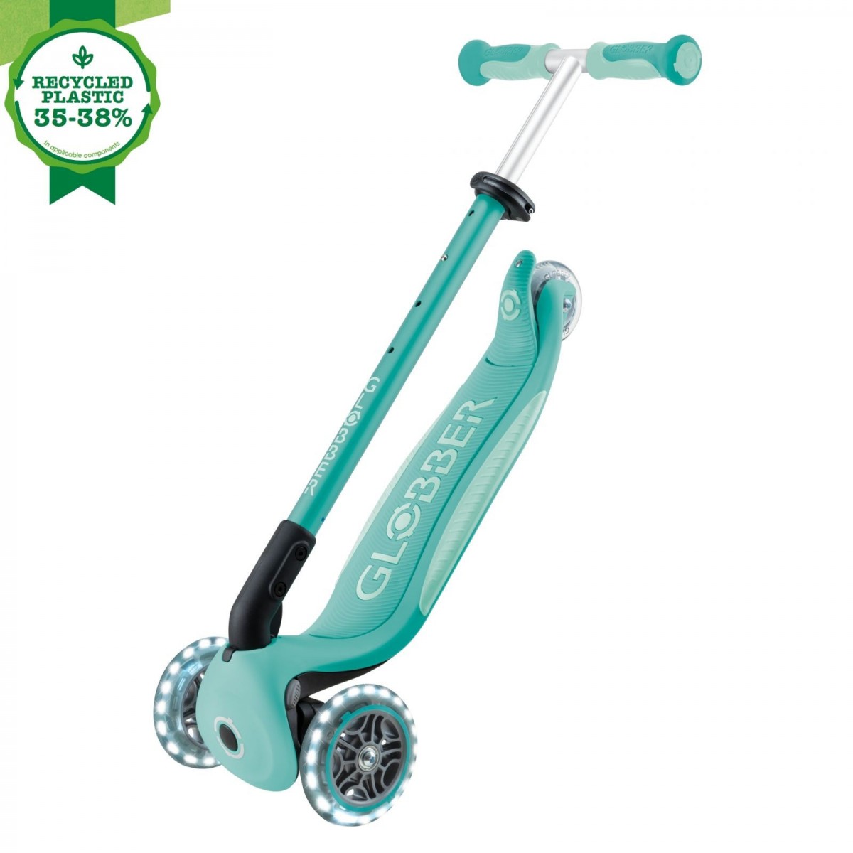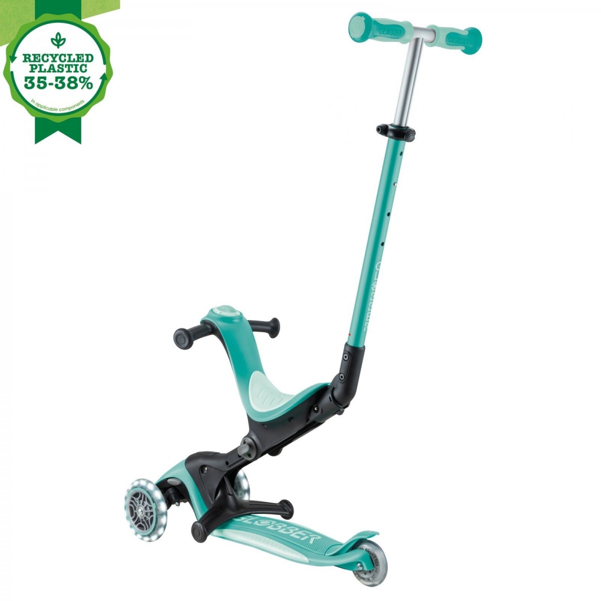 Trotineta Globber 4 in 1 Deluxe Lights, ECOLOGIC este fabricat cu 35 pana la 38% din plastic Global Recycled Standard (GRS) și paie de grâu bio-sursă*.