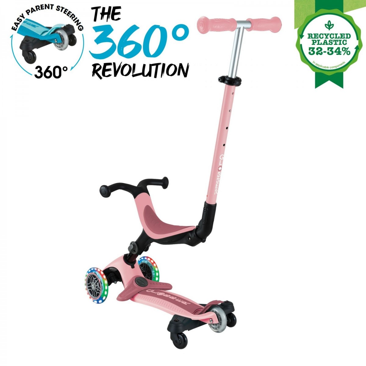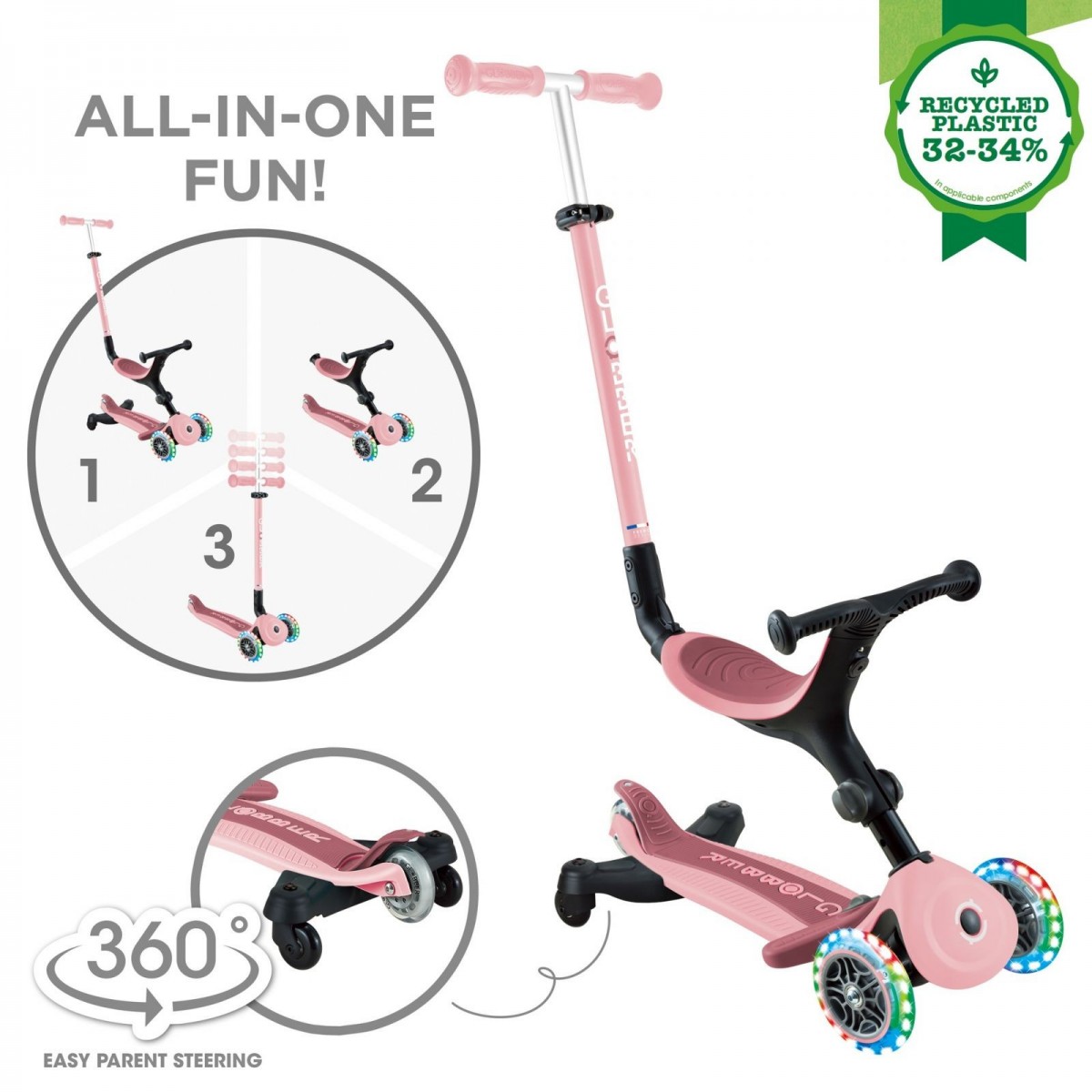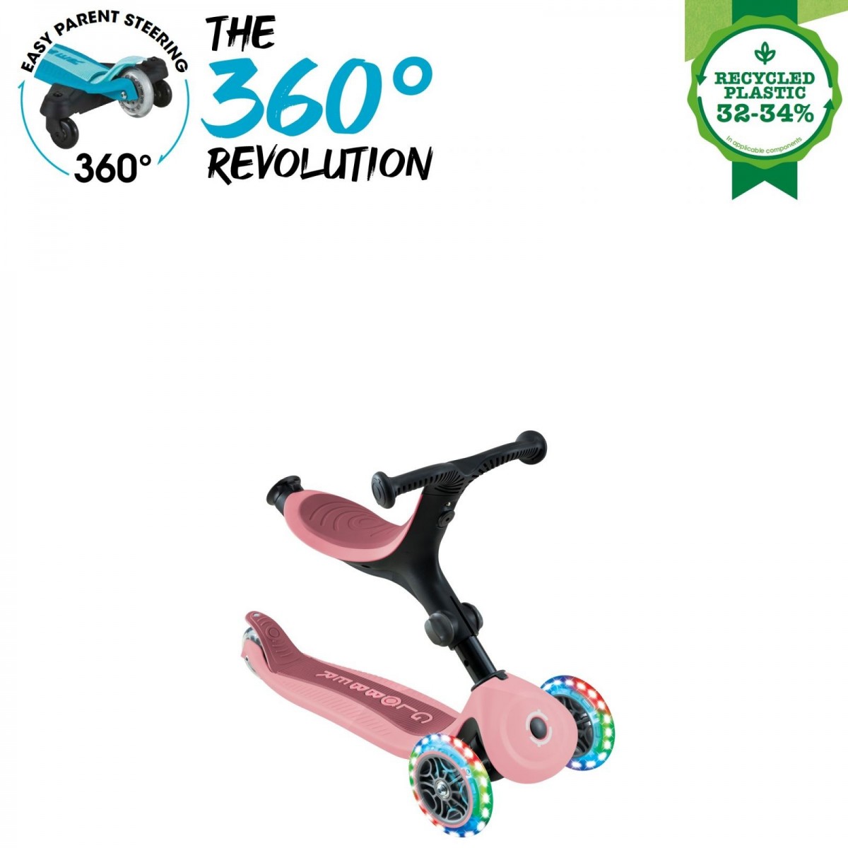 GO•UP ACTIVE LIGHTS 360 este un scuter pliabil cu 3 roți care luminează, cu scaun pentru copii, care se transformă în bicicleta ride-on, și trotineta pentru copii mici. Modurile ride-on si bicicleta de mers sunt concepute pentru copiii mici cu vârste între 15-36 luni, iar modul de trotineta este recomandat pentru copiii cu vârste între 3-9+ ani.